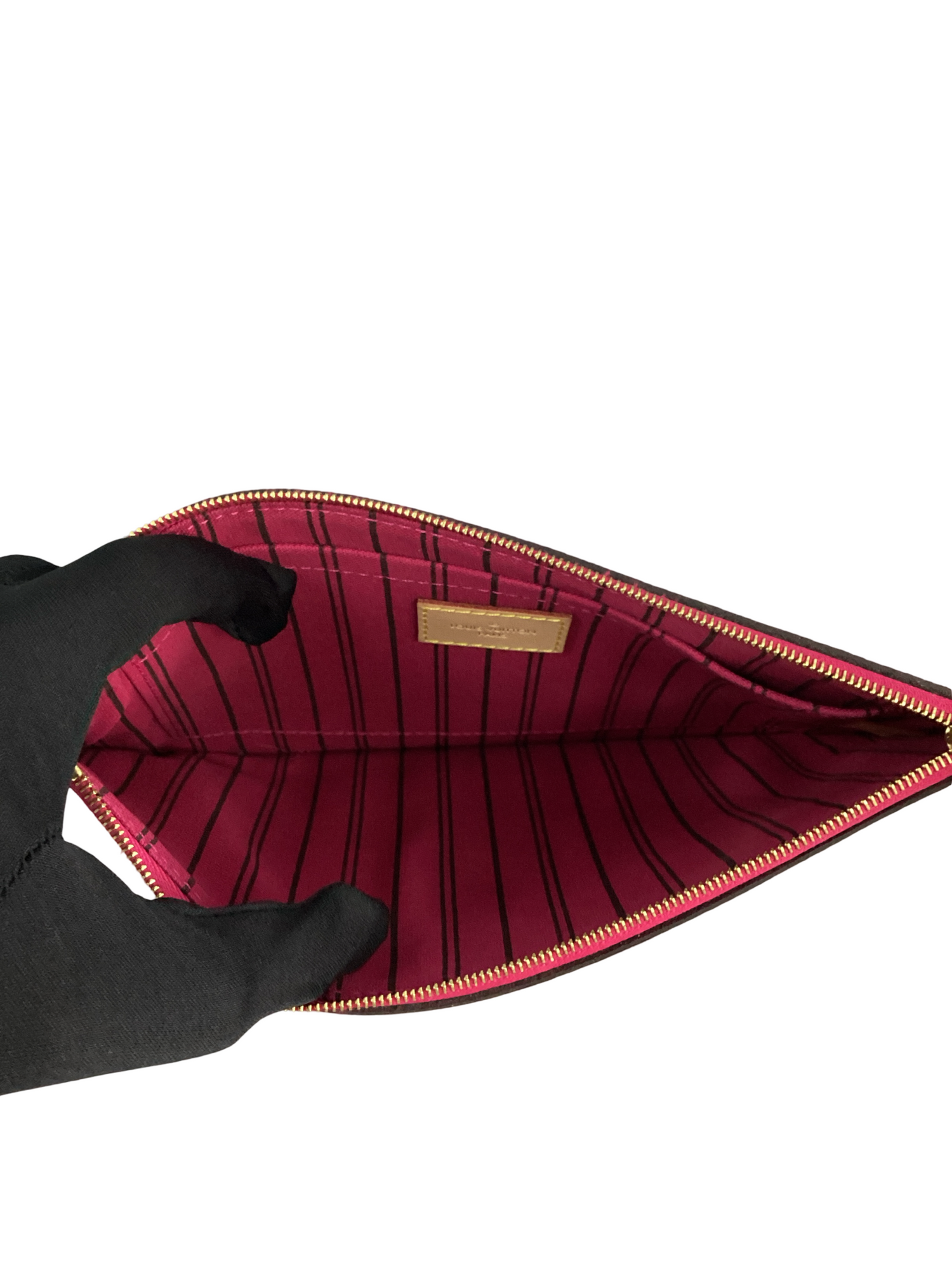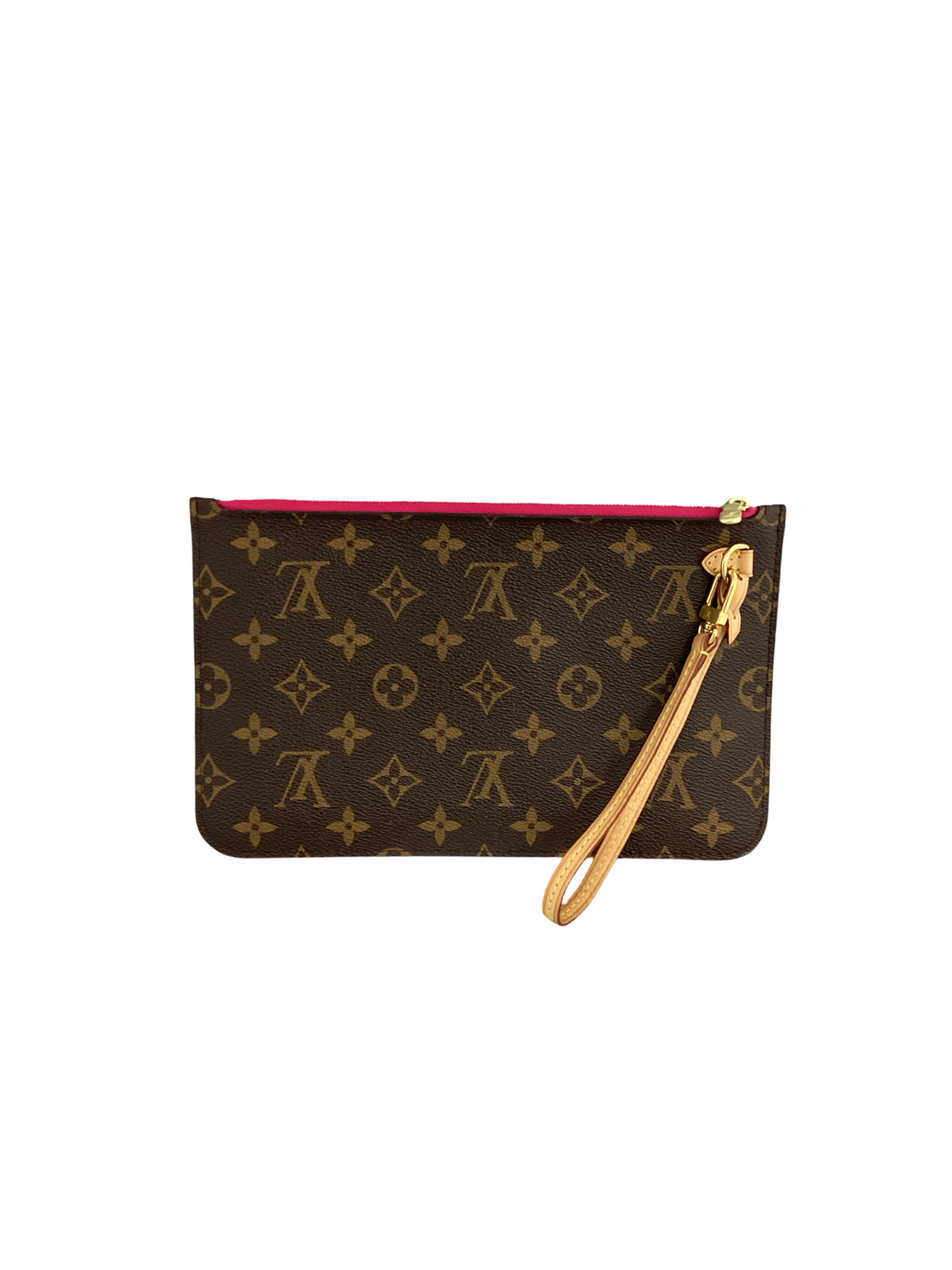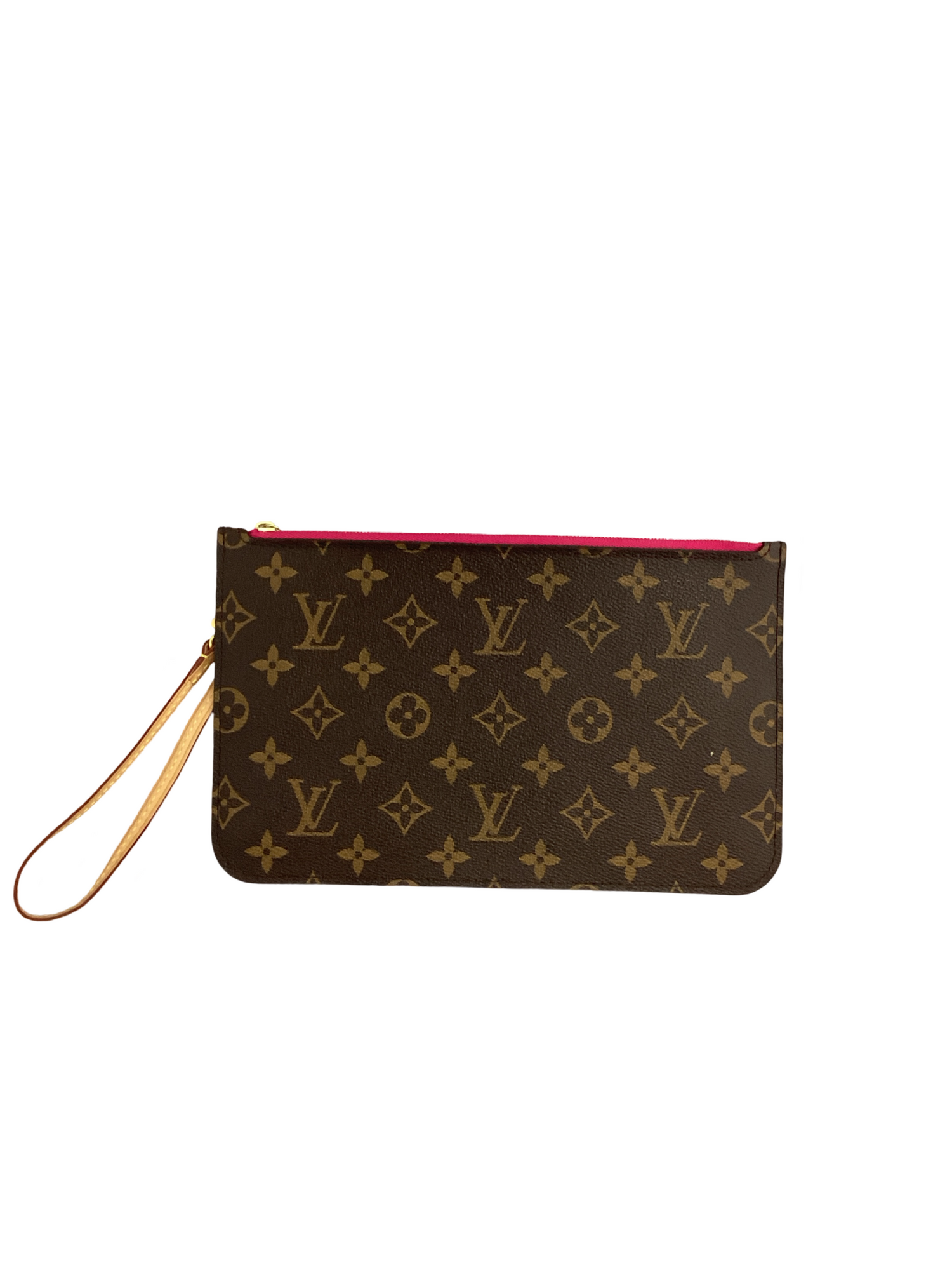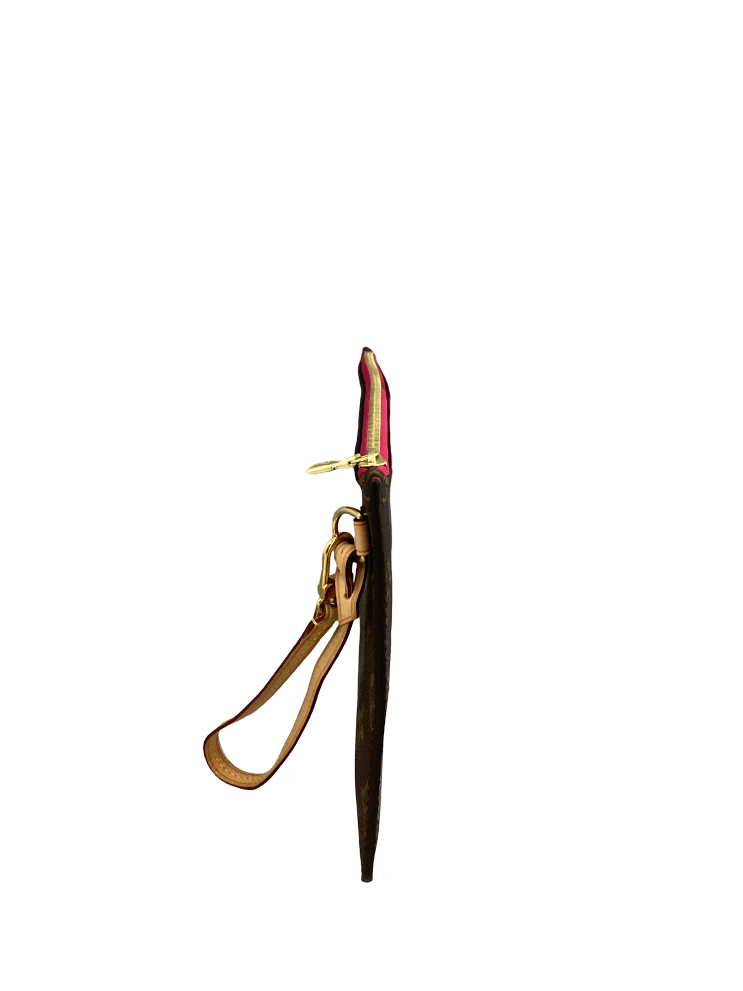 Louis Vuitton Monogram Neverfull Pouch with gold-toned hardware, brown monogram leather canvas, clutch style handle wrist strap, and zip top closure. Interior features a dark pink canvas lining with a slip pocket.