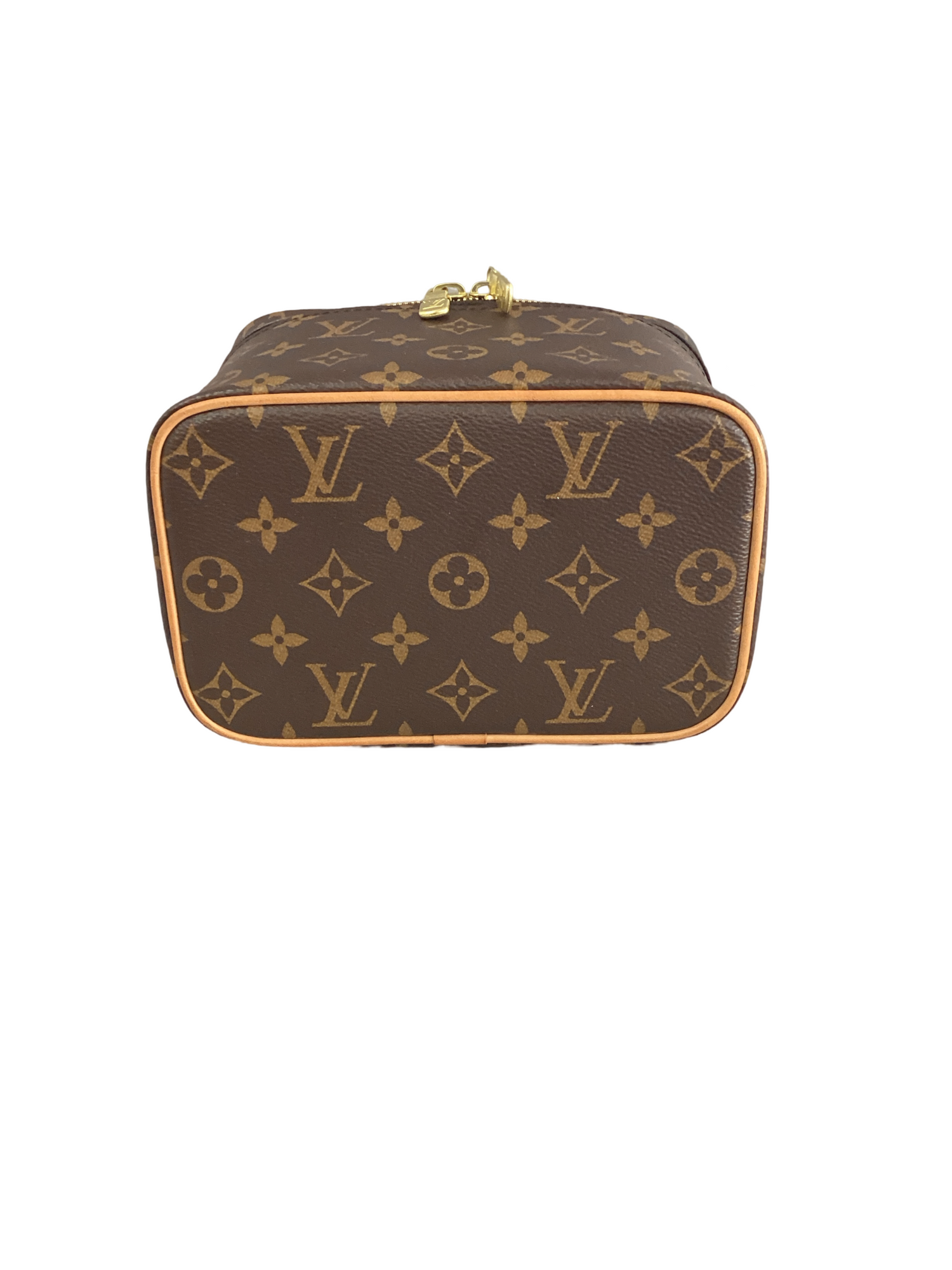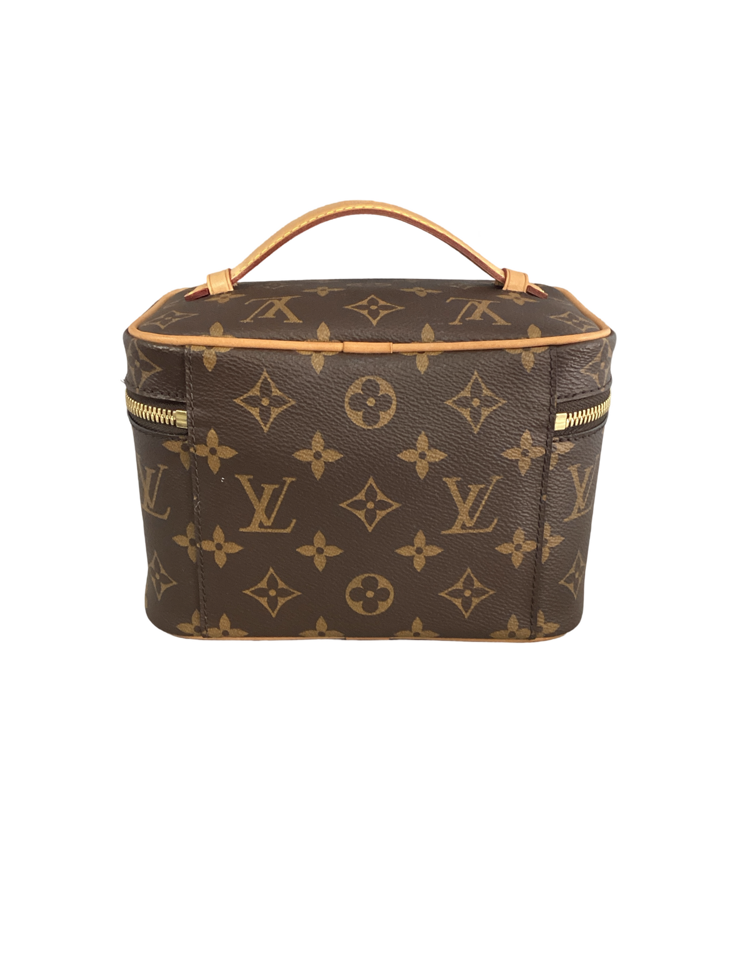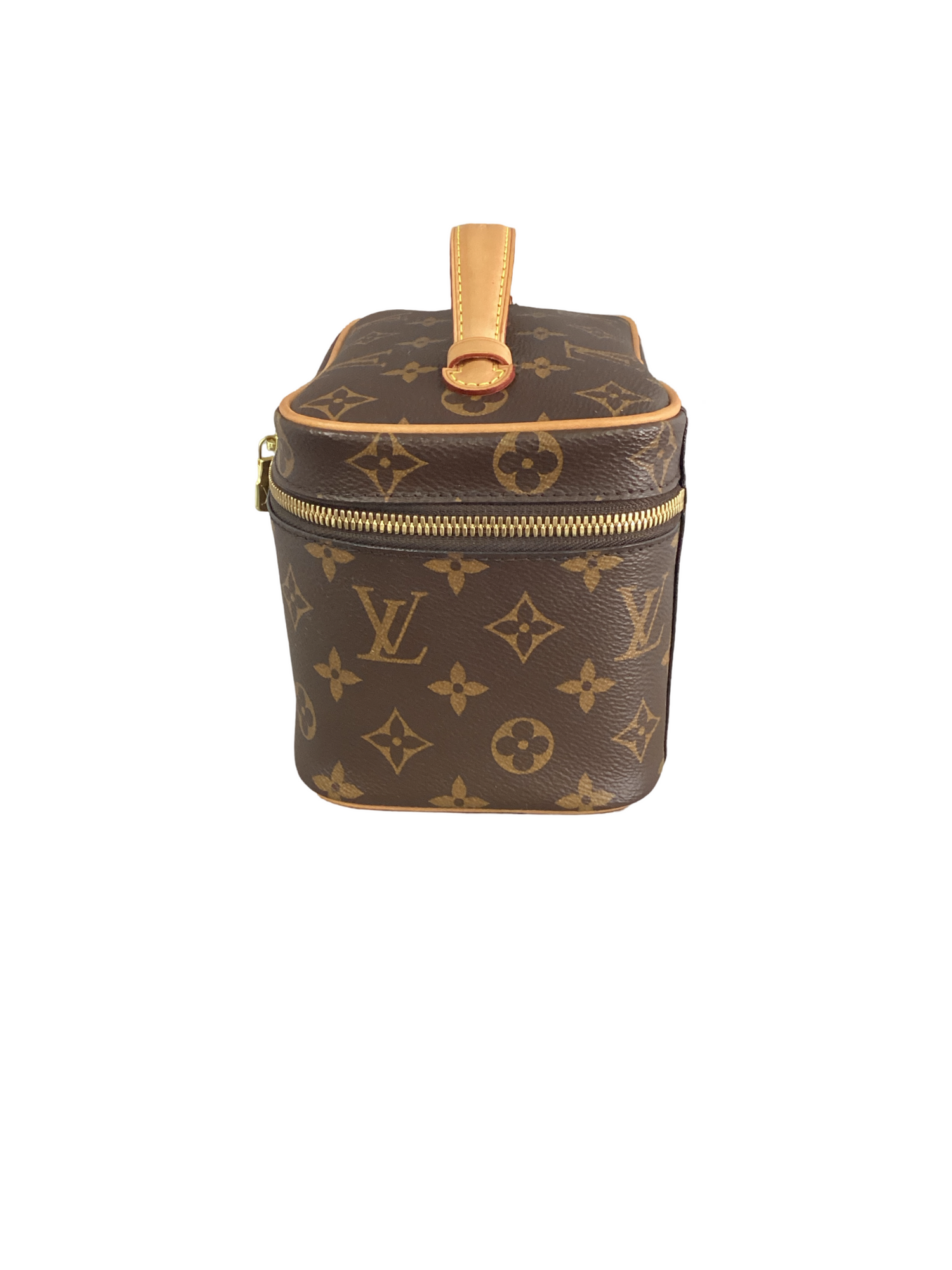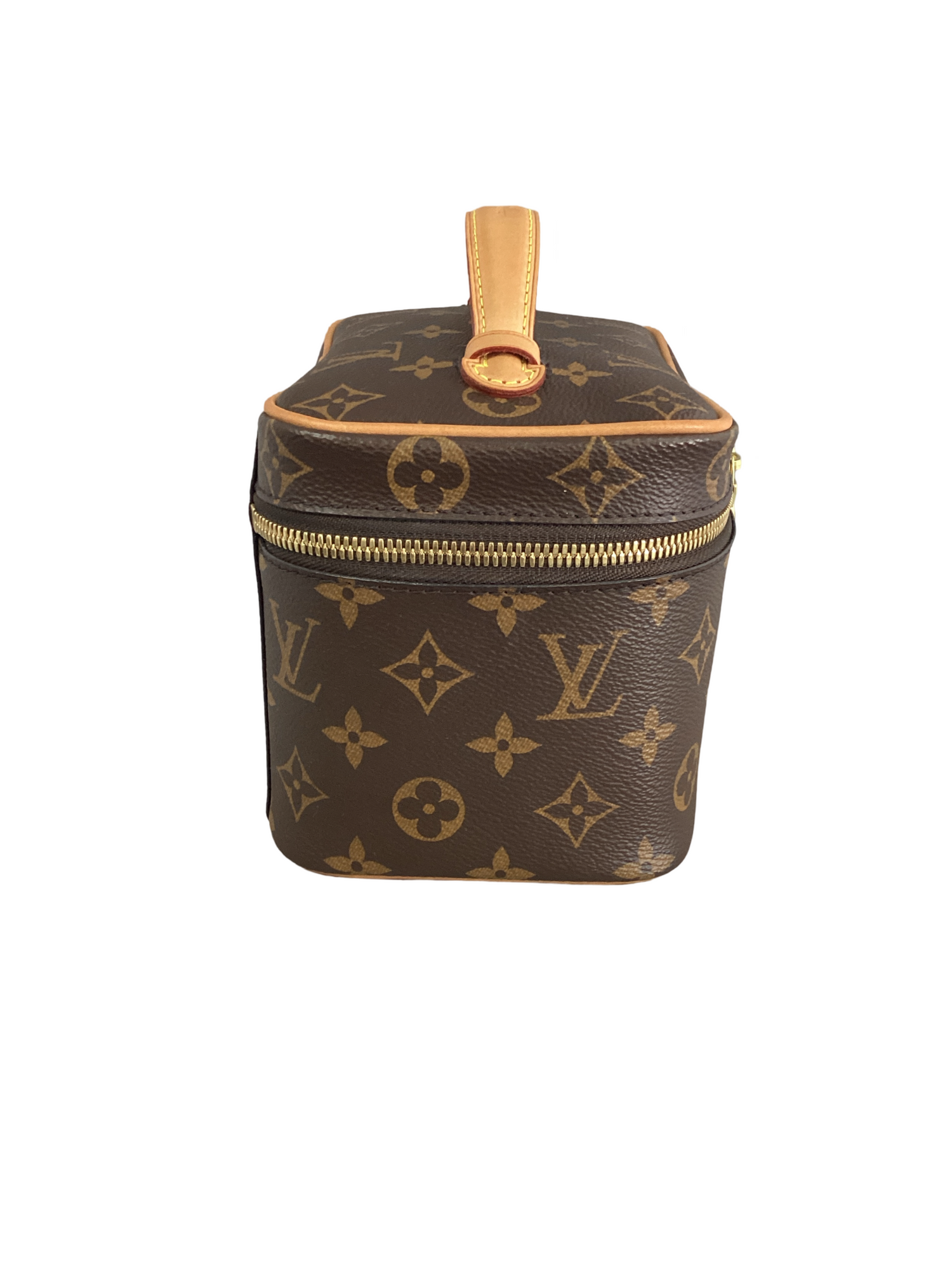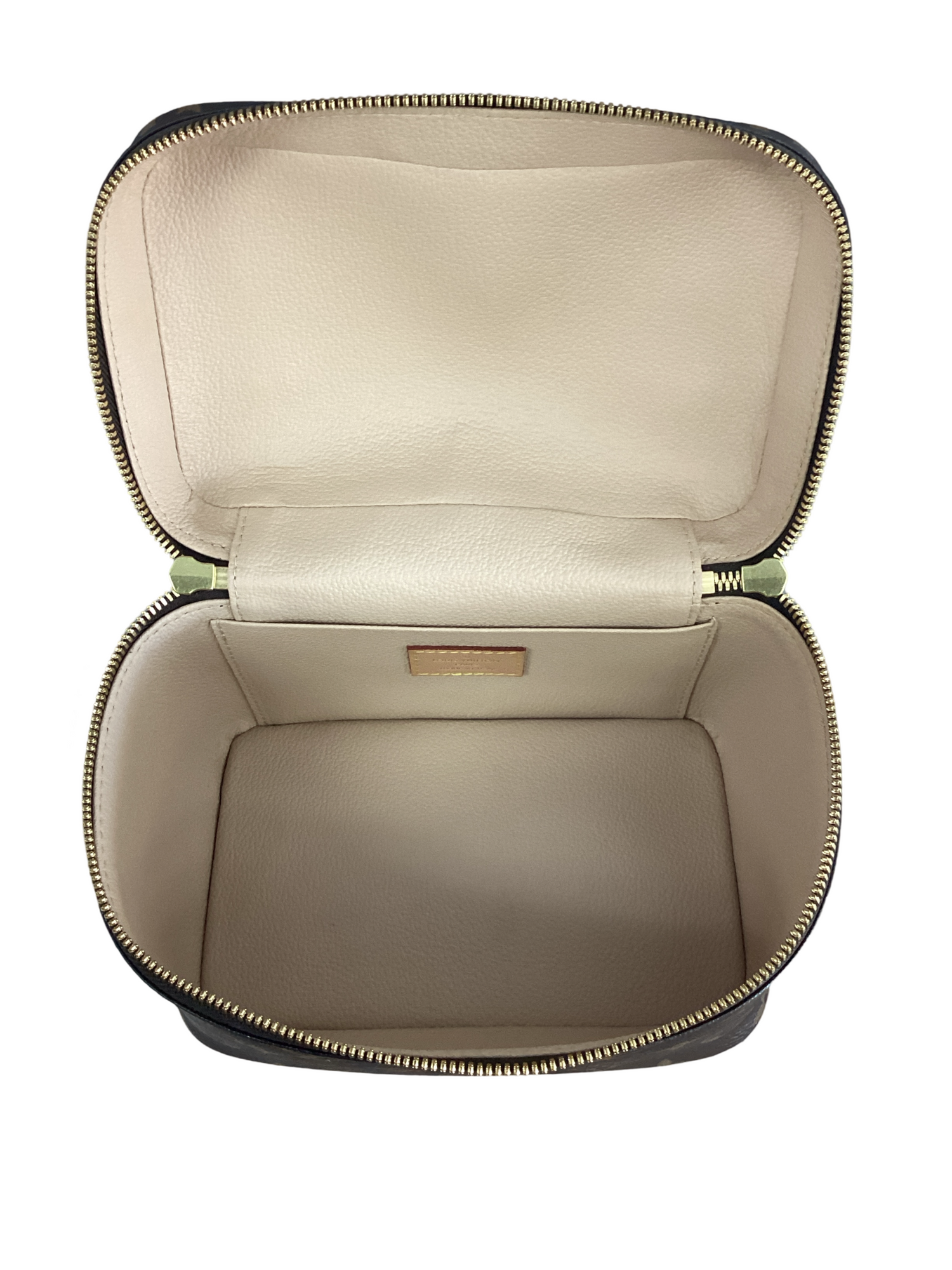 Louis Vuitton Monogram Nice BB Vanity Case with gold-toned hardware, crafted from traditional Louis Vuitton monogram canvas, a vachetta cowhide leather top handle and piping trim and wrap around zipper closure. Interior features a washable coated canvas lining with a zipper and patch pockets.