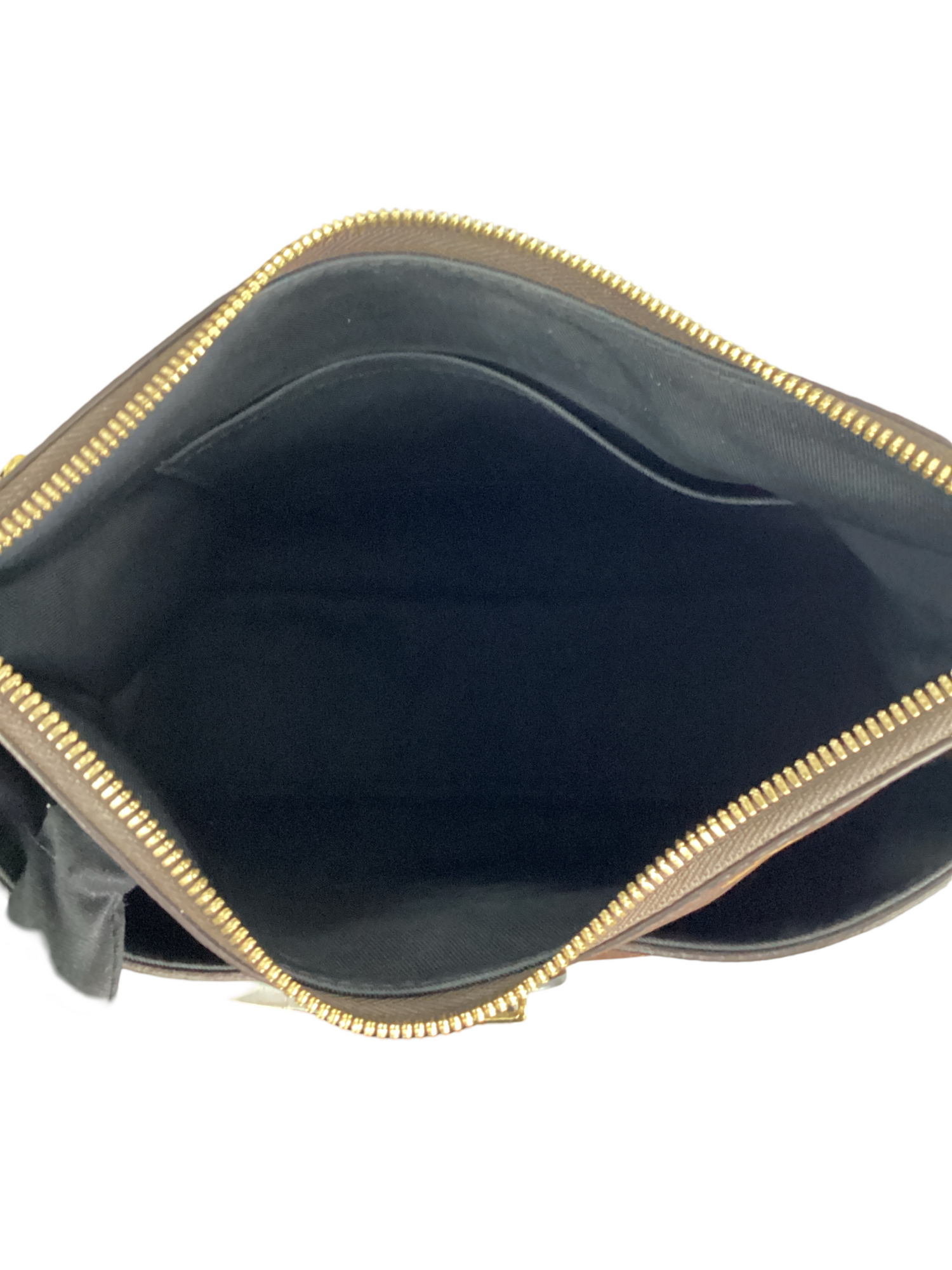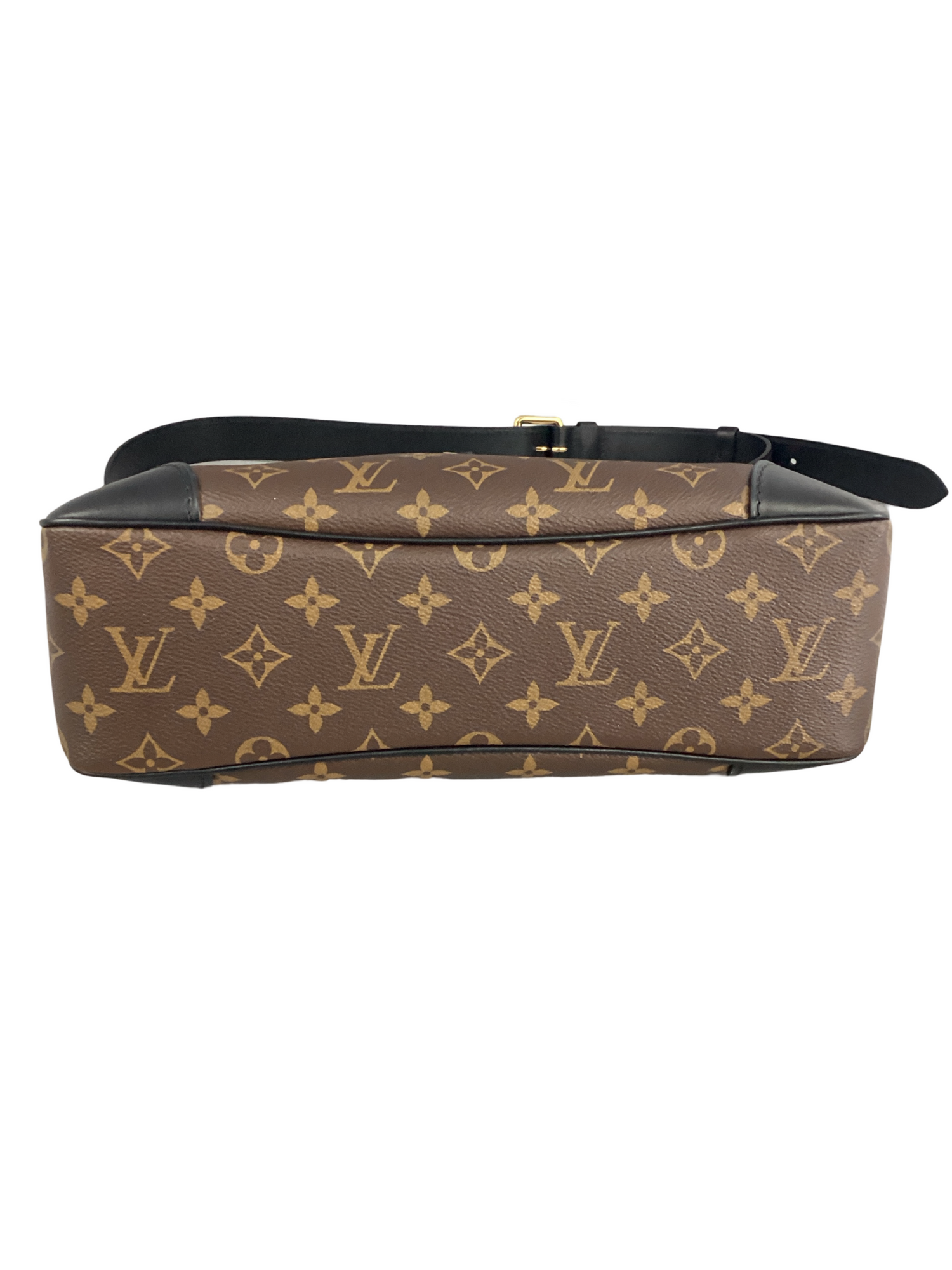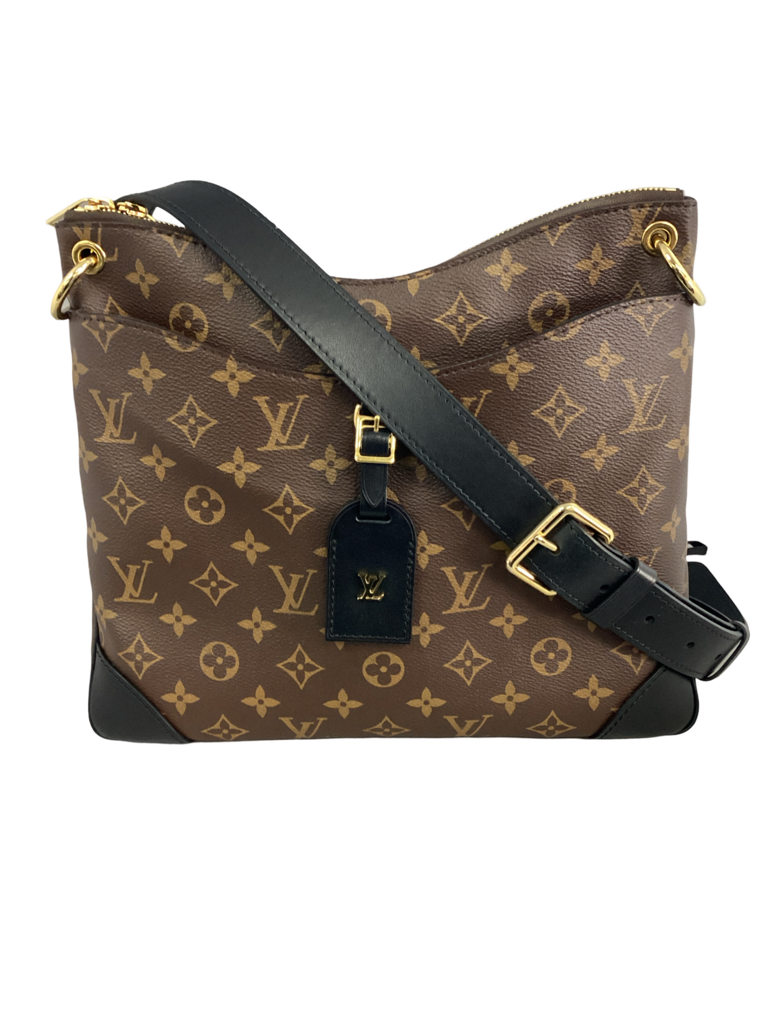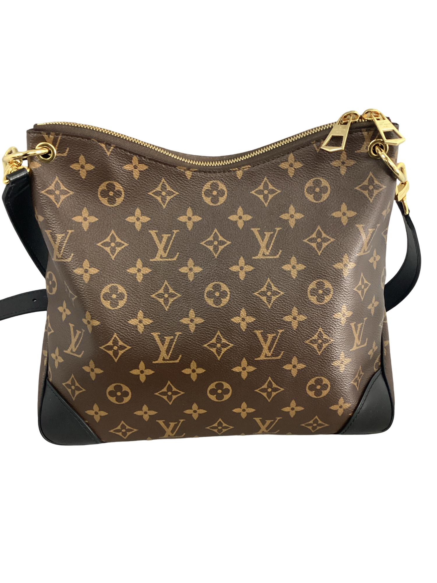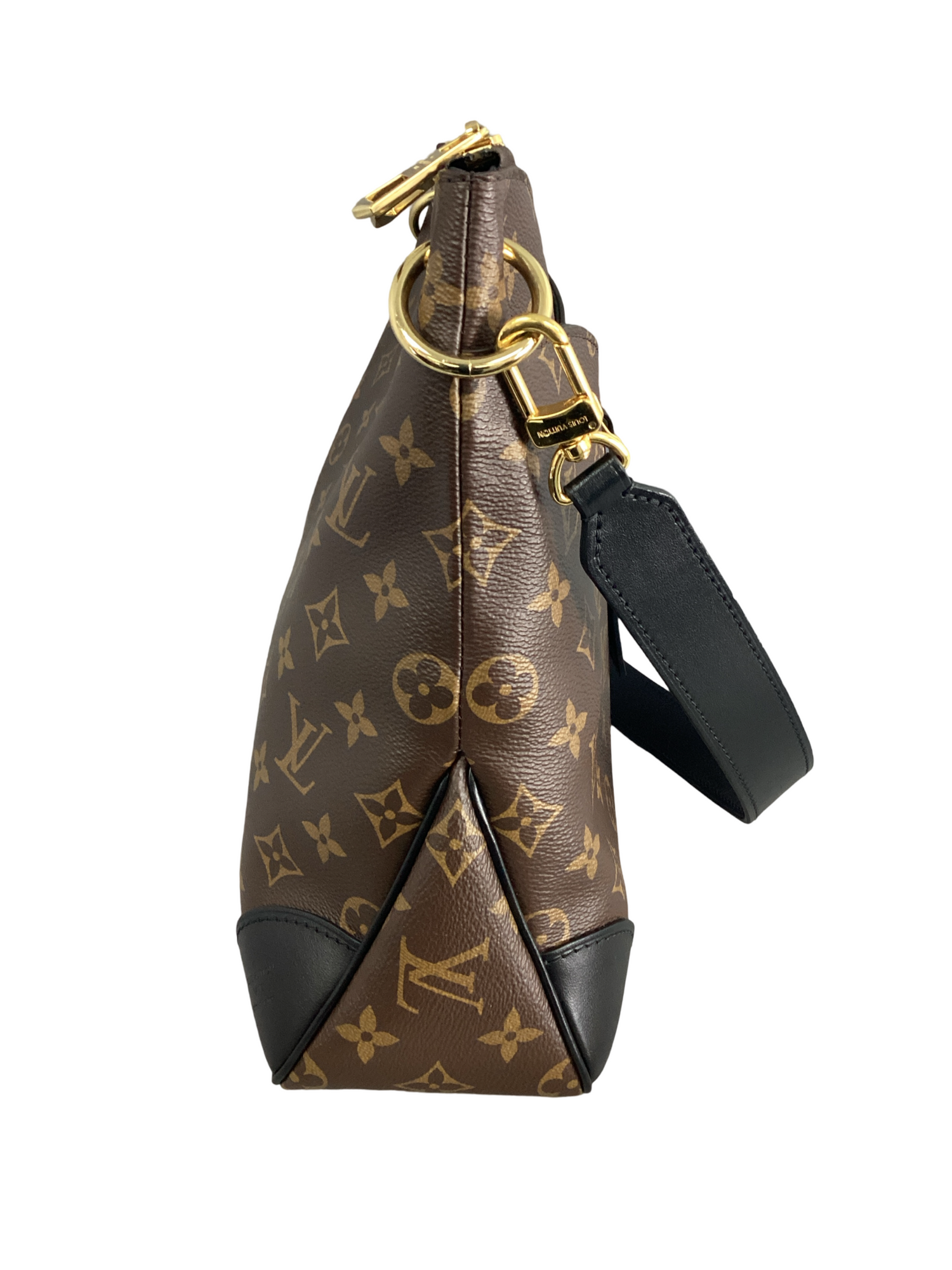 Louis Vuitton Monogram Odéon MM with gold-tone hardware, black vachetta leather, 1 exterior open pocket, adjustable shoulder strap, zipper closure. Interior features include black canvas lining, 1 slip pocket.