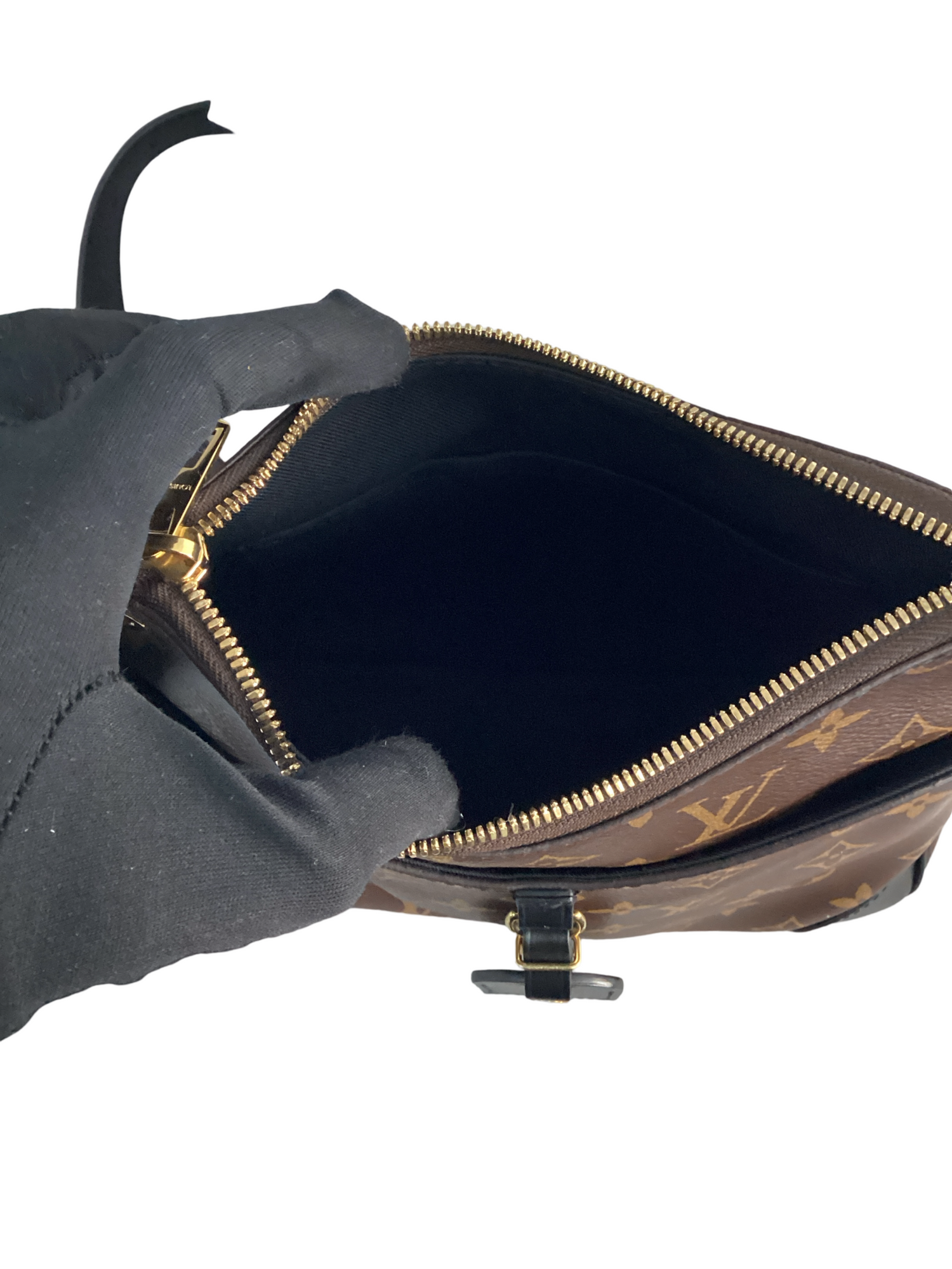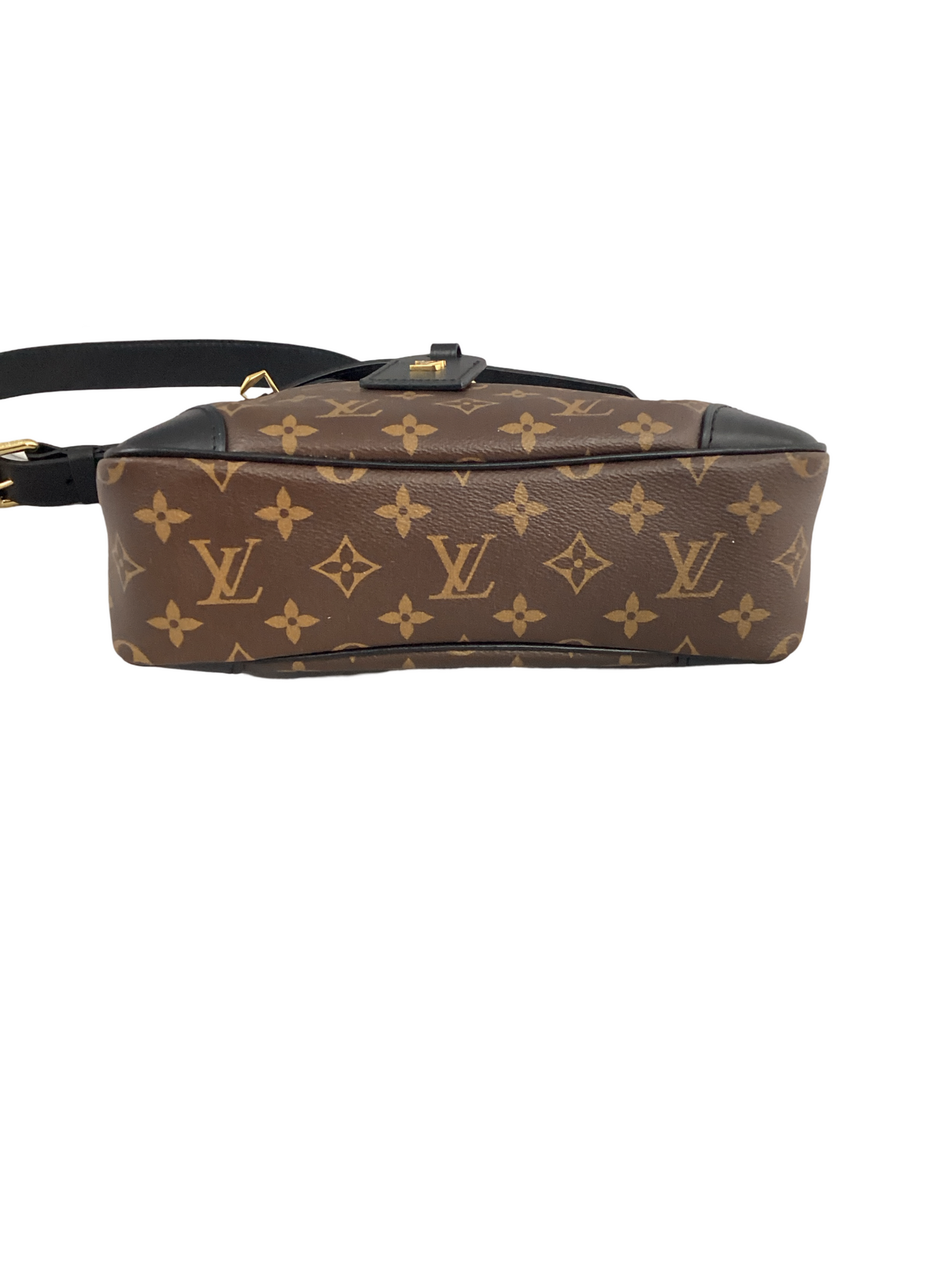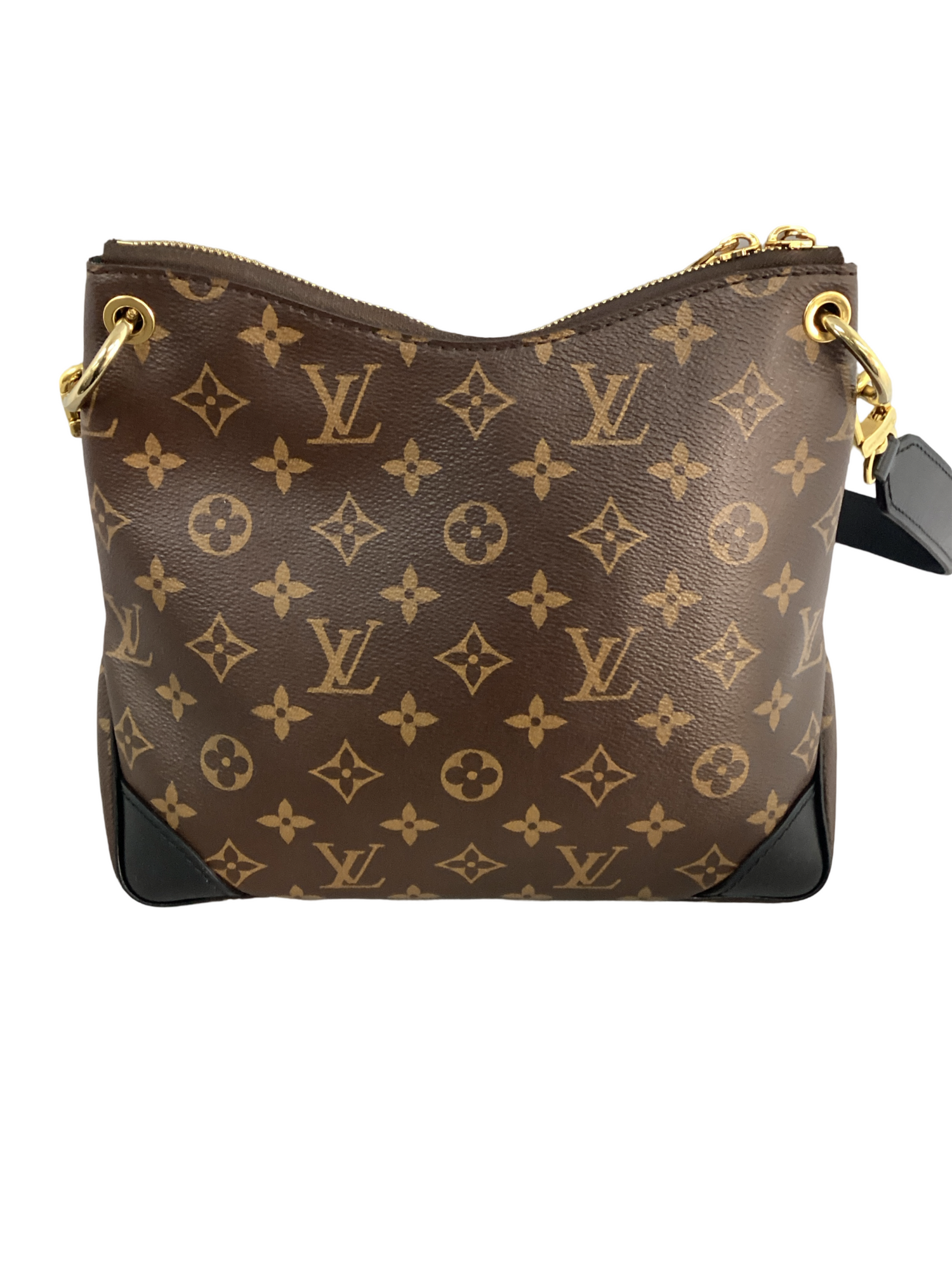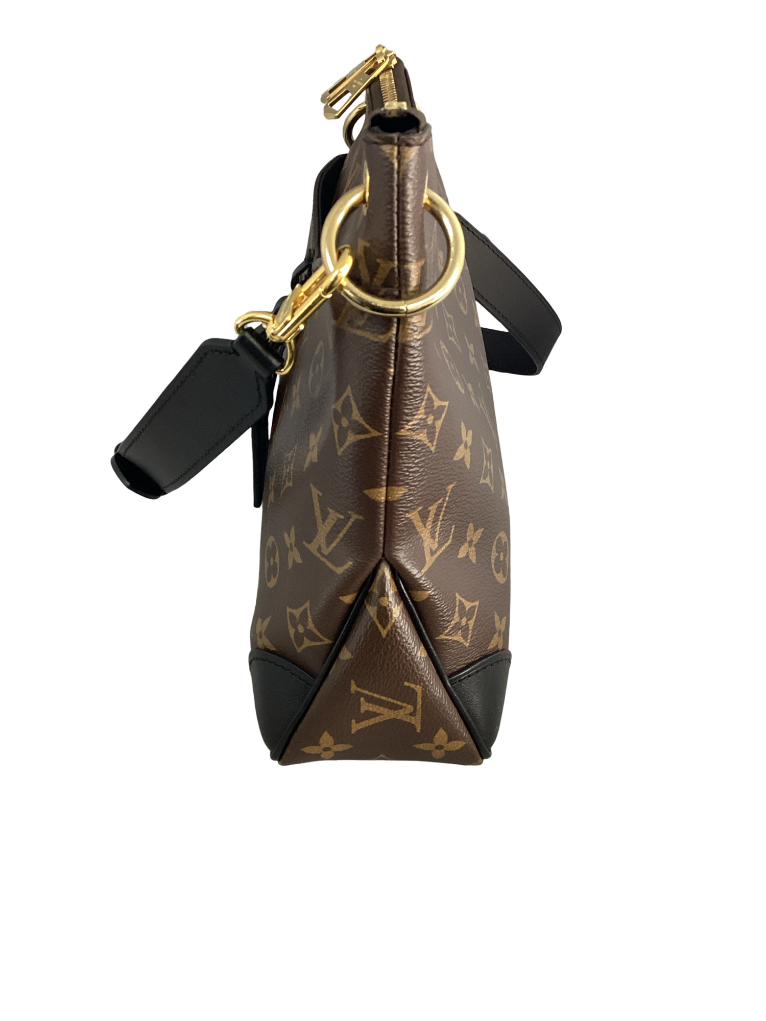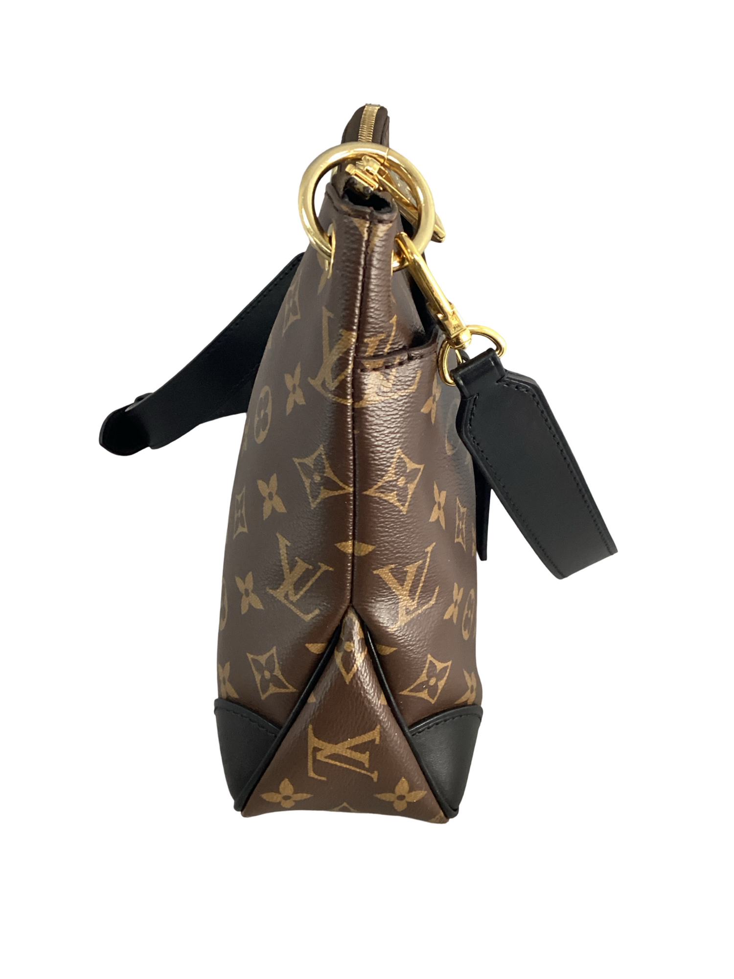 Louis Vuitton Monogram Odéon PM with gold-tone hardware, black vachetta leather, 1 exterior open pocket, adjustable shoulder strap, zipper closure. Interior features include black canvas lining, 1 slip pocket.
