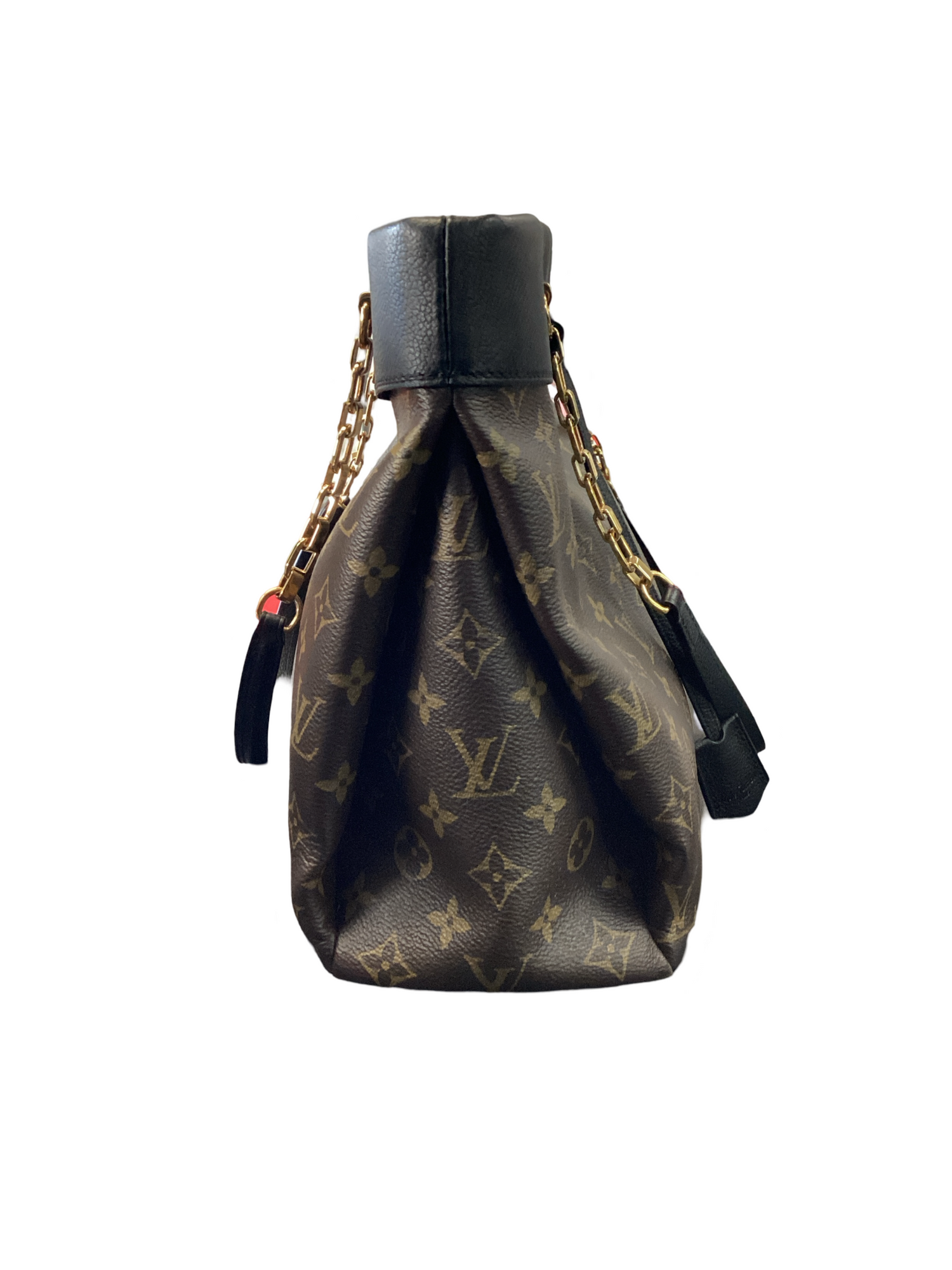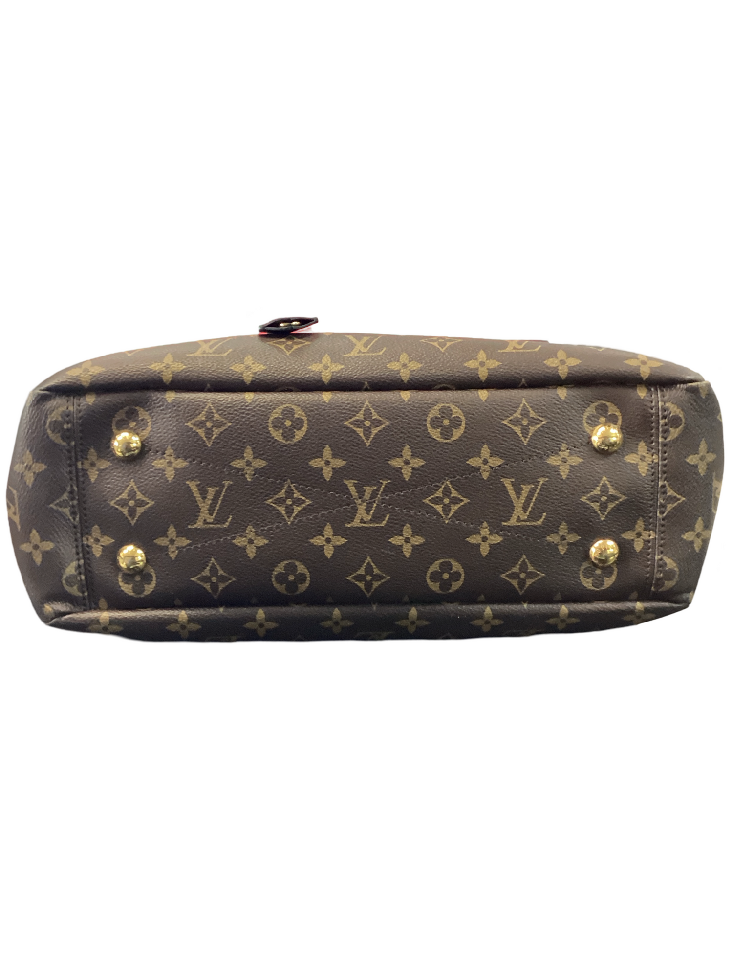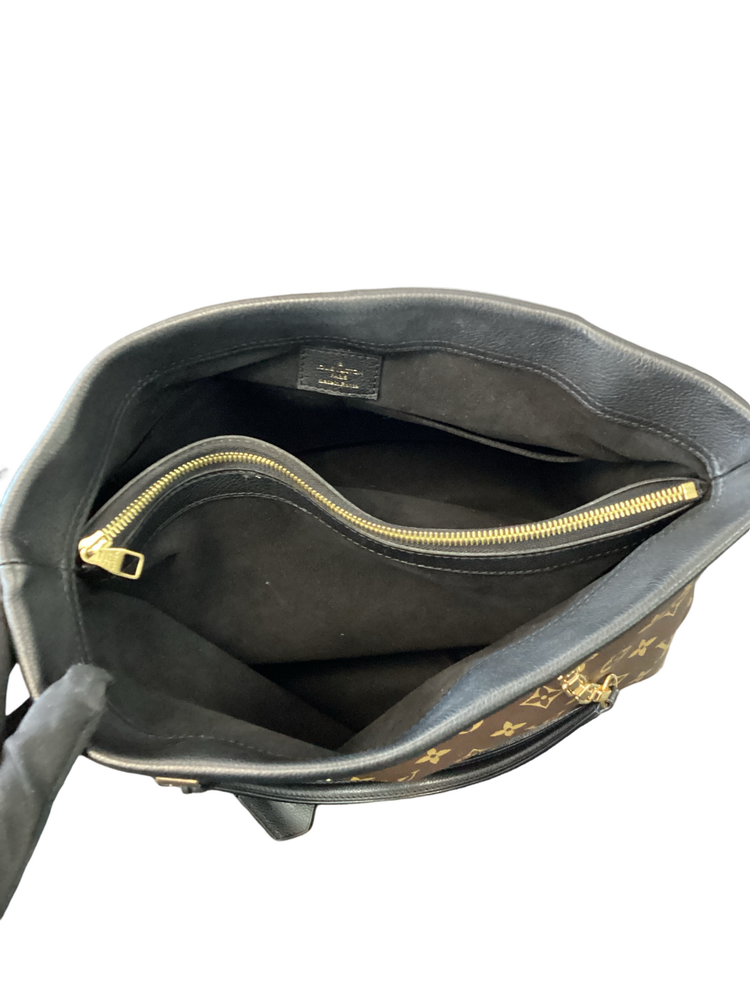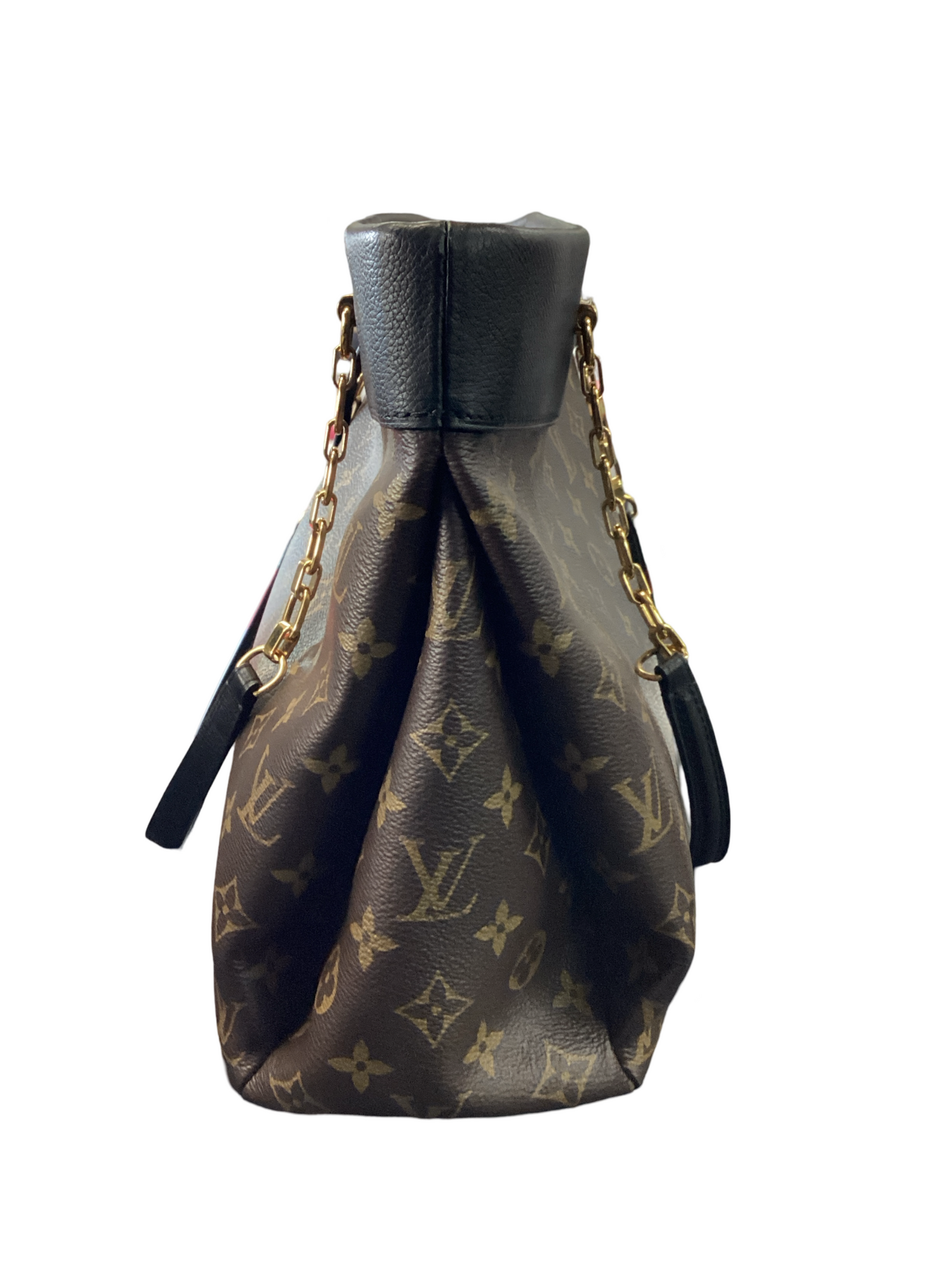Louis Vuitton Monogram Pallas Shopper with gold-tone hardware, dual shoulder straps. Interior features include black fabric lining, 1 zipper compartment, 2 slip pockets.