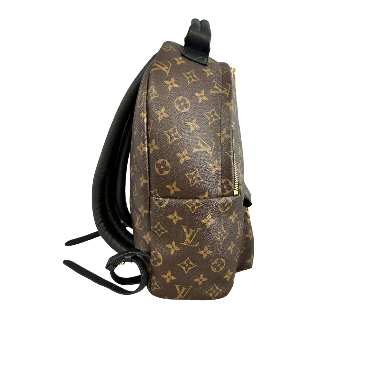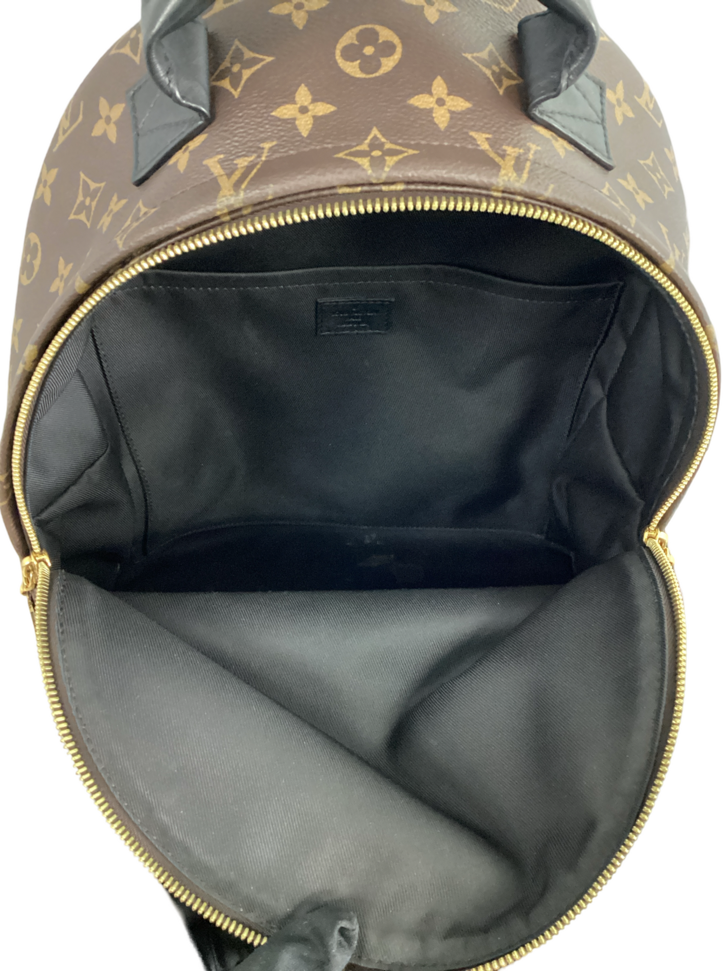 Louis Vuitton Monogram Palm Springs MM with gold-tone hardware, black leather, top handle, adjustable dual back straps, front pocket compartment, zipper closure. Interior features include black canvas lining, 1 slip pocket.