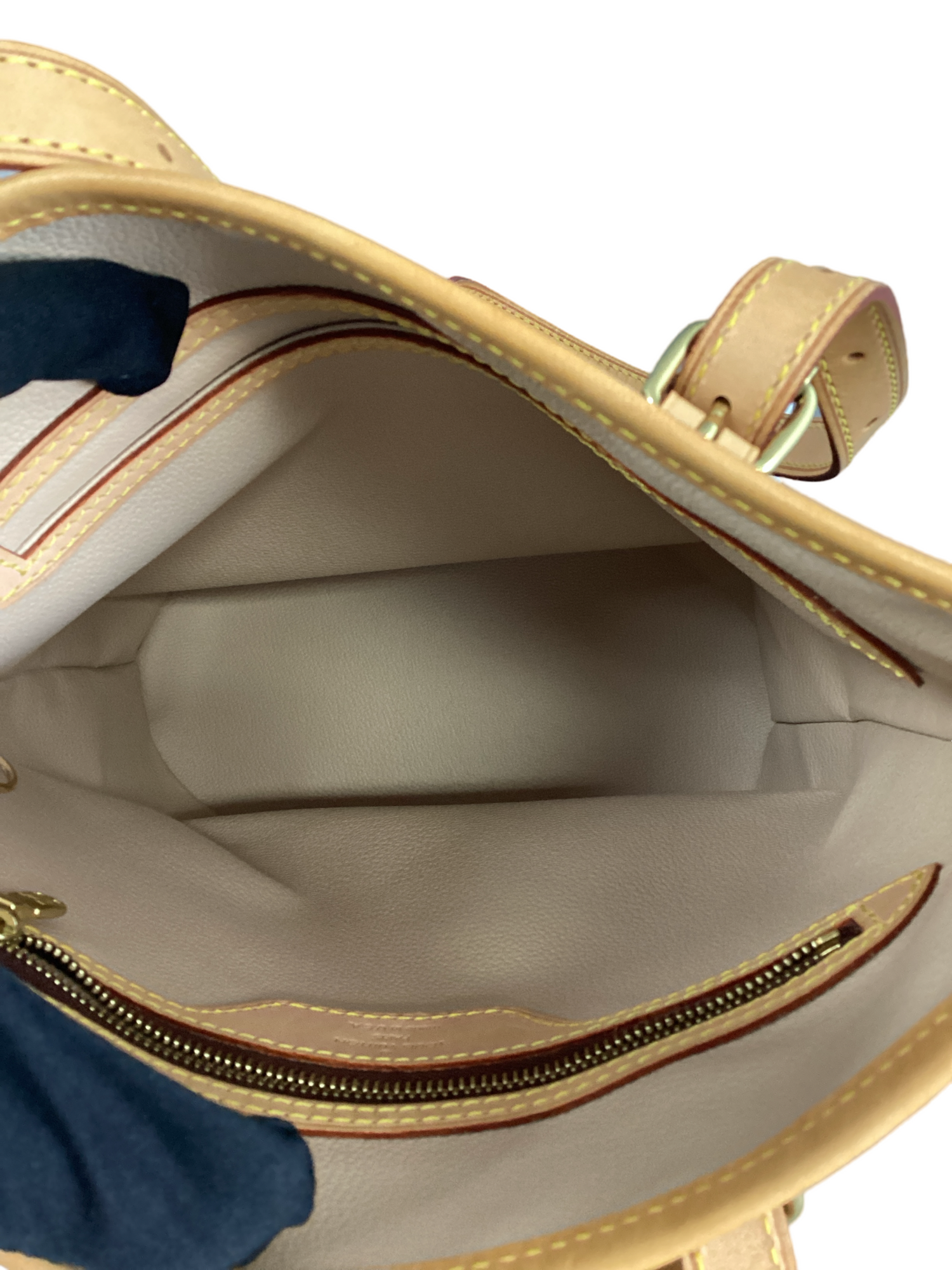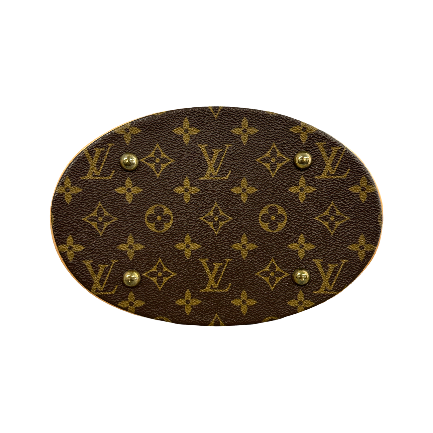 Louis Vuitton Monogram Petit Bucket 23 with gold-toned hardware, crafted with traditional Louis Vuitton monogram on a toile coated canvas, vachetta cowhide leather trim, and adjustable strap handles, and open top. Interior features a beige leather-like interior with zipper and flat pockets and comes with a mini zipper pouch.