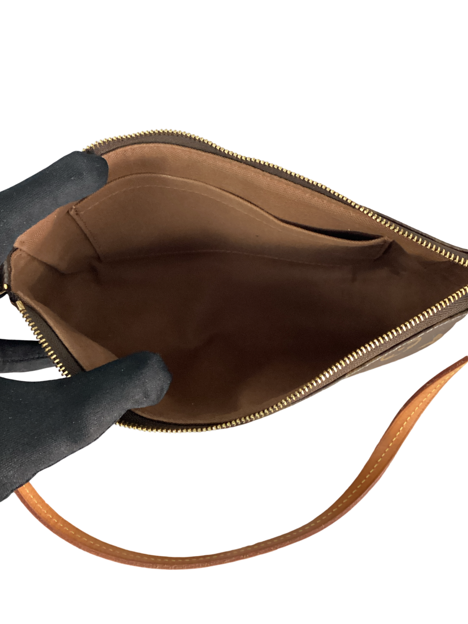 Louis Vuitton Monogram Pochette with gold-toned hardware, Monogram canvas, top zipper closure. Interior features brown fabric lining and slip pocket.