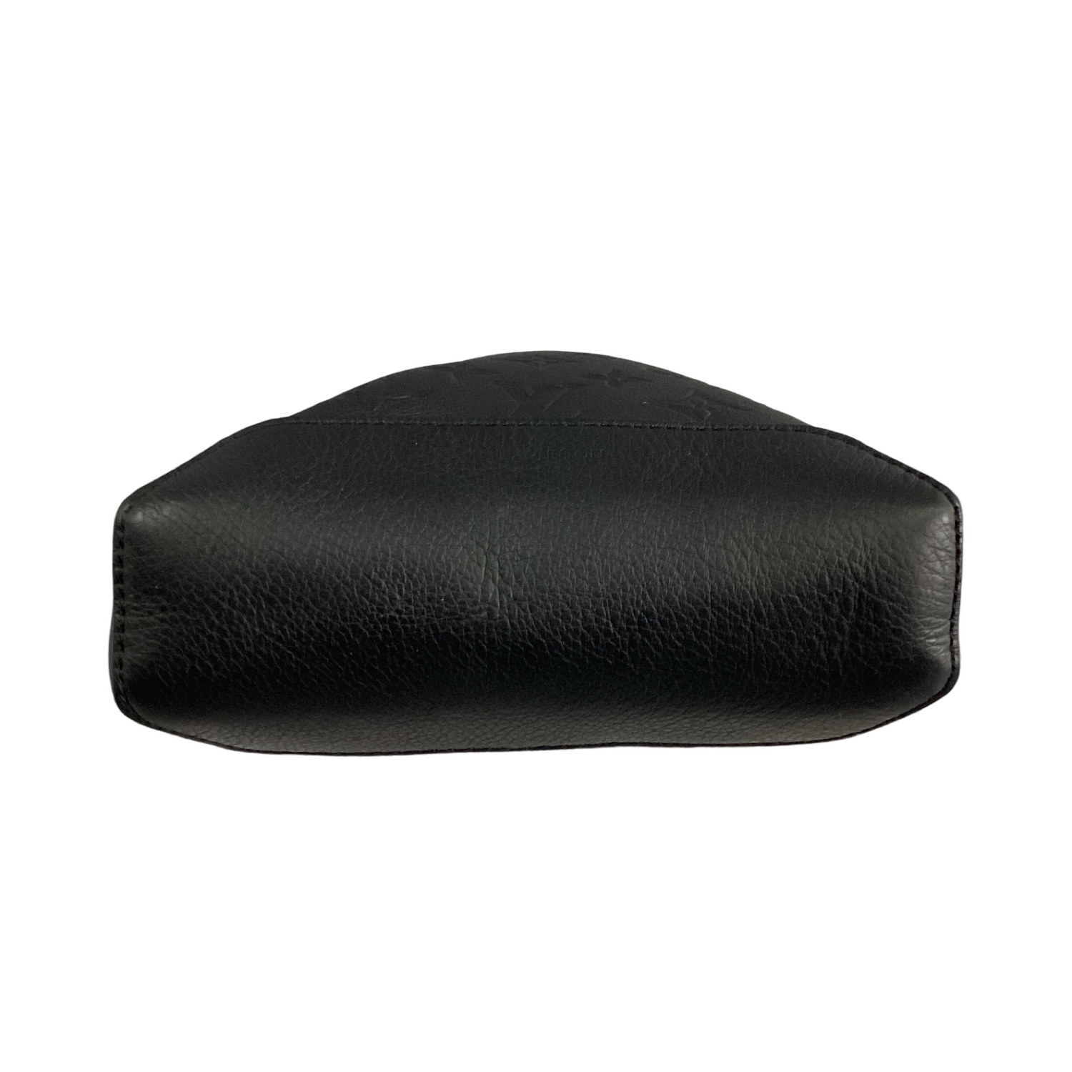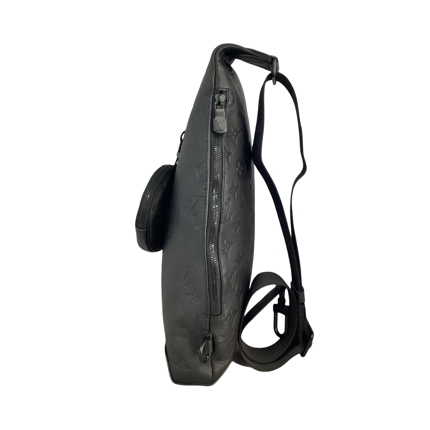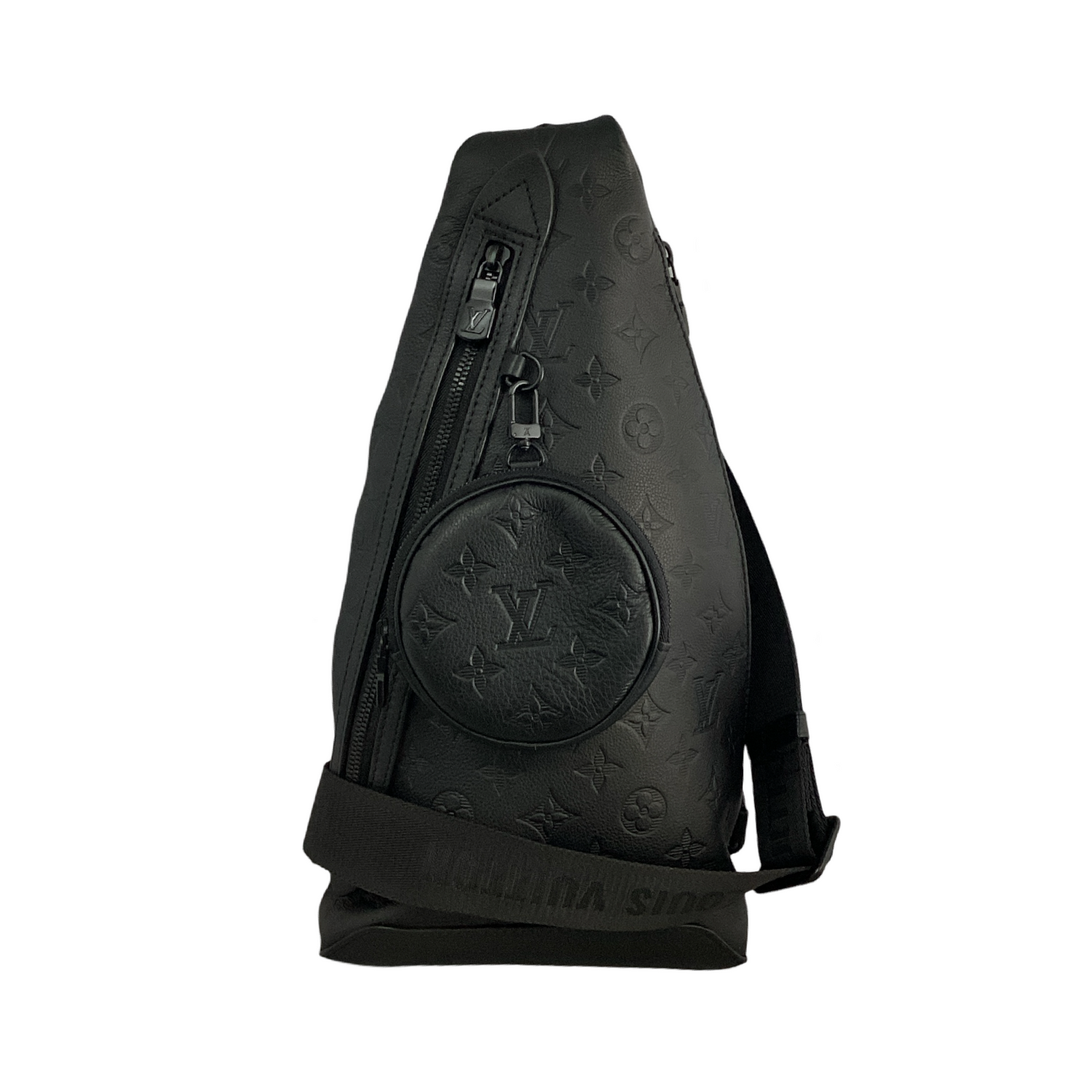 Louis Vuitton-Monogram Shadow Duo Slingbag with matte black-toned hardware, stylish sling bag is crafted of black empreinte leather, side zipper pockets, a removable coin purse, and an adjustable black nylon strap. Interior features a black fabric interior.