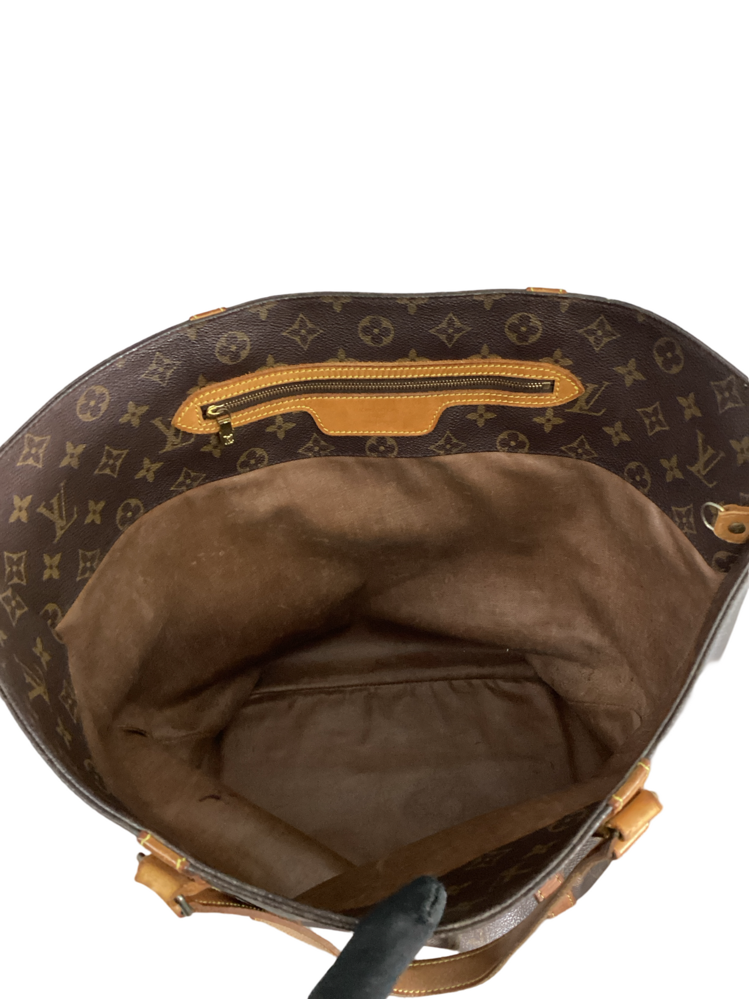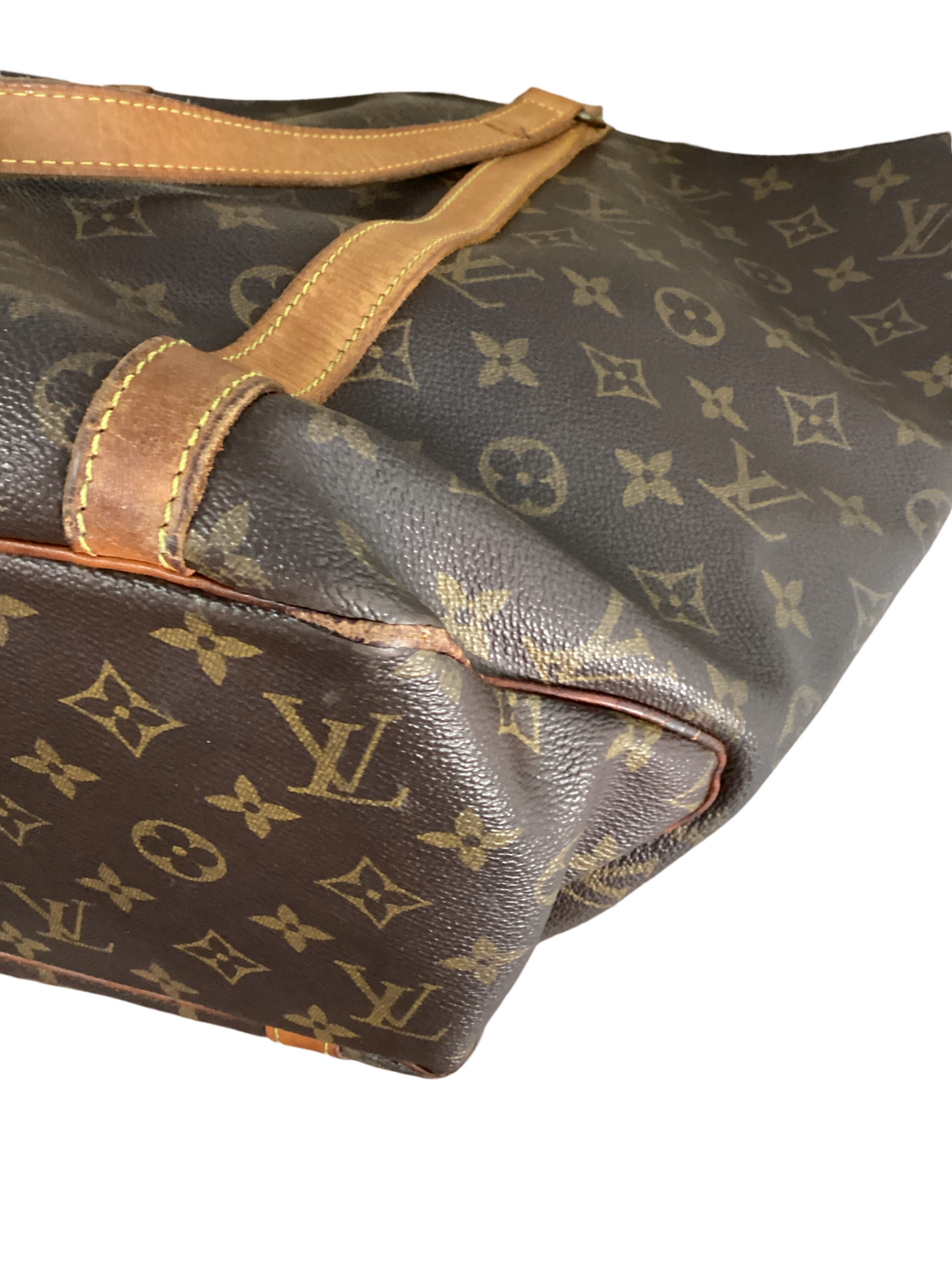 Louis Vuitton Vintage brown and tan coated canvas Monogram Shopping Sac with vachetta leather, dual top handles. Interior features include brown leather lining.