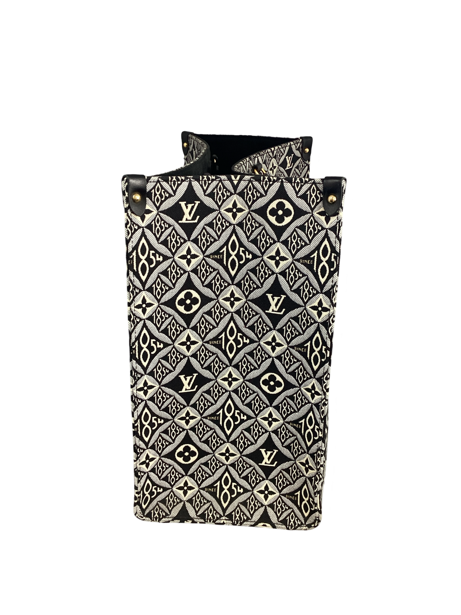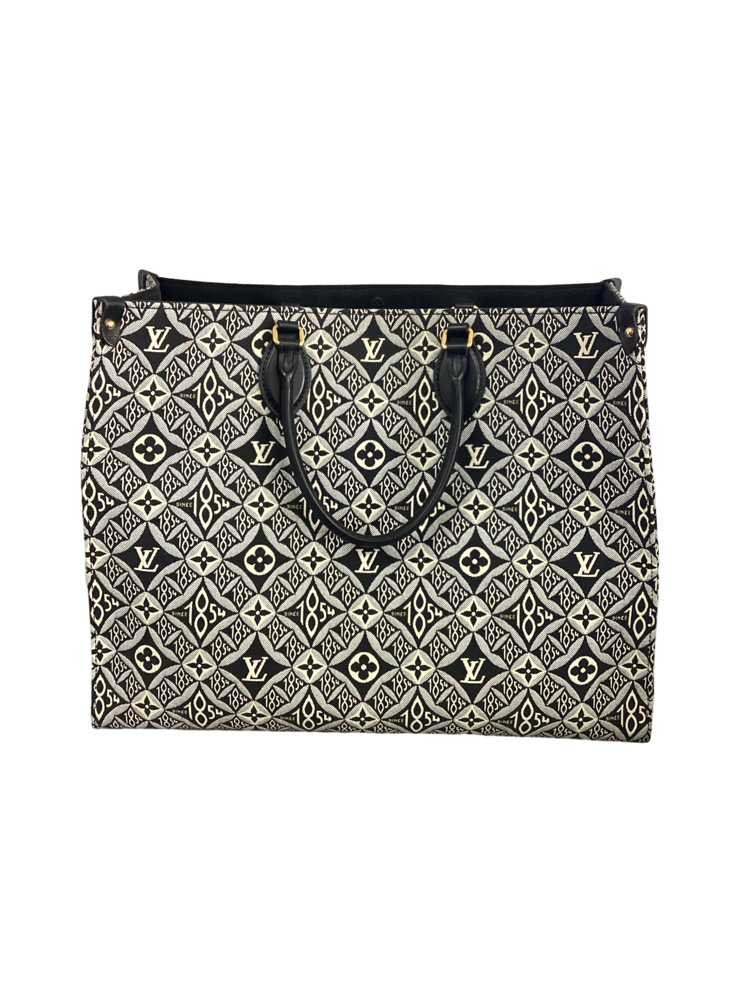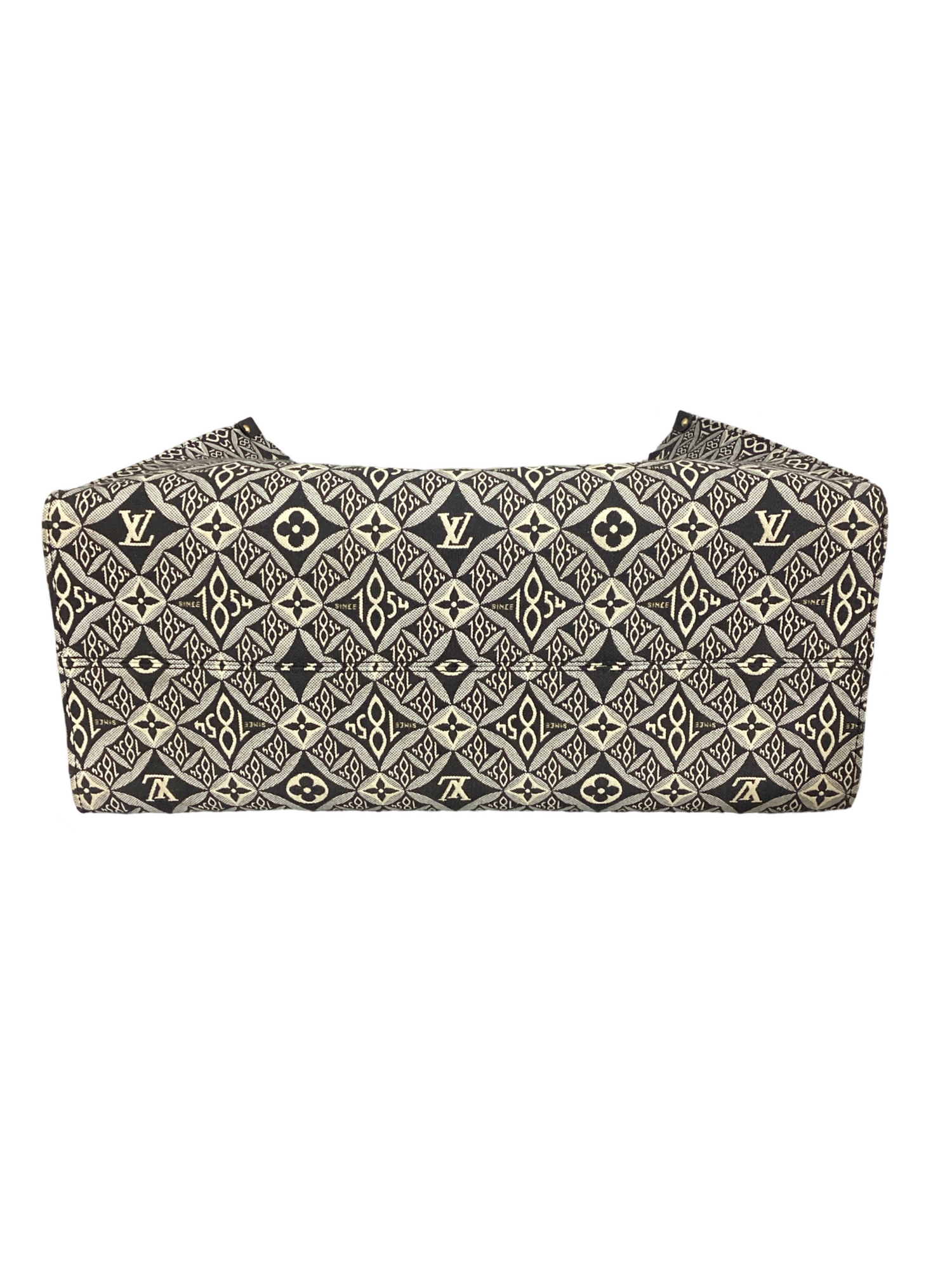 Louis Vuitton Monogram Since 1854 On The Go GM with gold-toned hardware, n Grey, limited edition tote is crafted of jacquard textile inspired by vintage wallpaper patterns, monogram fleurs, and 1854, which indicates the year of the founding of the Louis Vuitton fashion house, black leather top handles and long strap handles and top is open and hook clasp closure. Interior features a spacious black microfiber interior with zipper and patch pockets.