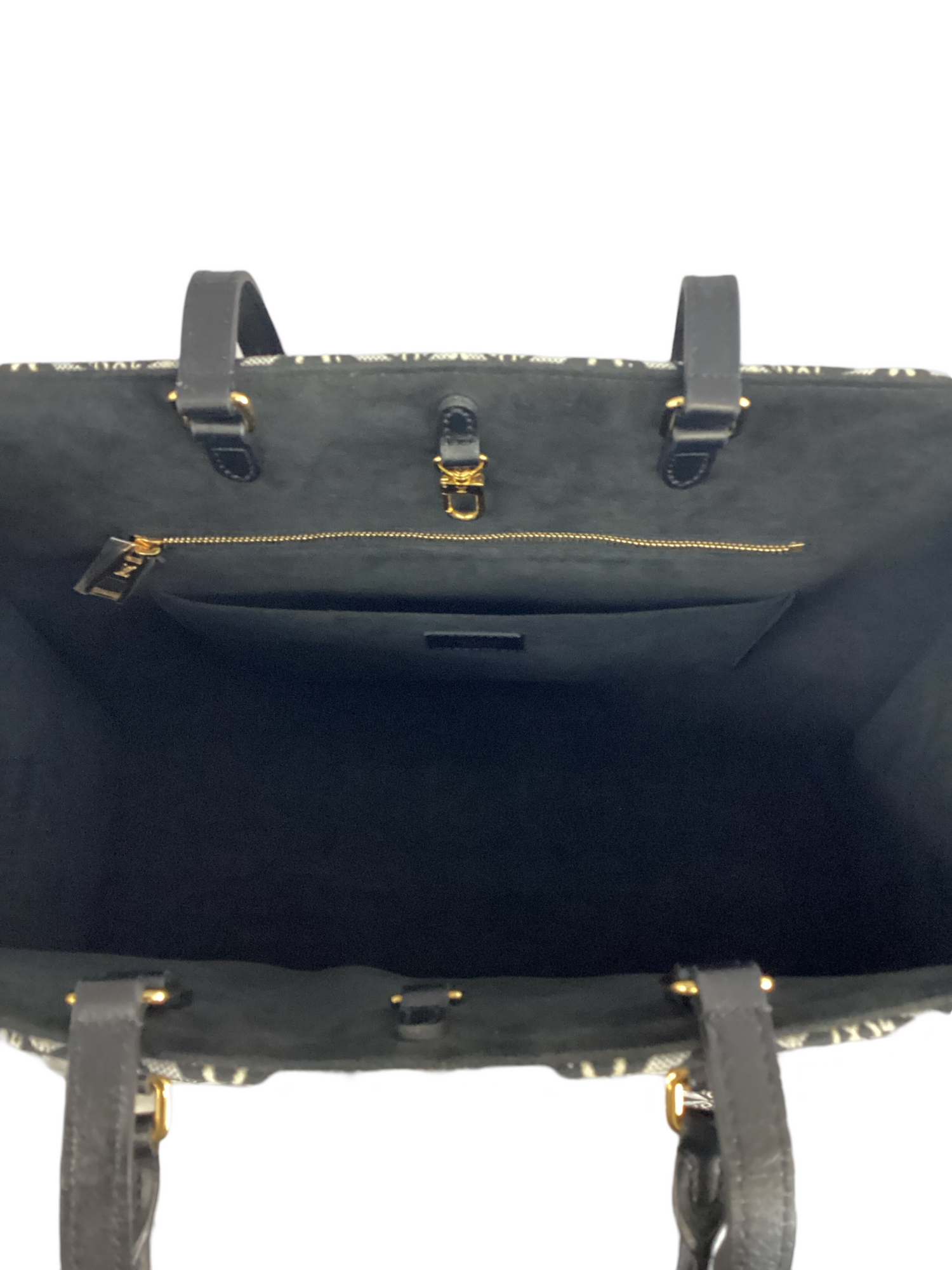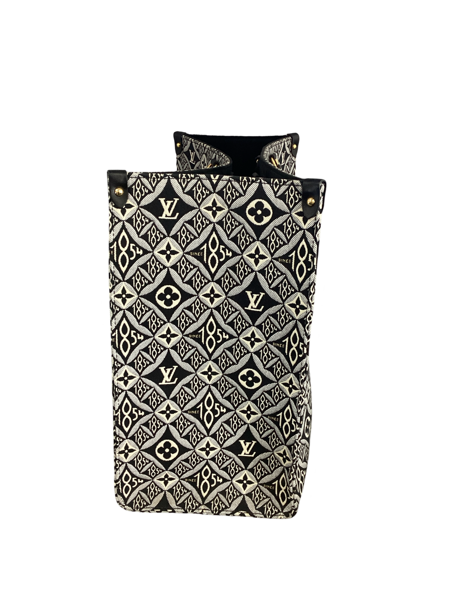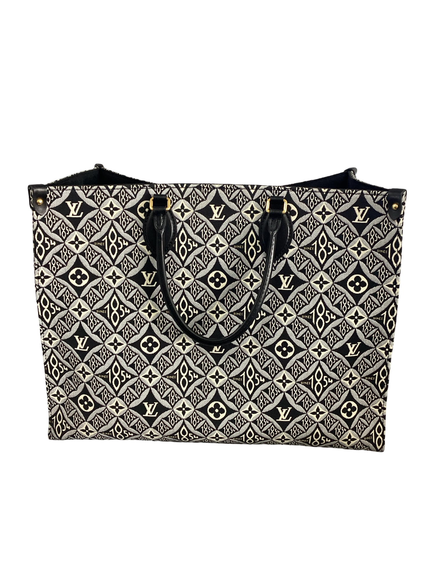 Louis Vuitton Monogram Since 1854 On The Go GM with gold-toned hardware, n Grey, limited edition tote is crafted of jacquard textile inspired by vintage wallpaper patterns, monogram fleurs, and 1854, which indicates the year of the founding of the Louis Vuitton fashion house, black leather top handles and long strap handles and top is open and hook clasp closure. Interior features a spacious black microfiber interior with zipper and patch pockets.