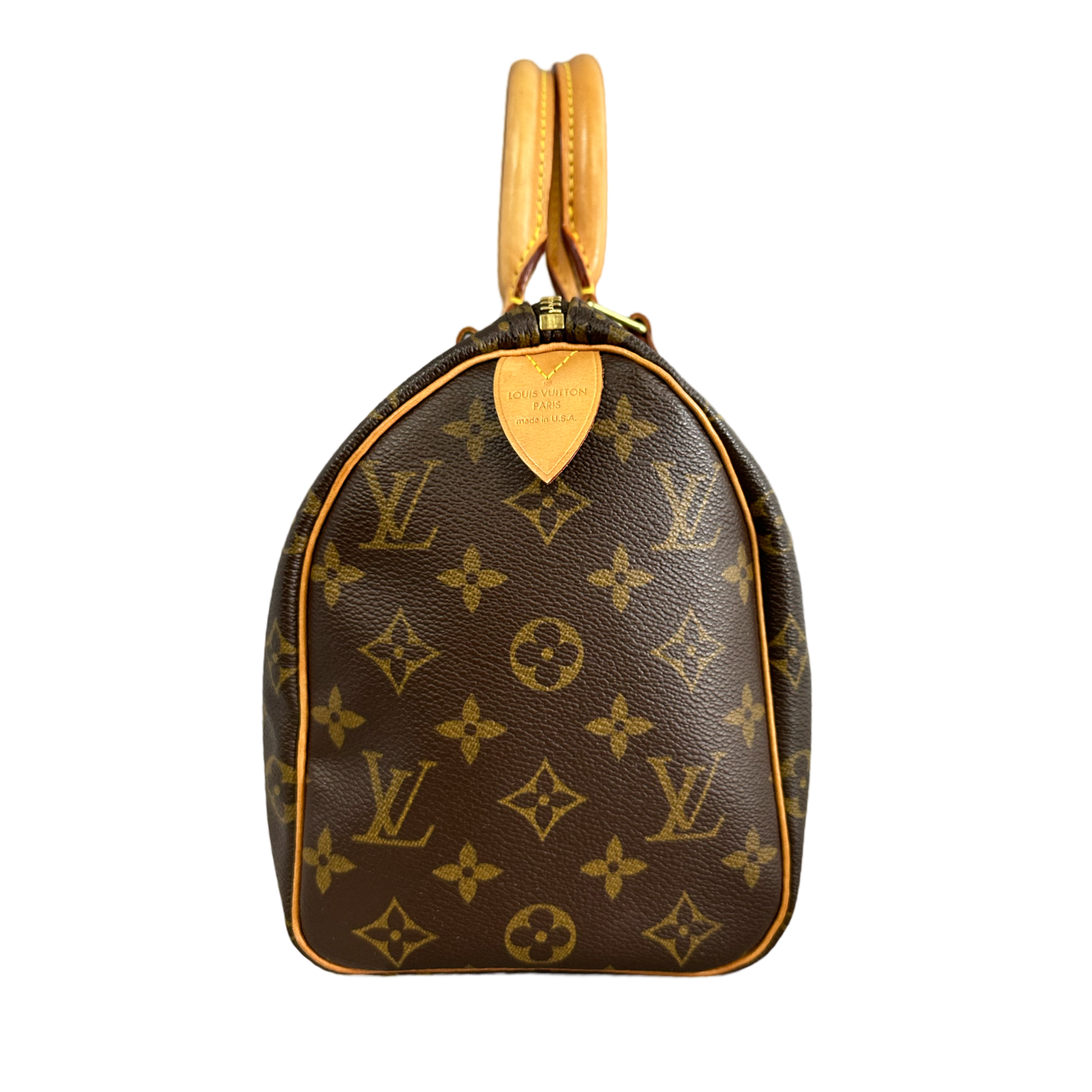 Louis Vuitton Monogram Speedy 25 with gold-toned hardware, brown Louis Vuitton monogram coated canvas, dual vachetta rolled top handles and a zipper top closure. Interior features brown fabric interior lining and a patch pocket.