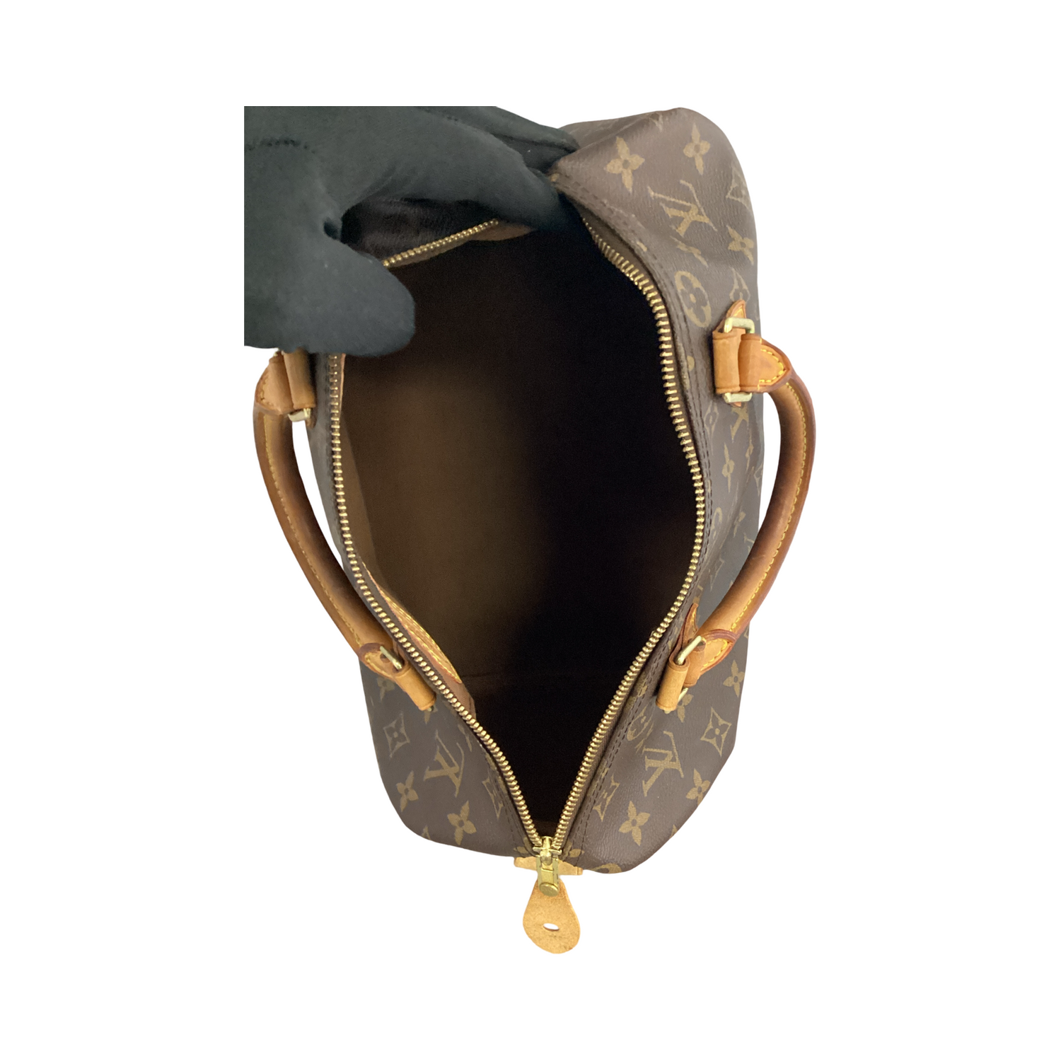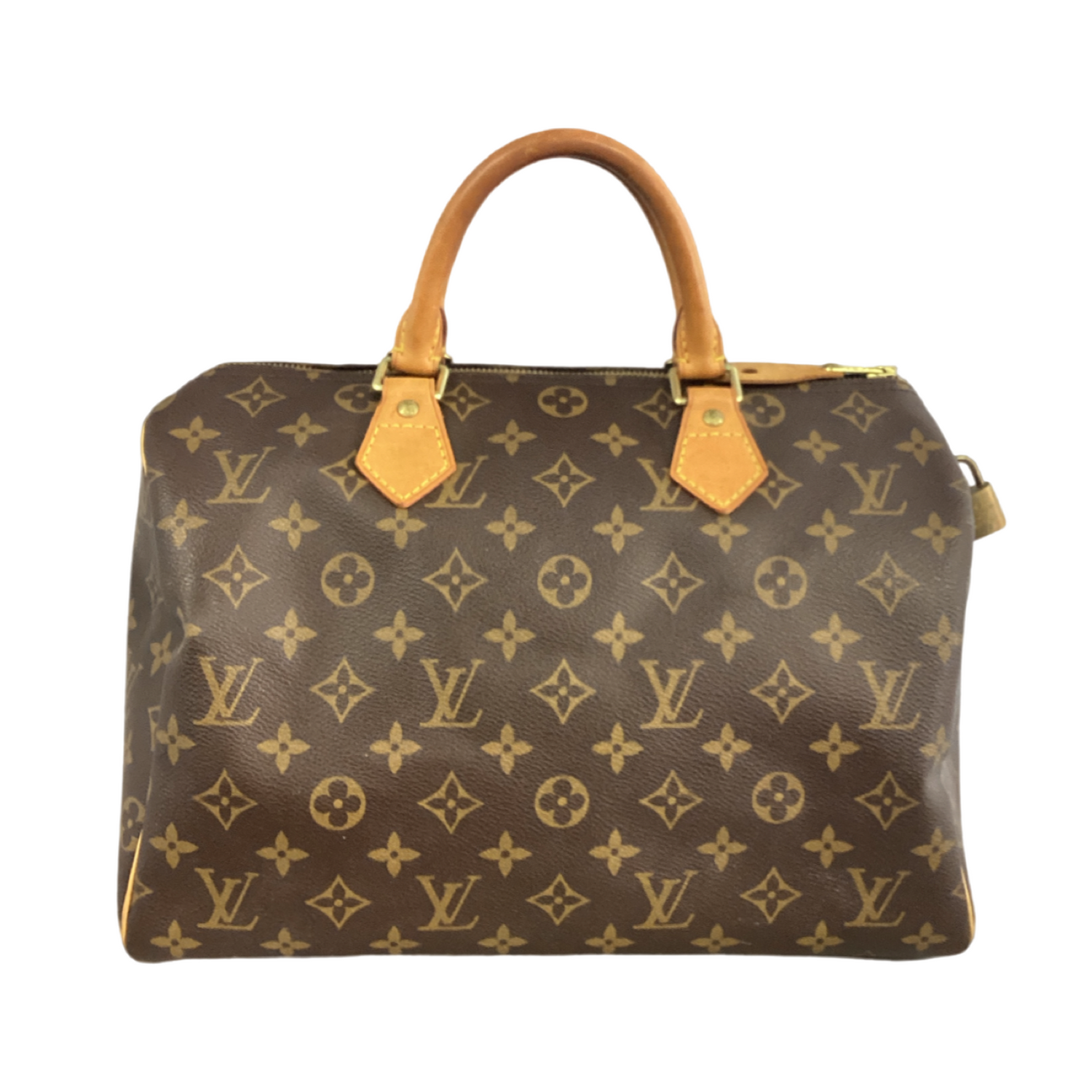 Louis Vuitton-Monogram Speedy 30 with gold-tone hardware, brown monogram coated canvas, rolled dual top handles and top zipper closure. Interior features a cocoa brown fabric interior with a hanging patch pocket.