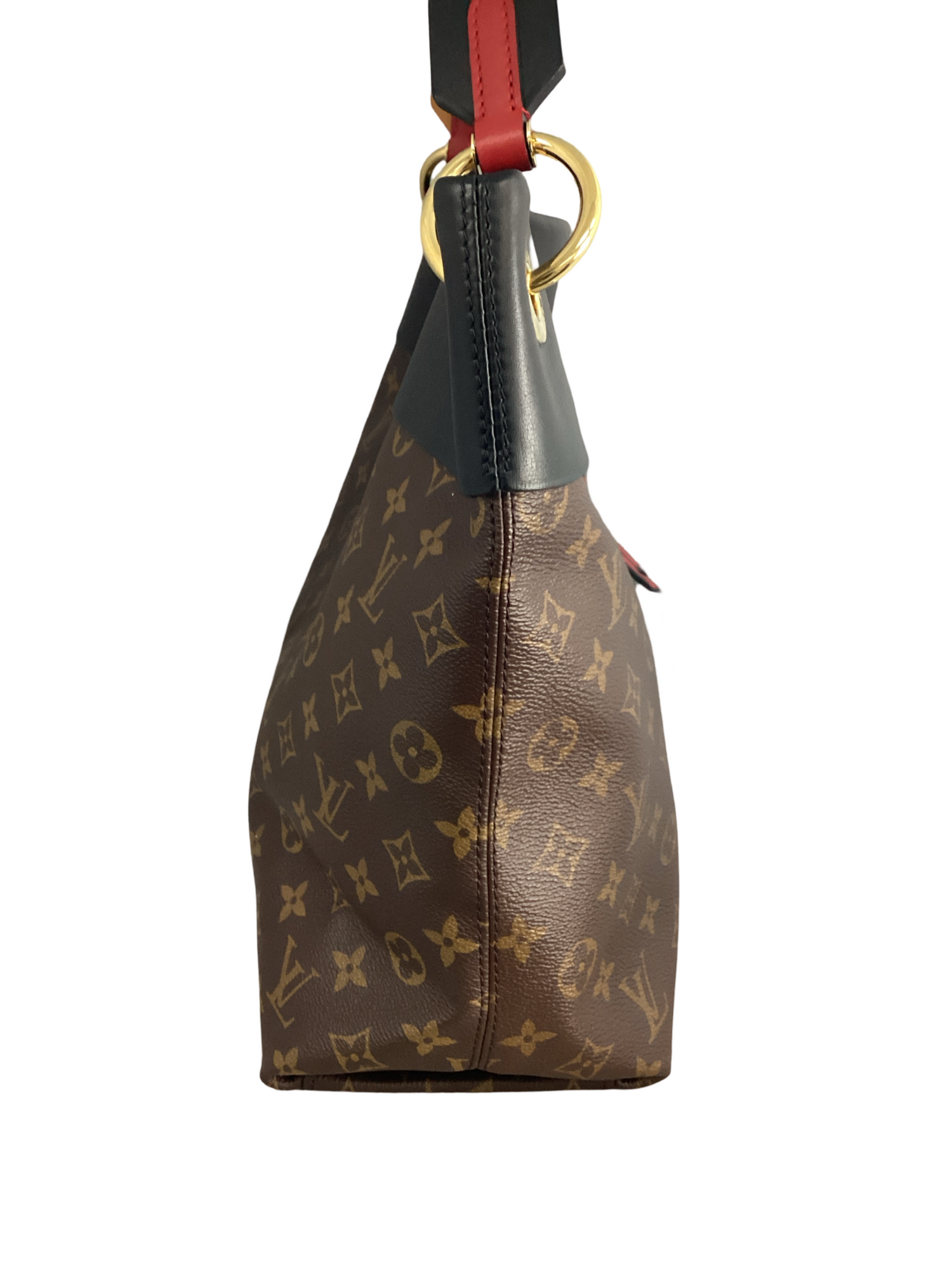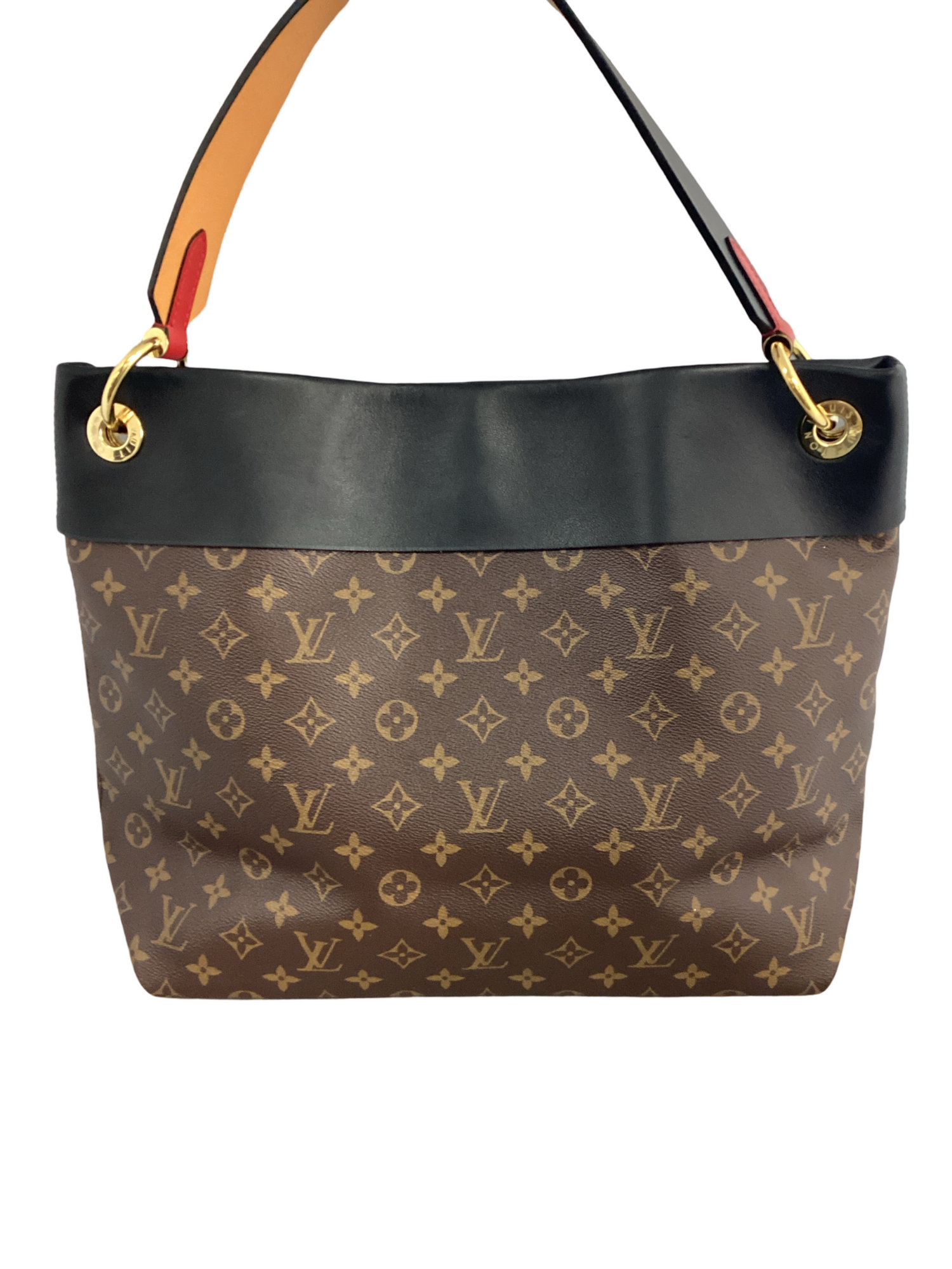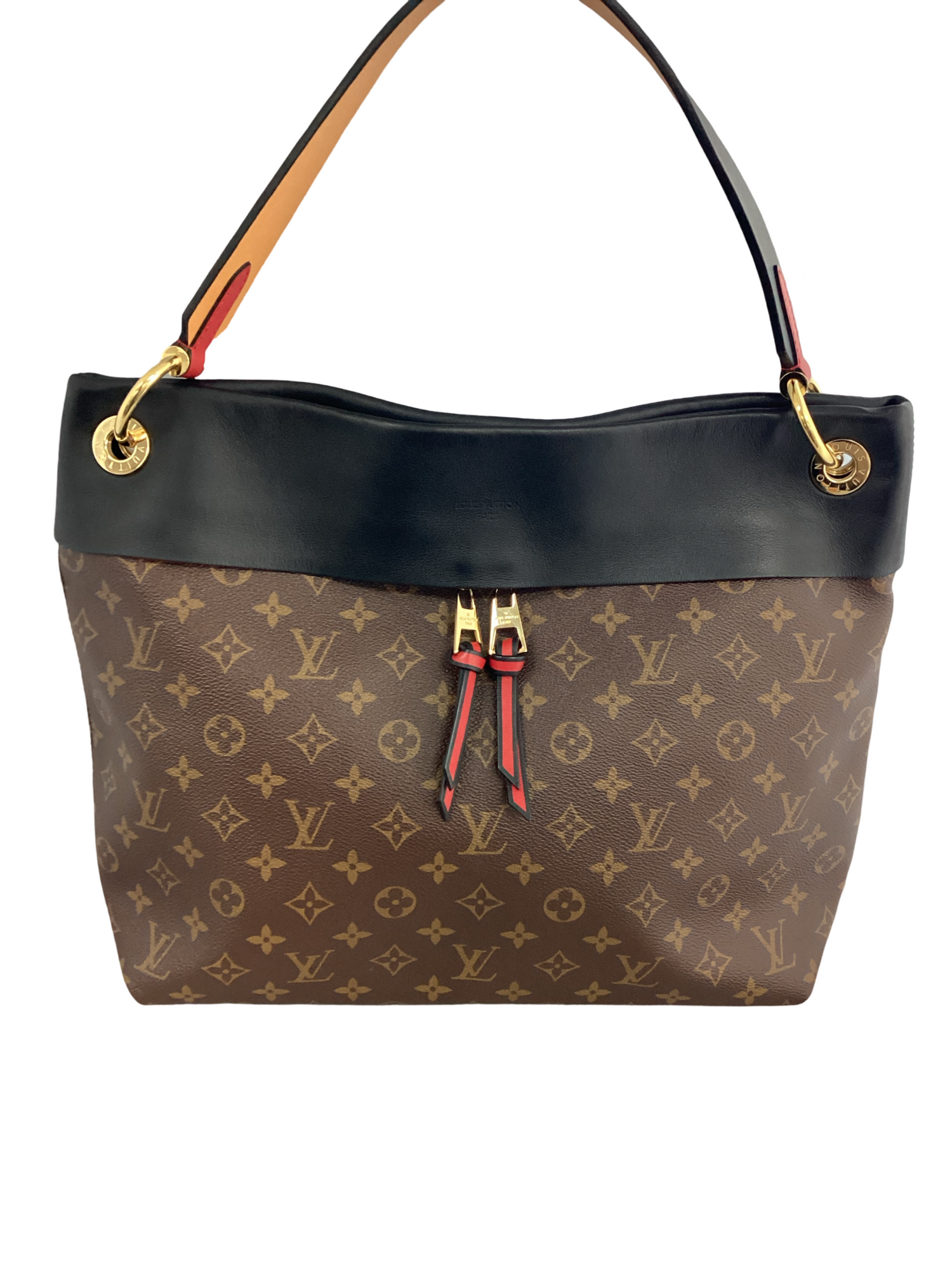Louis Vuitton Monogram Tuileries Hobo Black with gold-toned hardware, crafted of Louis Vuitton monogram coated toile canvas in brown with black and red leather accents, exterior zipper pockets, a leather top handle and a magnetic snap closure. Interior features a red microfiber interior with 3 patch pockets.