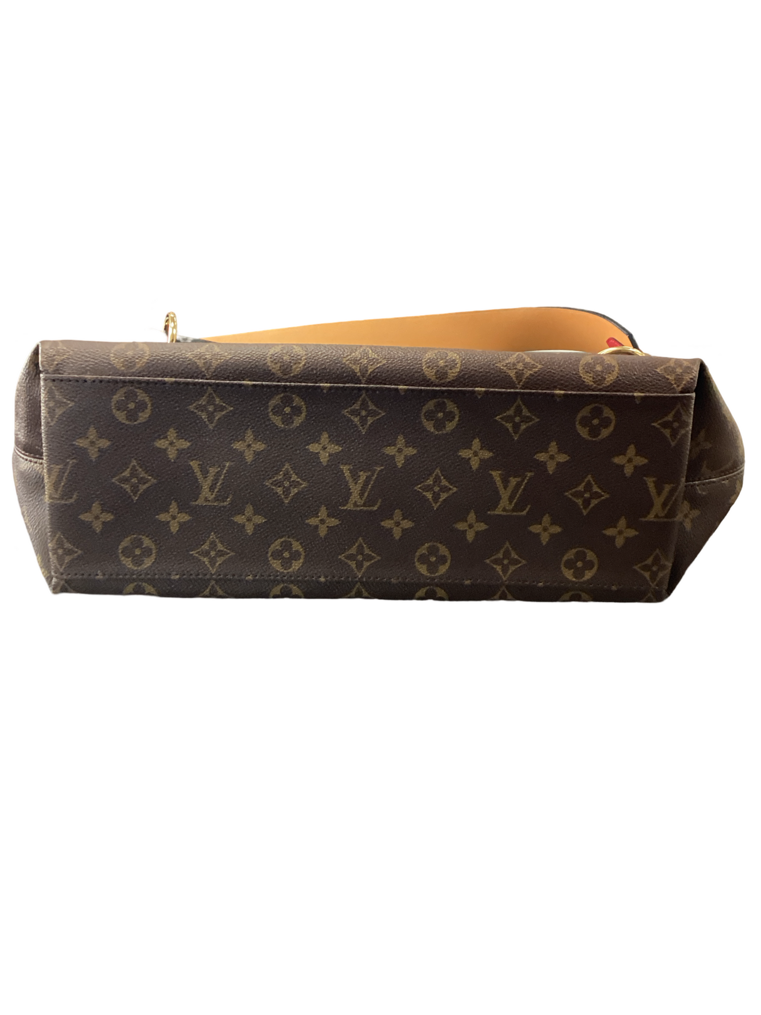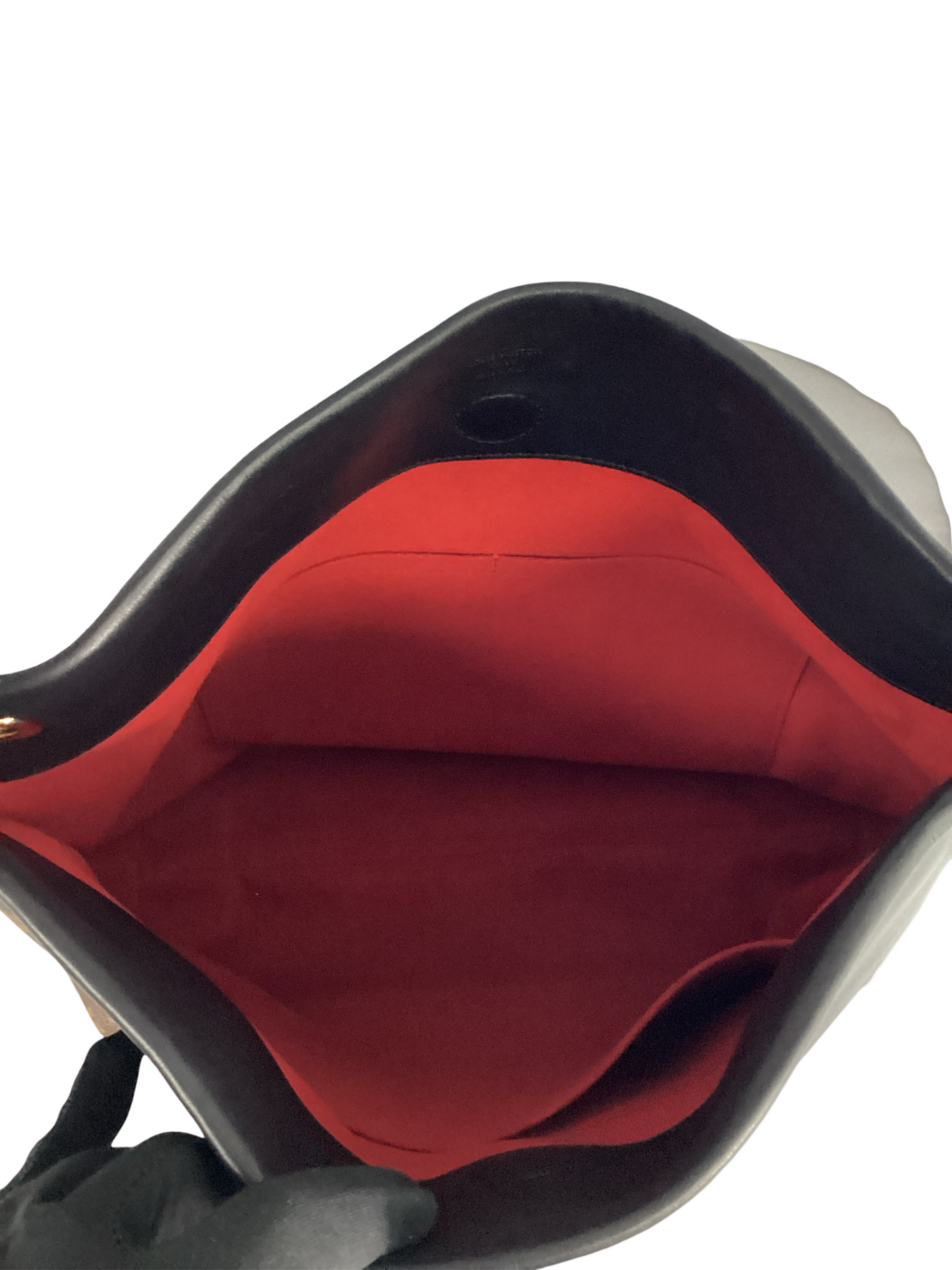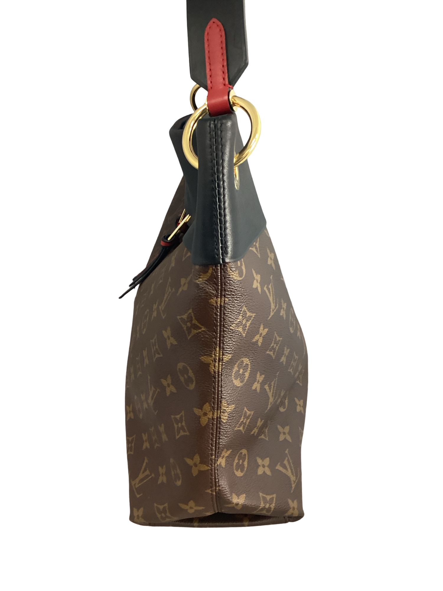 Louis Vuitton Monogram Tuileries Hobo Black with gold-toned hardware, crafted of Louis Vuitton monogram coated toile canvas in brown with black and red leather accents, exterior zipper pockets, a leather top handle and a magnetic snap closure. Interior features a red microfiber interior with 3 patch pockets.