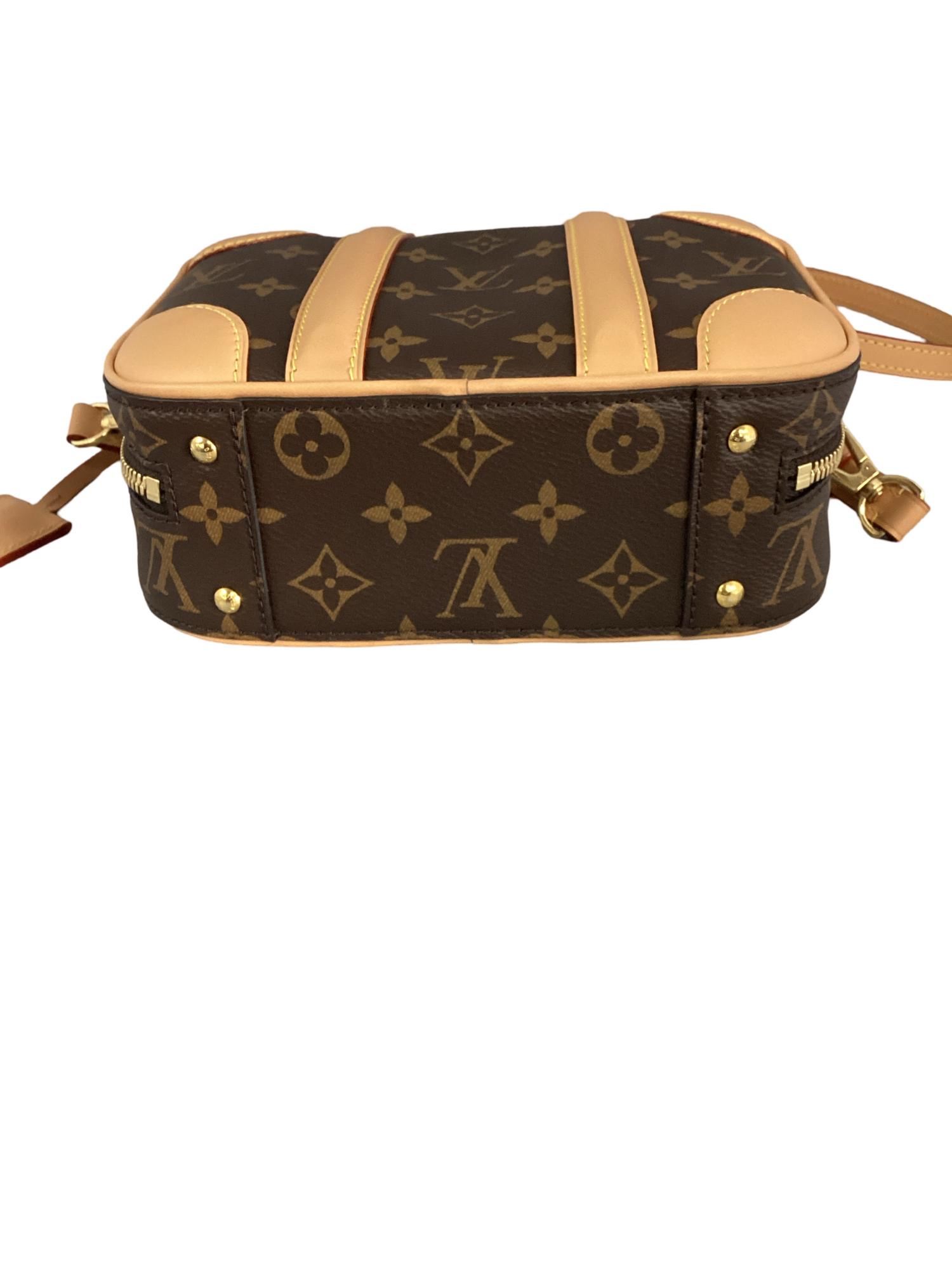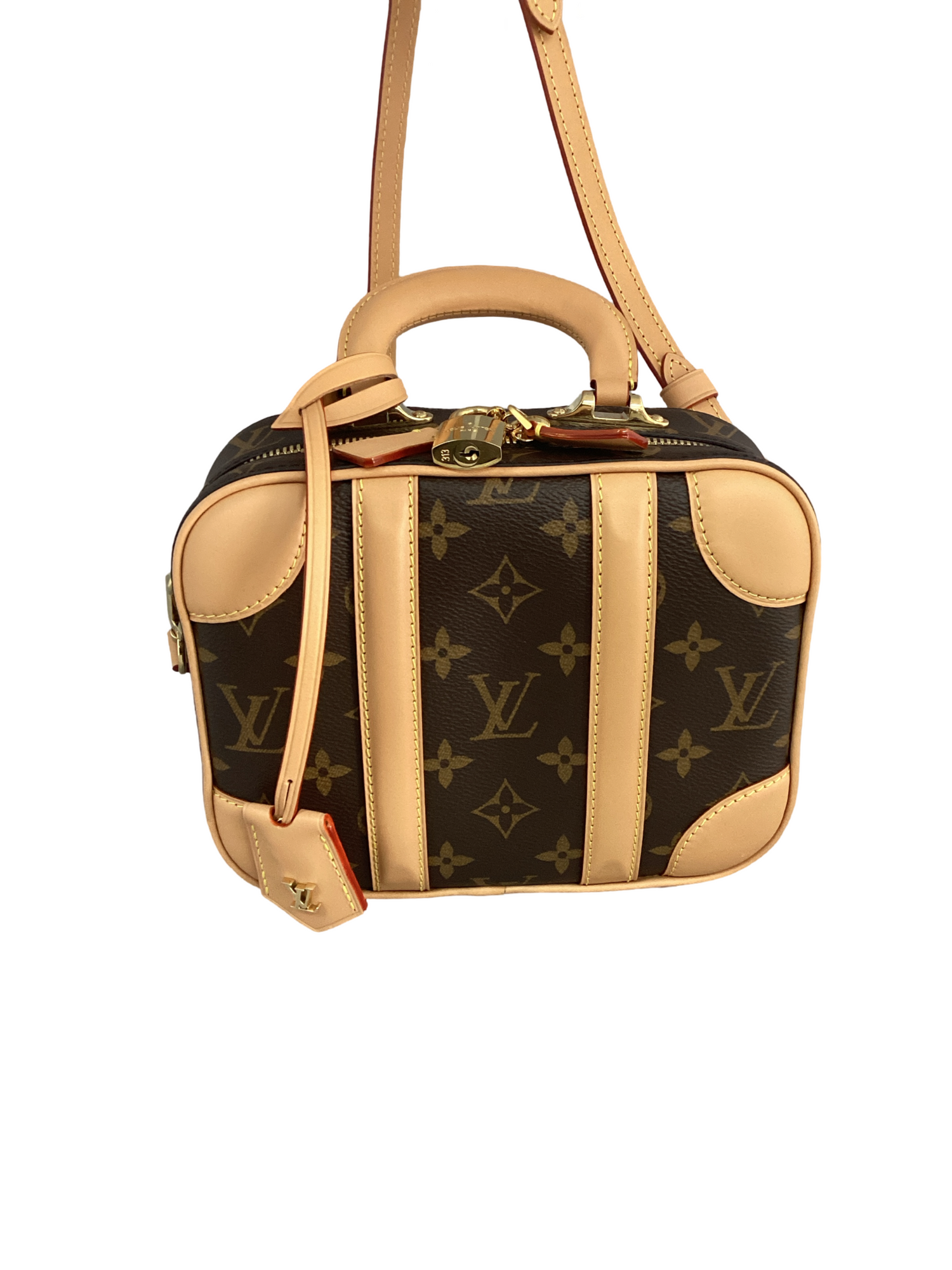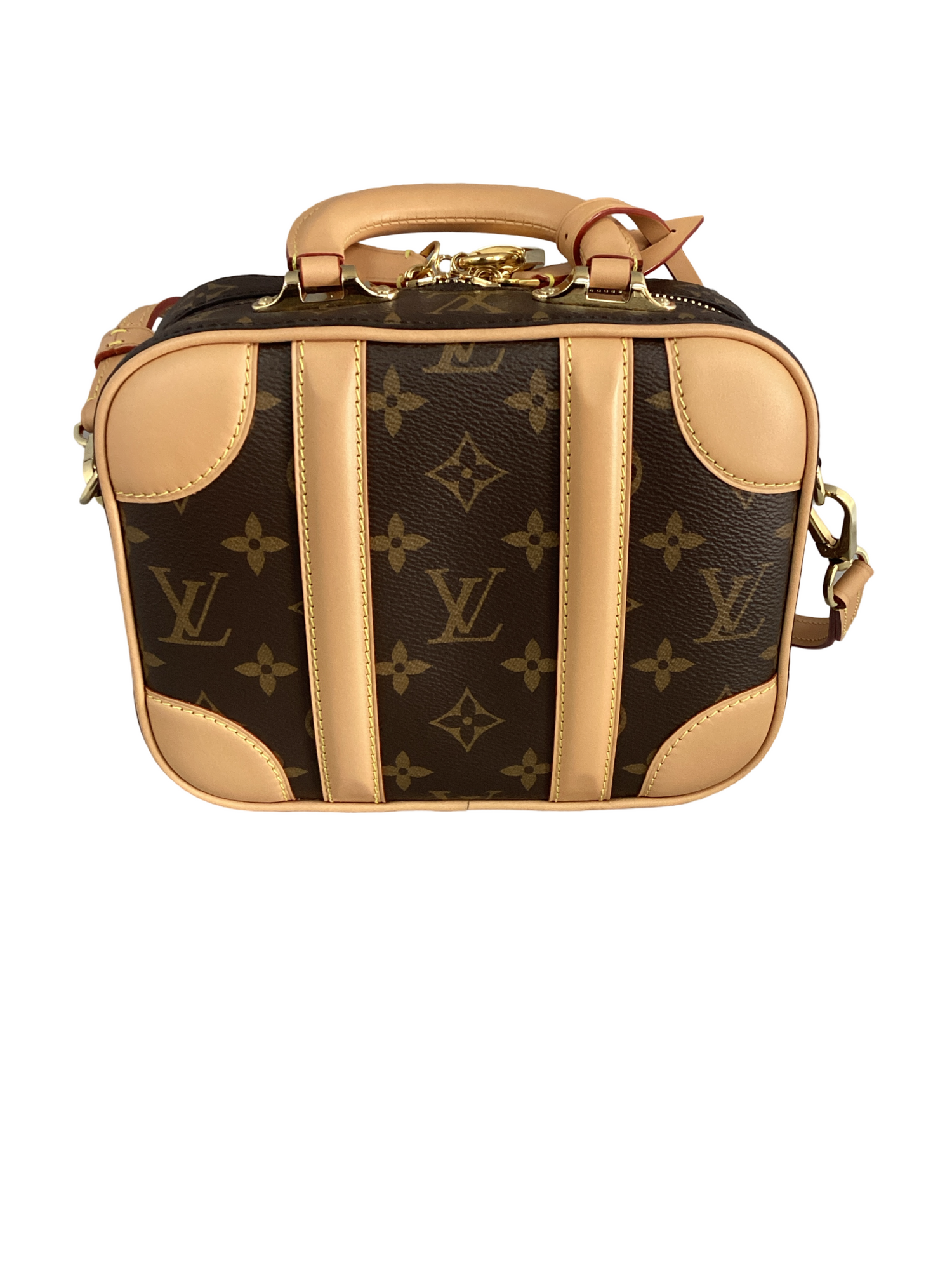 Louis Vuitton Monogram Valisette BB with gold-toned hardware, signature Louis Vuitton monogram on coated canvas, vachetta cowhide leather trim including top handles, an optional adjustable shoulder strap in vachetta leather and top zipper closure. The interior features a microfiber interior with 2 patch pockets.