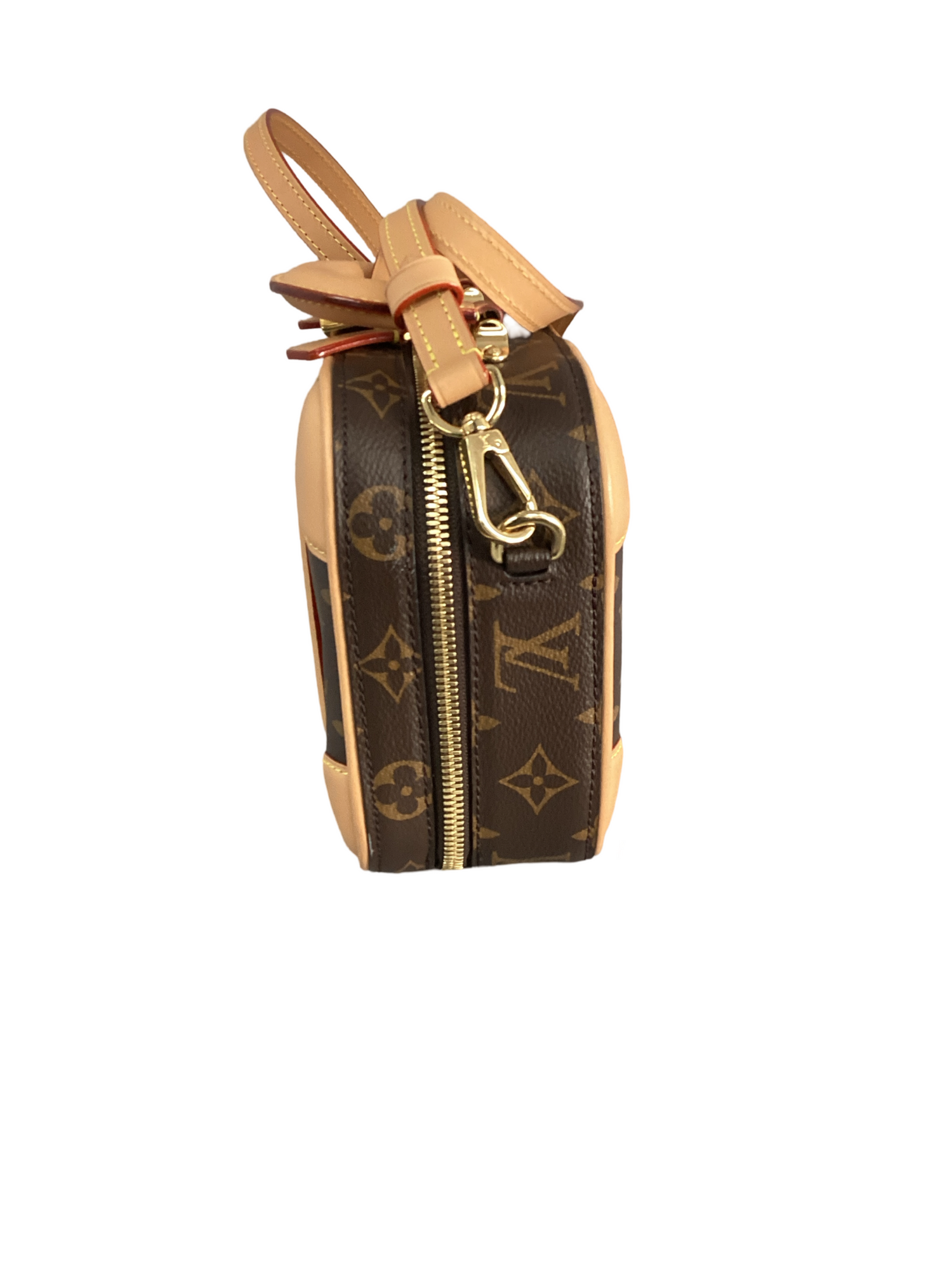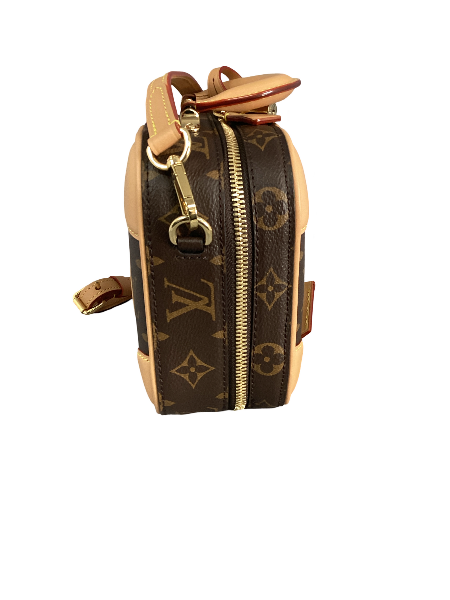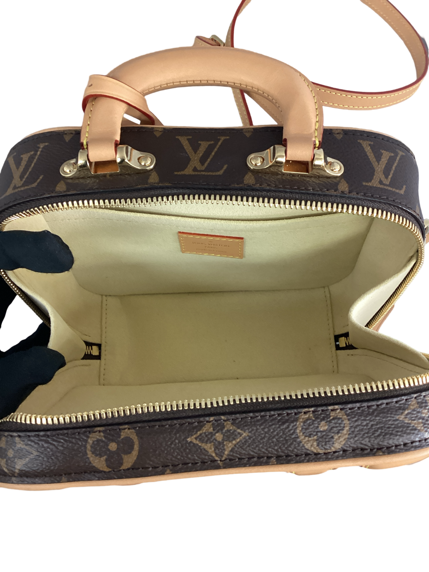 Louis Vuitton Monogram Valisette BB with gold-toned hardware, signature Louis Vuitton monogram on coated canvas, vachetta cowhide leather trim including top handles, an optional adjustable shoulder strap in vachetta leather and top zipper closure. The interior features a microfiber interior with 2 patch pockets.