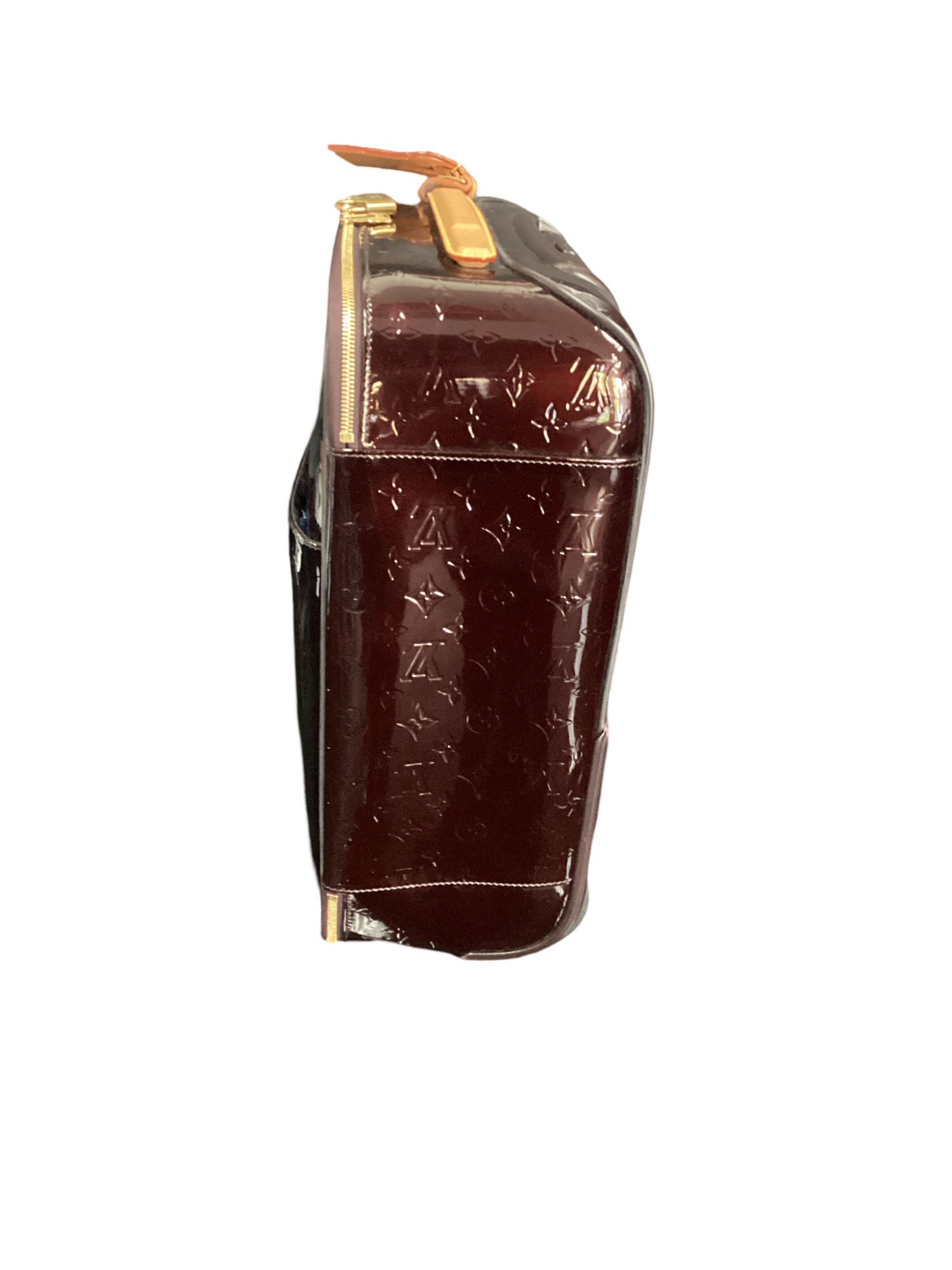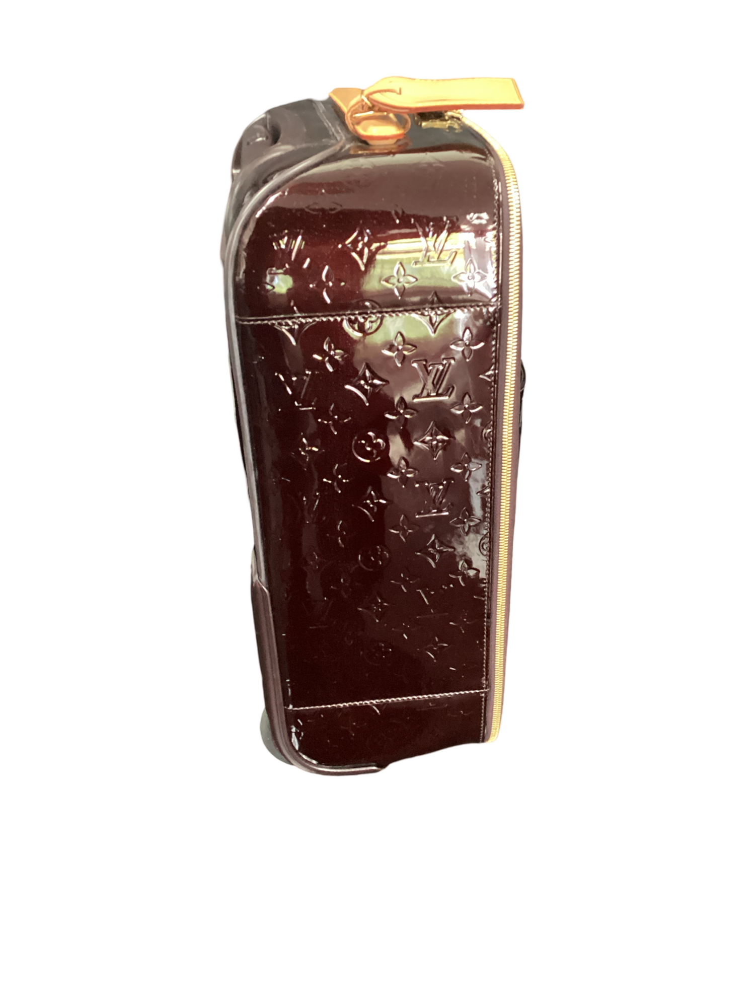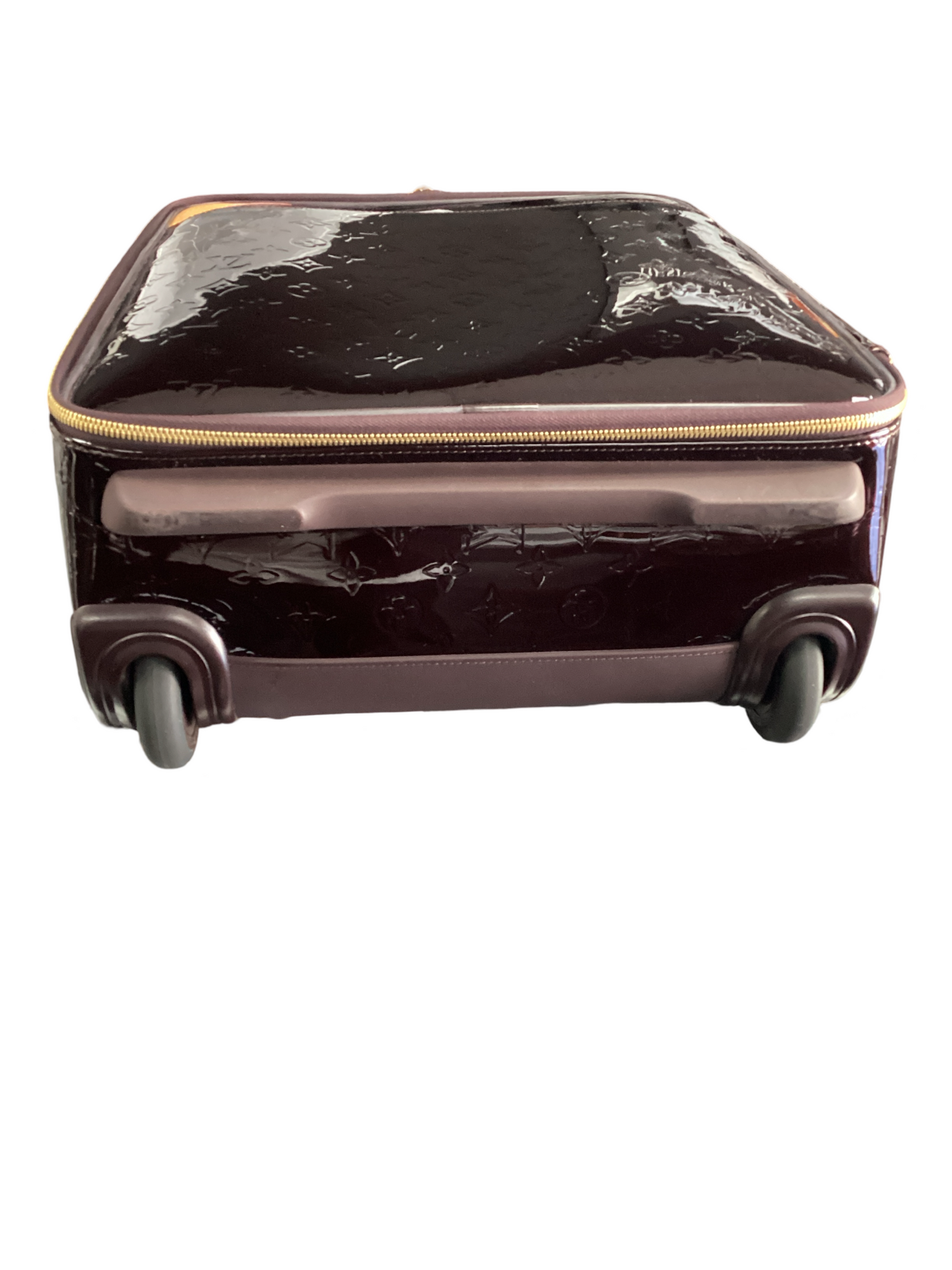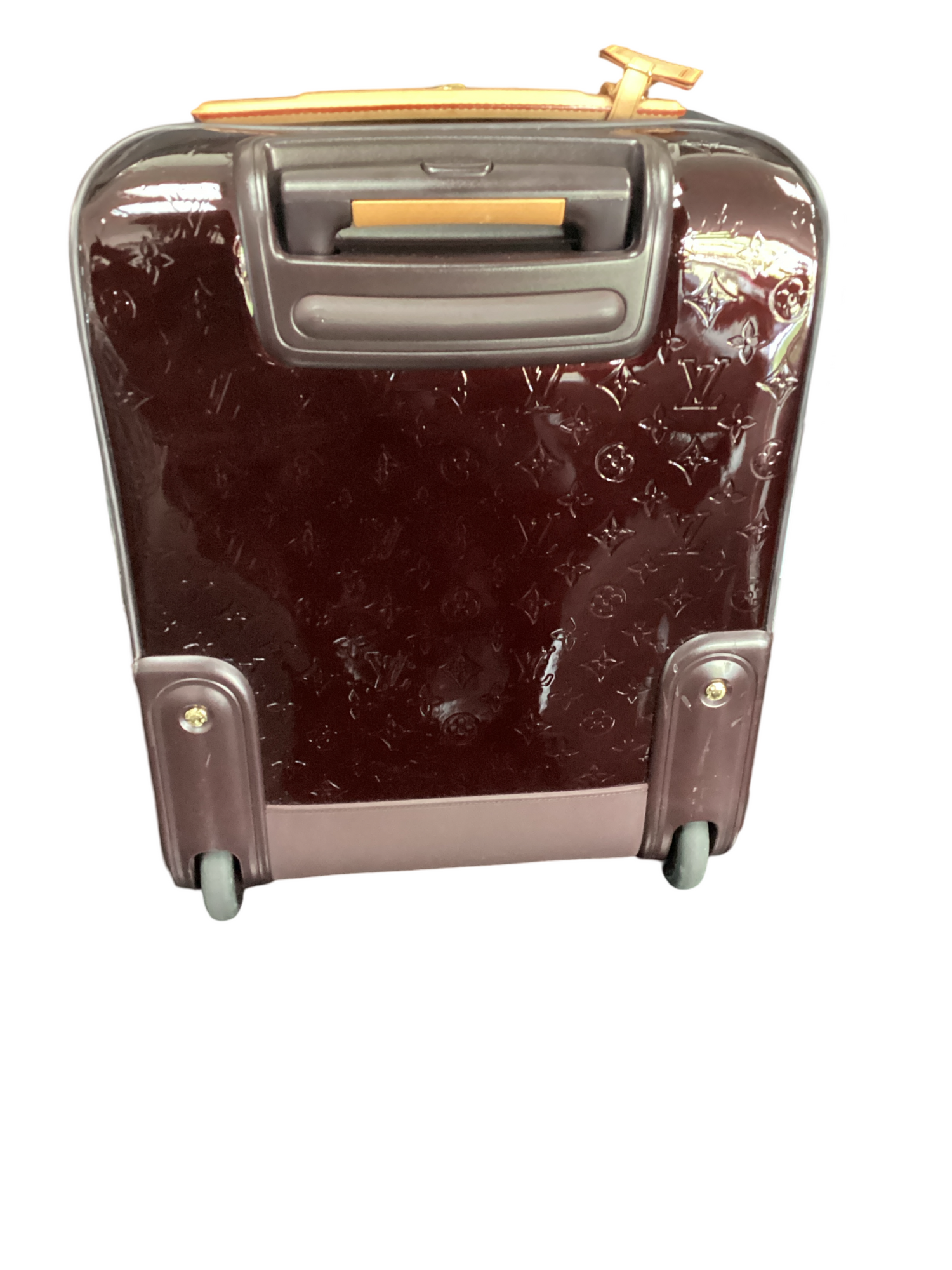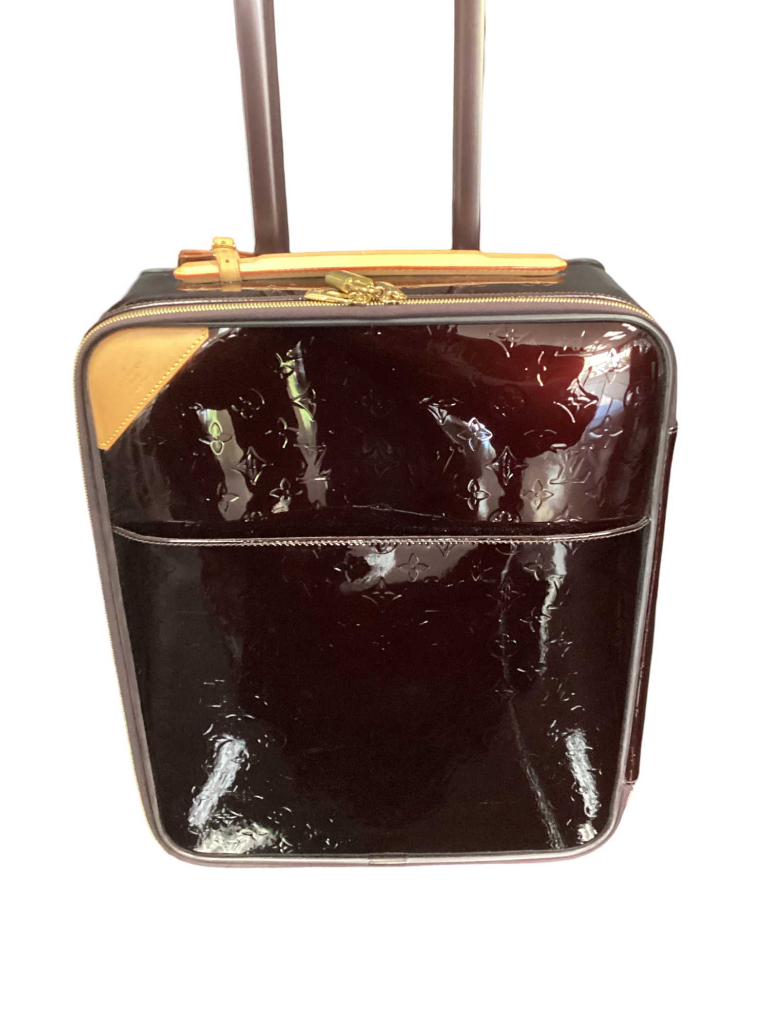 Louis Vuitton Monogram Vernis Pegase 45 with gold-toned hardware, vernis burgundy red leather, vachetta leather trim, padlock at zip handle, two wheels at base, top telescopic handle, top structured handle, exterior front slit pocket and two-way zip-around closures. Interior features a canvas interior lining, four interior zip pockets.