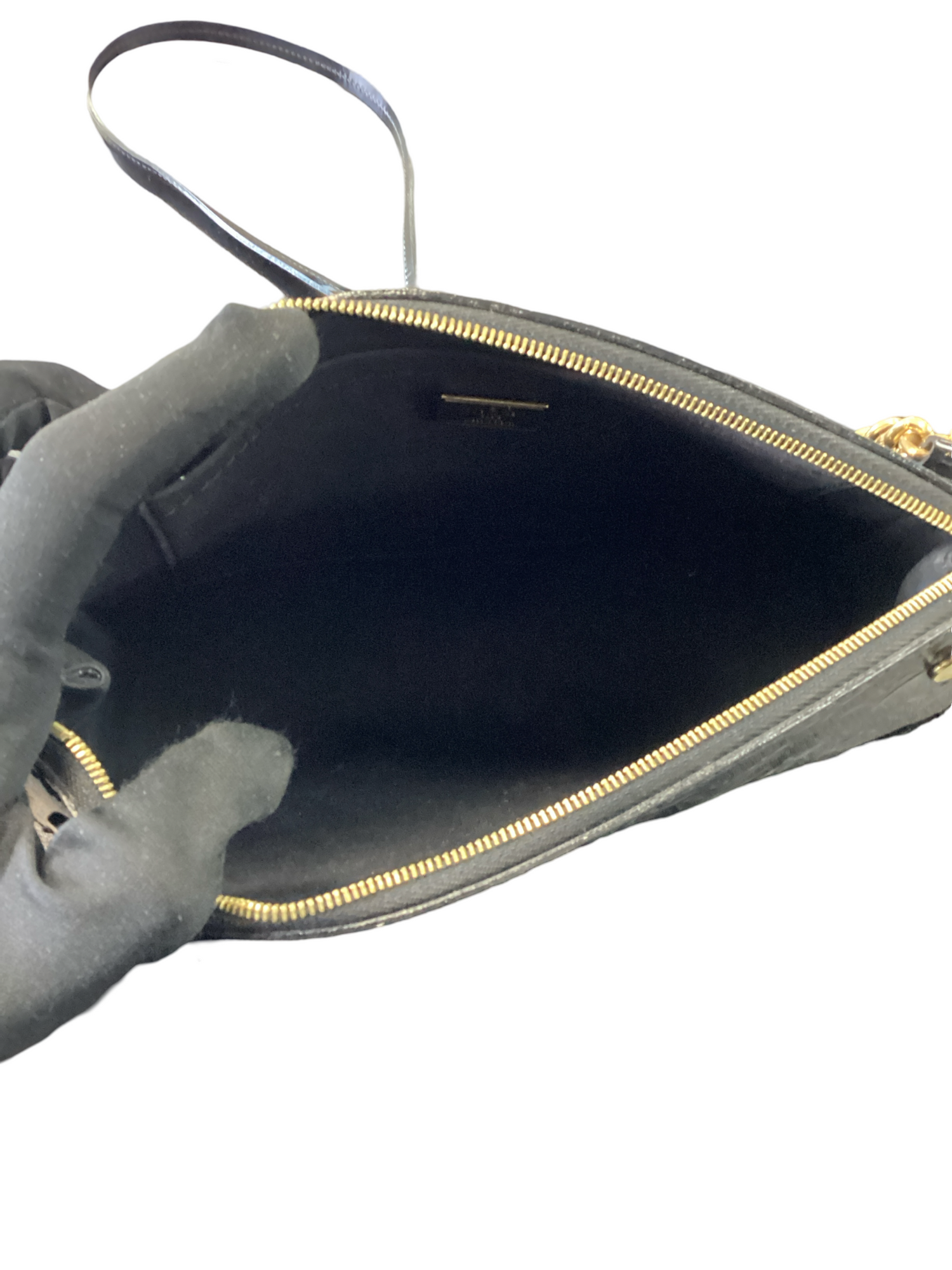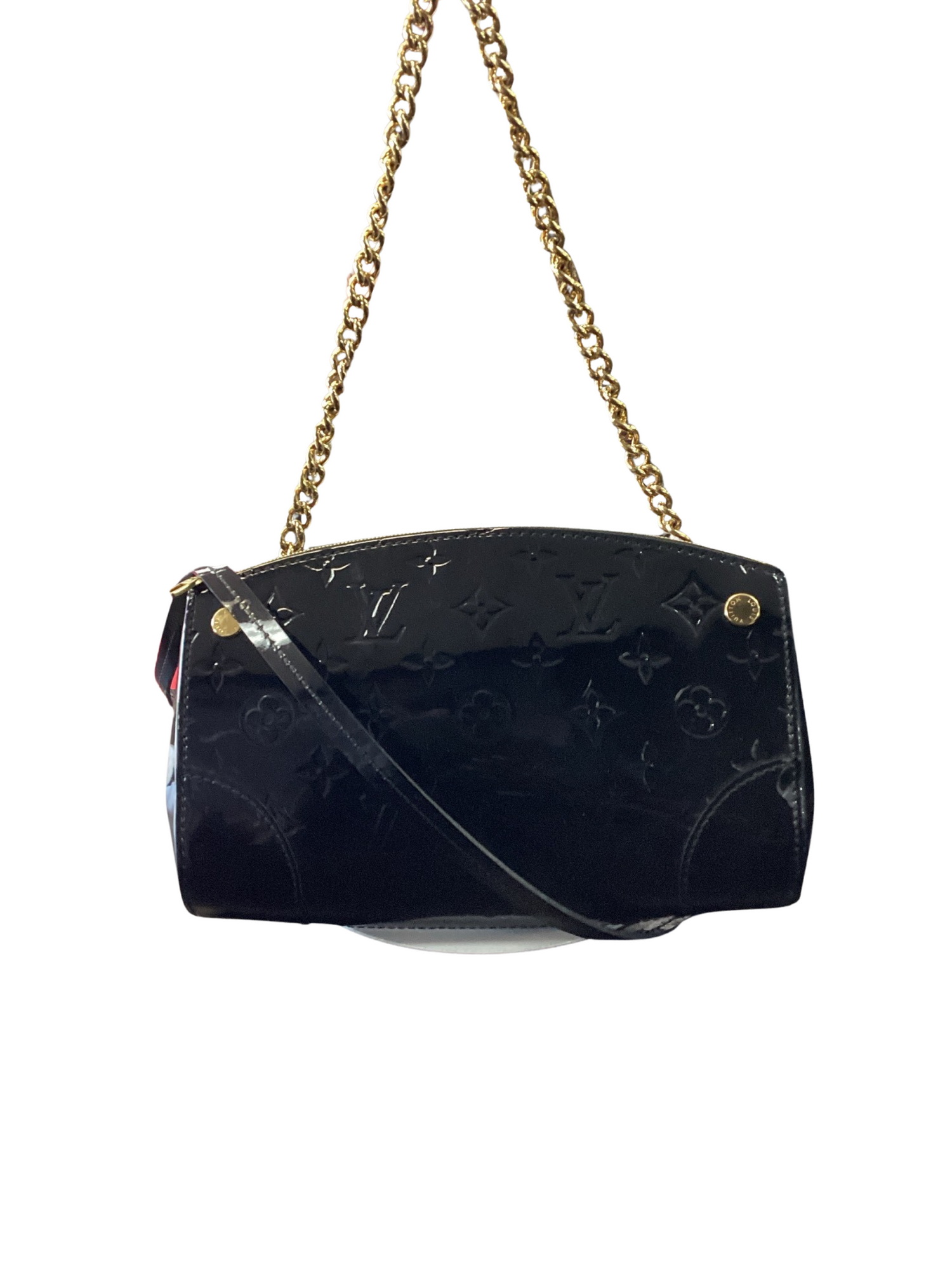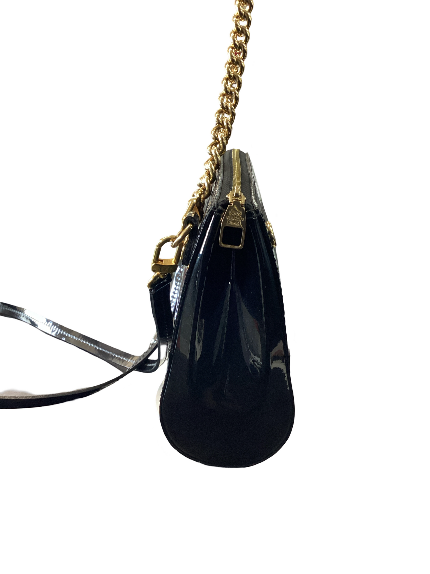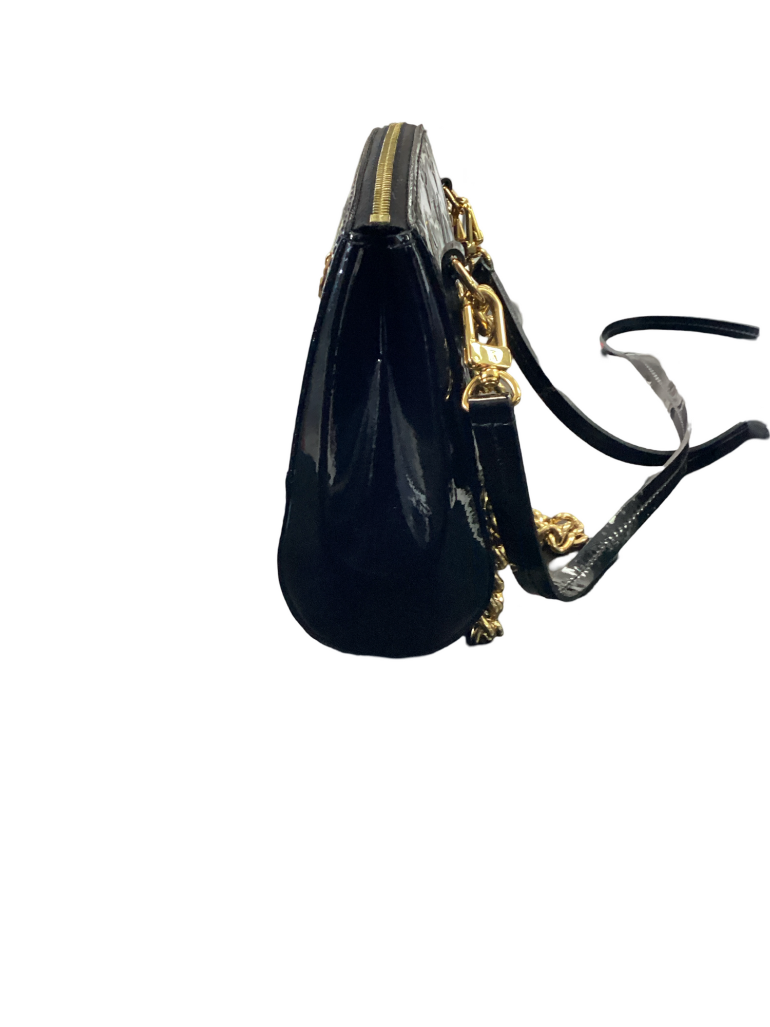Louis Vuitton Monogram Vernis Santa Monica Clutch with gold-toned hardware, Louis Vuitton monogram embossed patent leather in black. The bag features a brass chain-link strap, an optional leather shoulder strap, and top zipper closure. Interior features matching black fabric interior with a patch pocket.