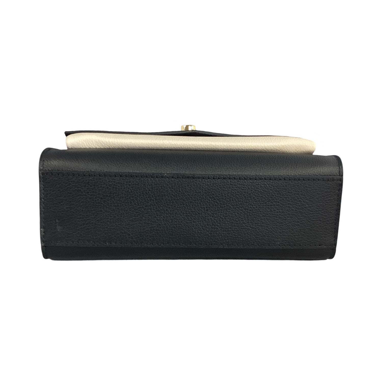 Louis Vuitton Mylock Me Chain Bag in Blk/Creme with gold-toned hardware, a stylish soft handbag is crafted of supple calfskin leather in black and creme, a gold-toned chain and leather shoulder strap and a LV turn-lock closure on the front flap. Interior features a black microfiber interior with a front pocket and patch pocket.