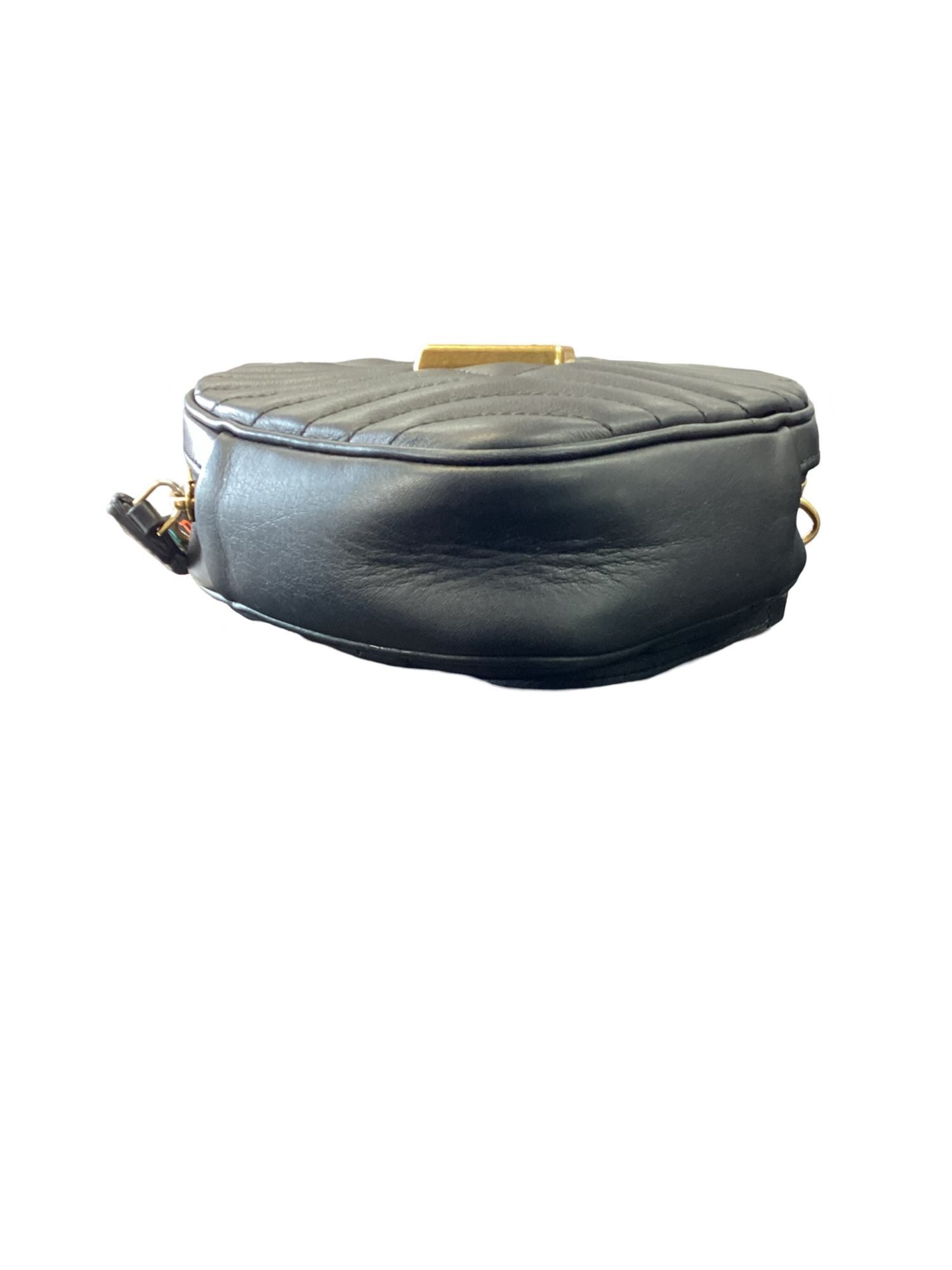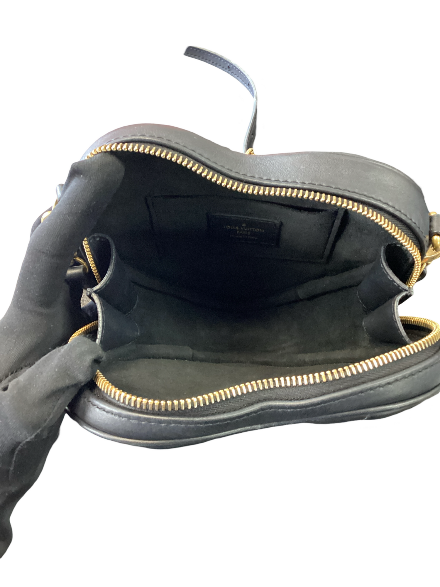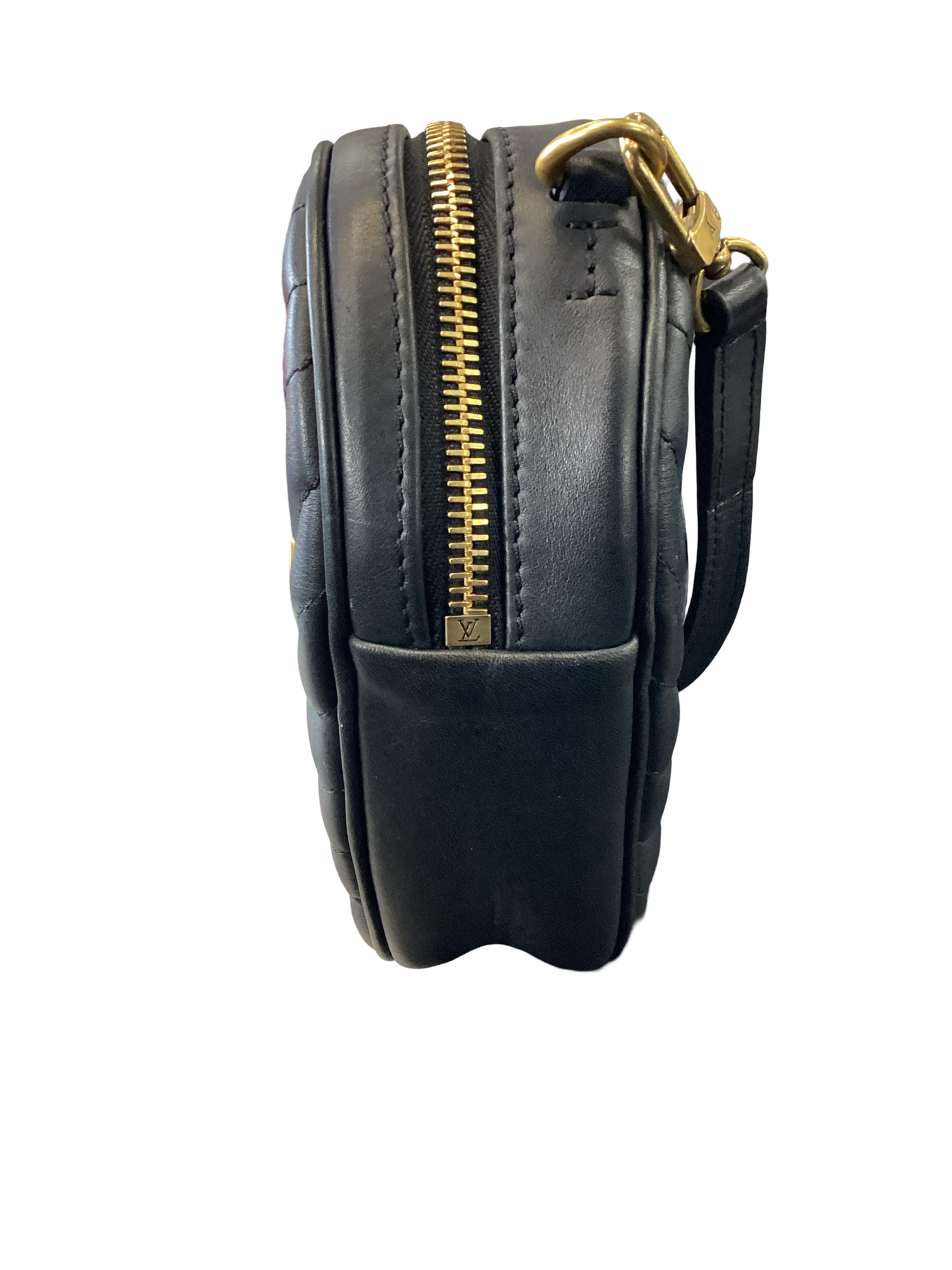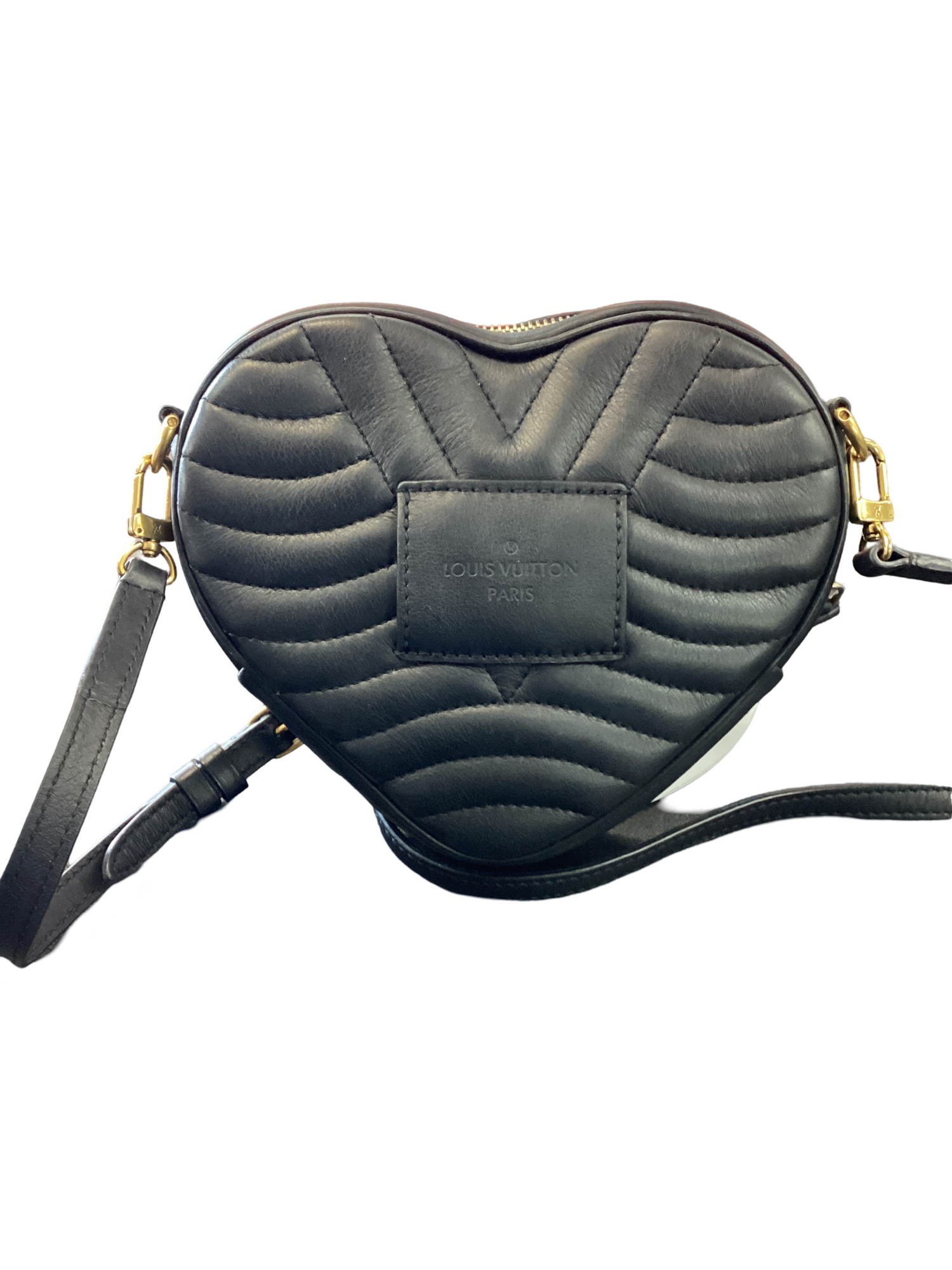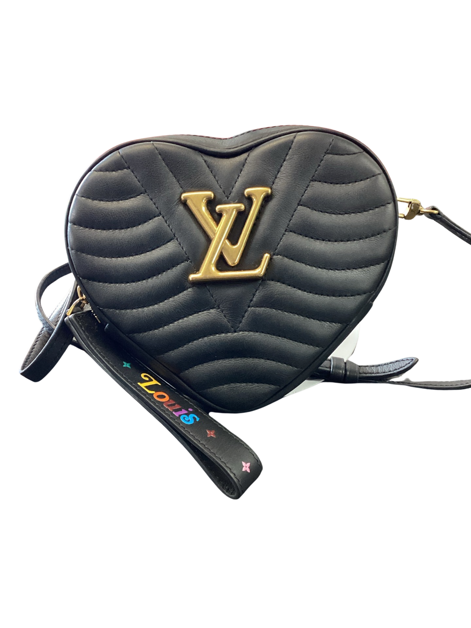 Louis Vuitton New Wave Heart Bag with gold-toned hardware, calfskin leather in black, detachable adjustable leather strap, can be worn with a belt and top zipper closure. Interior features black fabric interior with a patch pocket.