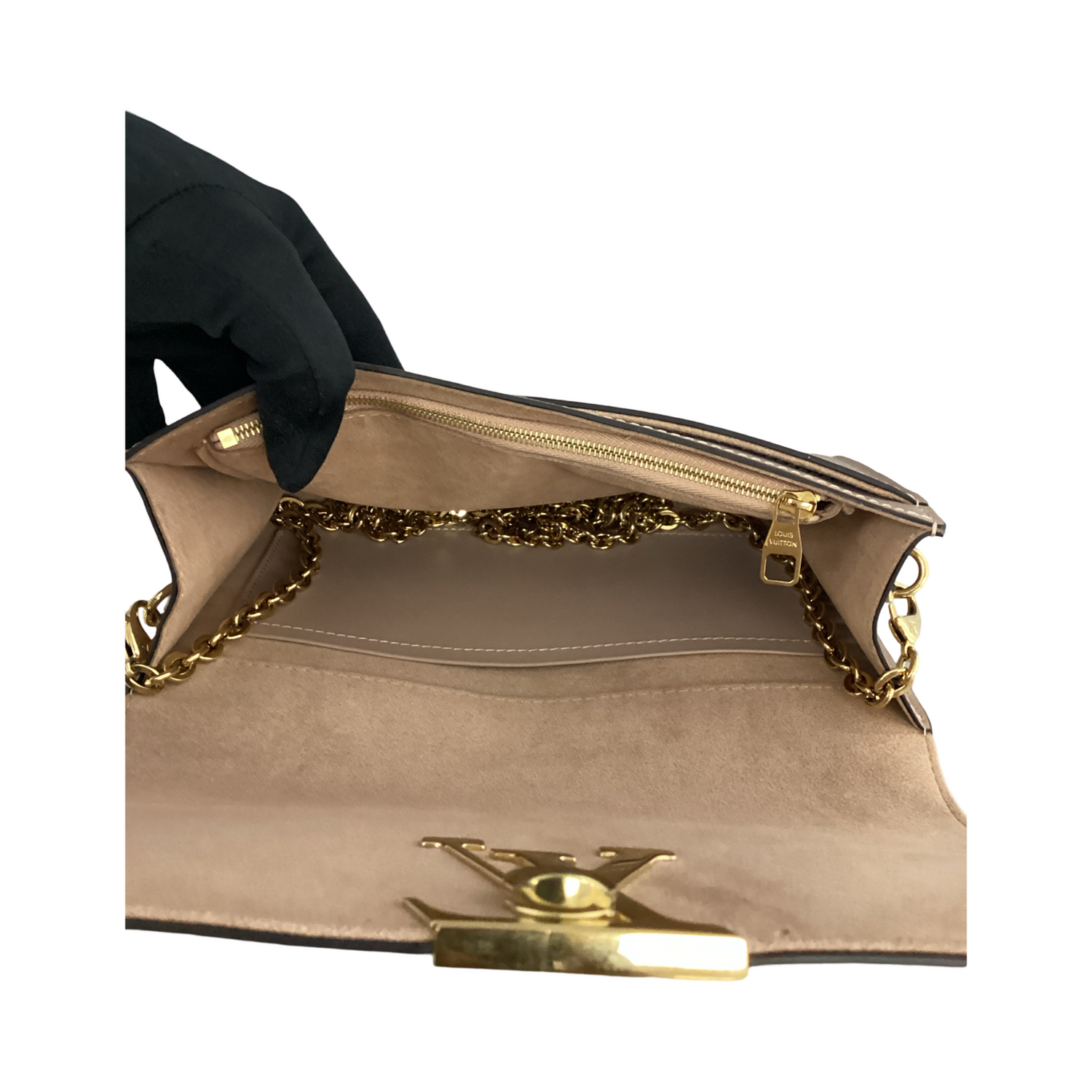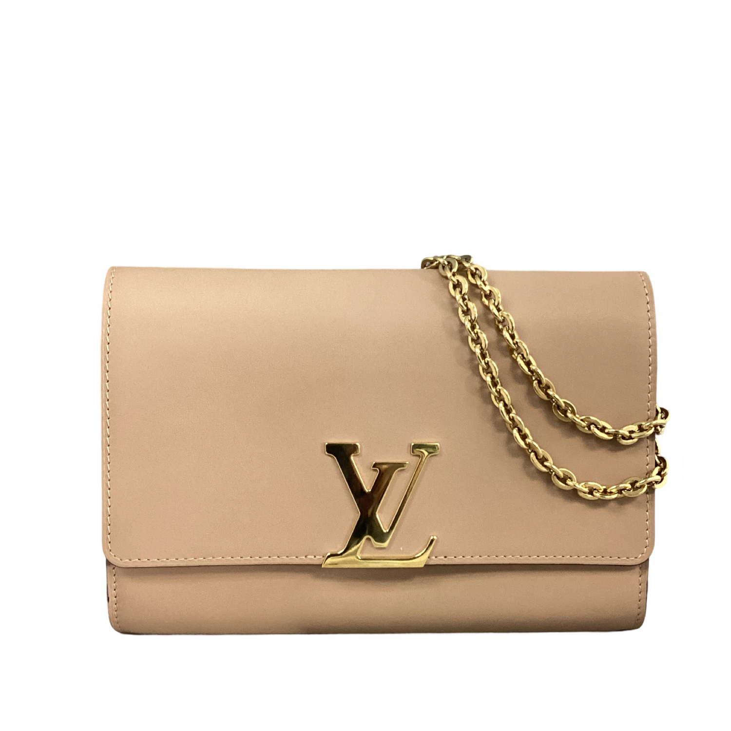 Louis Vuitton-Nude Calfskin Louise GM with gold-toned hardware, a luxurious convertible bag is made of rich calfskin in beige, front flap secures with a snap and tucks into a gold-toned LV hardware accent. Interior features a matching interior with a zipper and an interior and exterior flat pockets.