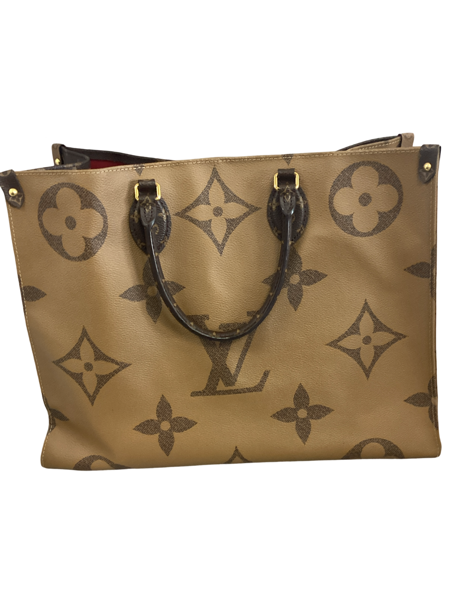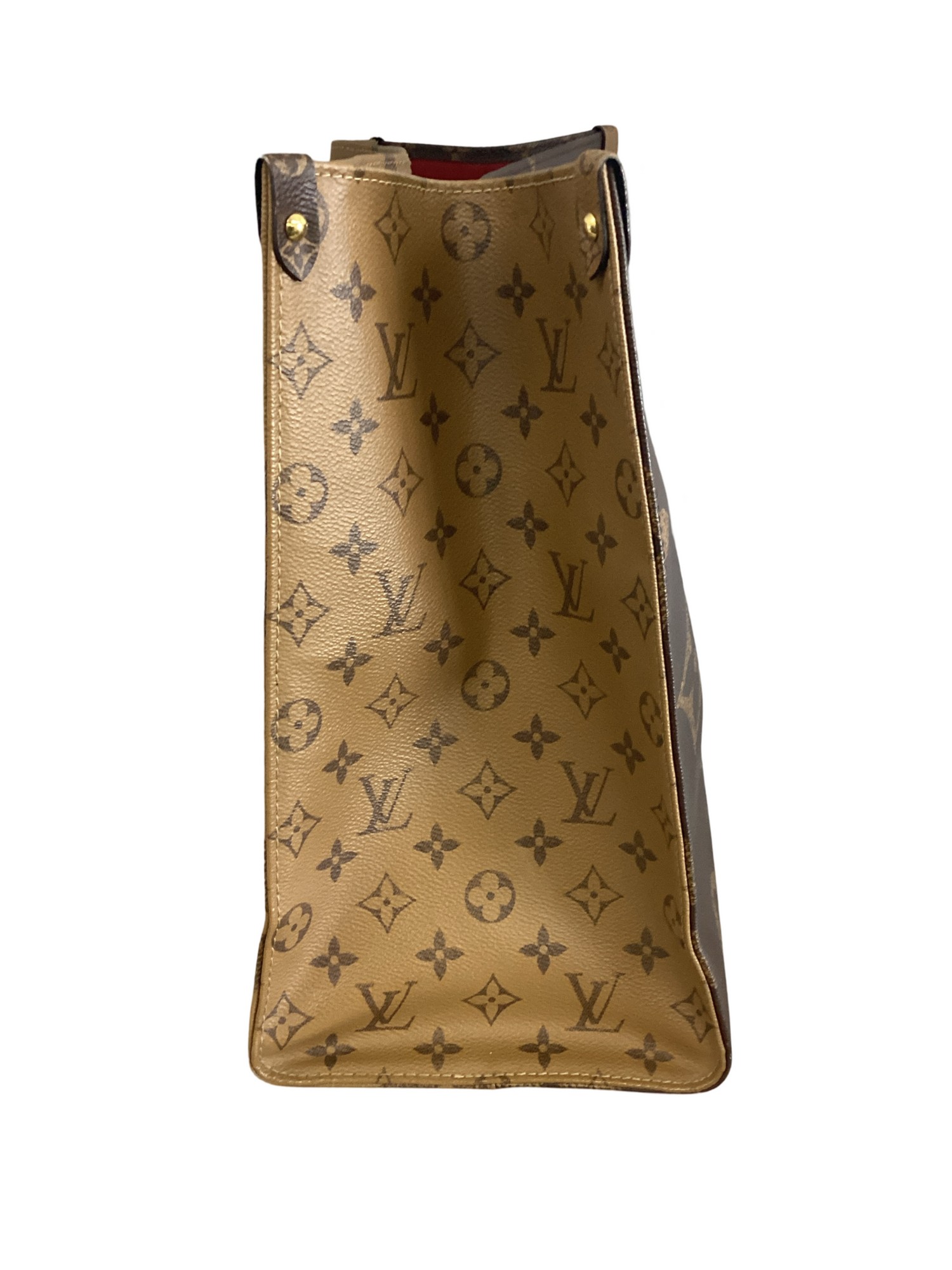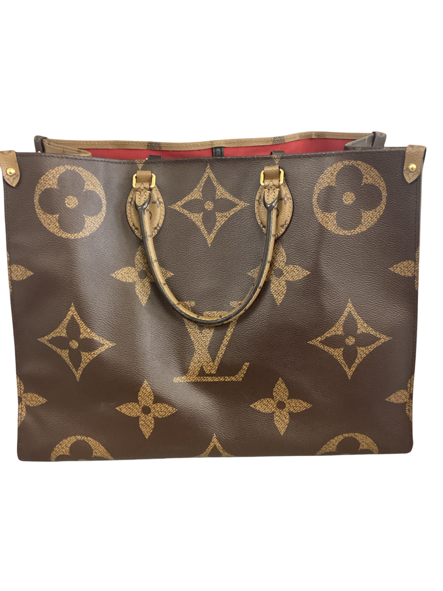 Louis Vuitton On The Go GM with gold-tone hardware, oversized Louis Vuitton monogram canvas in dark and light brown, dual rolled top handles and dual black leather shoulder straps, and a clip hook closure. Interior features a spacious red fabric interior with zipper and patch pockets.