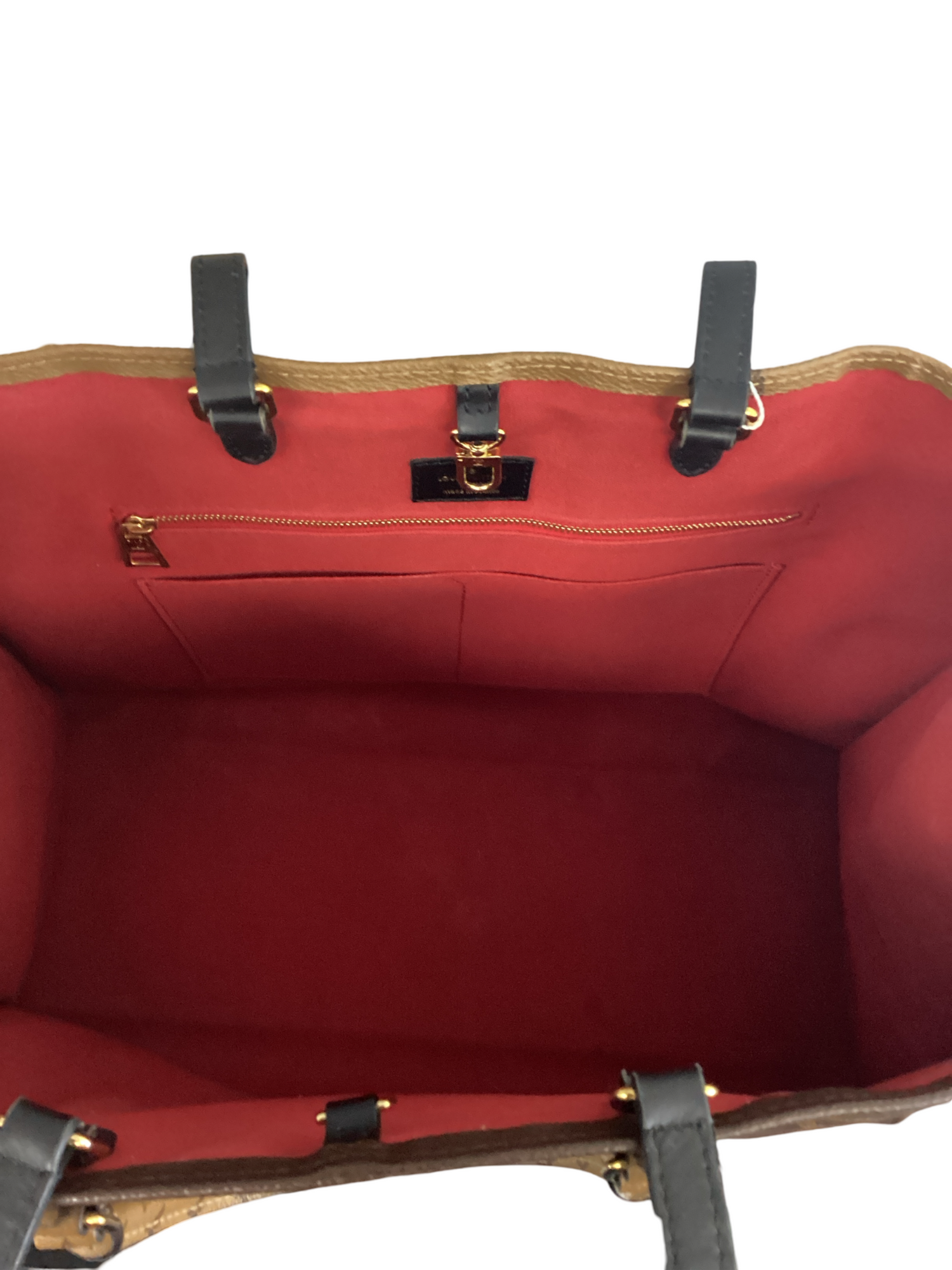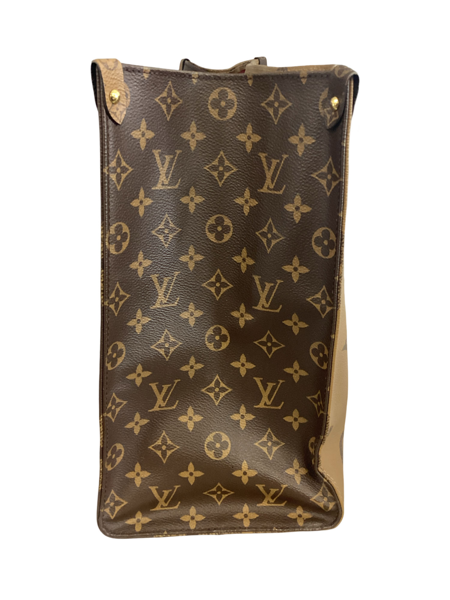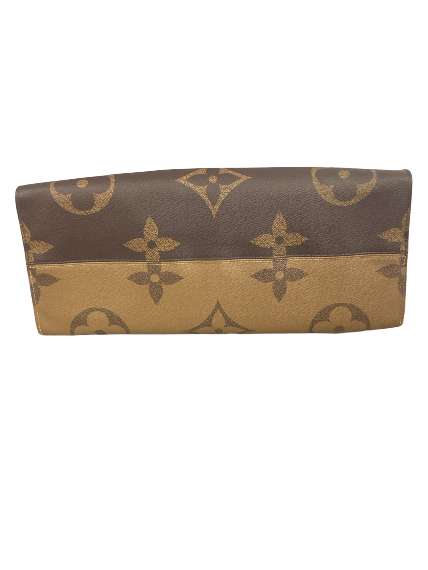 Louis Vuitton On The Go GM with gold-tone hardware, oversized Louis Vuitton monogram canvas in dark and light brown, dual rolled top handles and dual black leather shoulder straps, and a clip hook closure. Interior features a spacious red fabric interior with zipper and patch pockets.