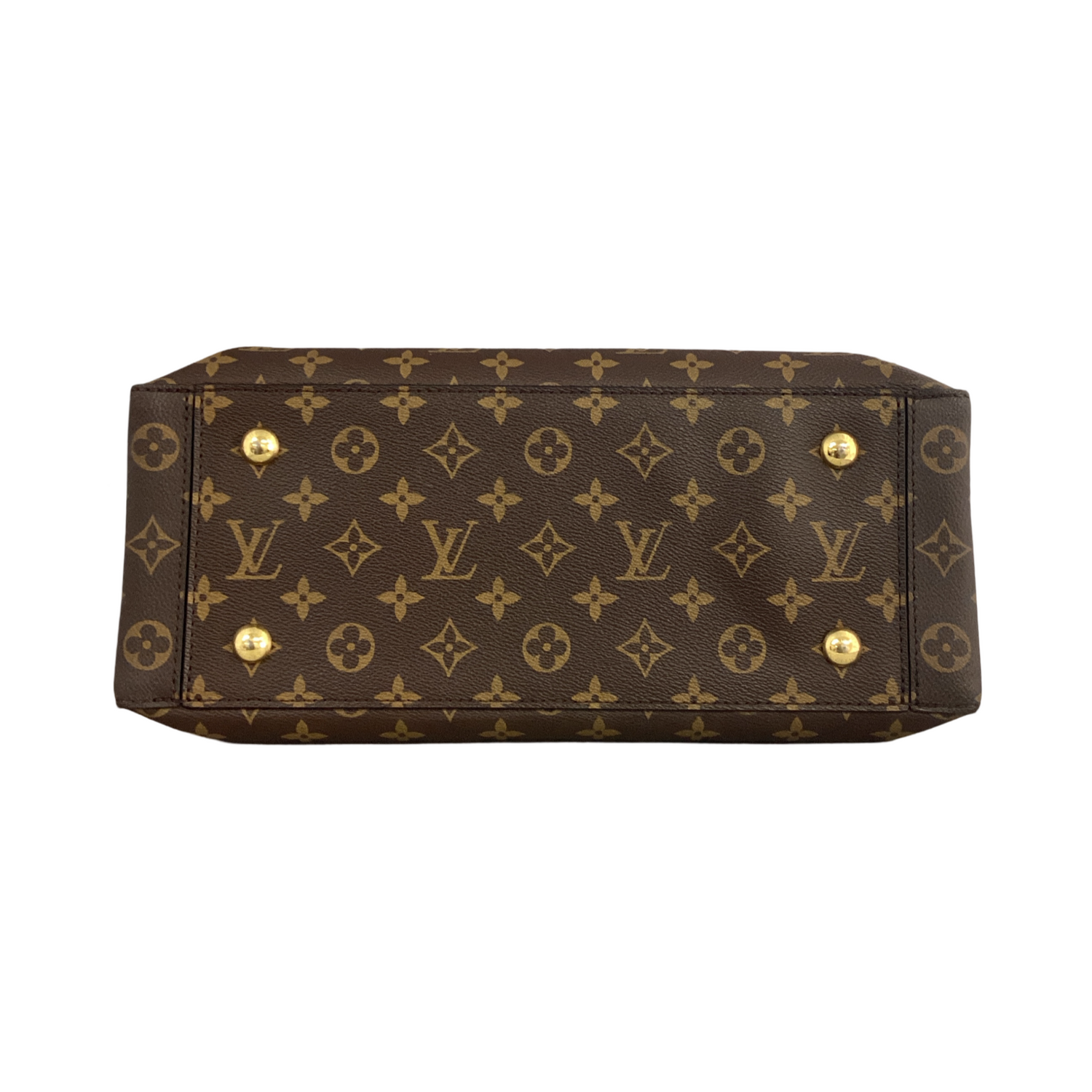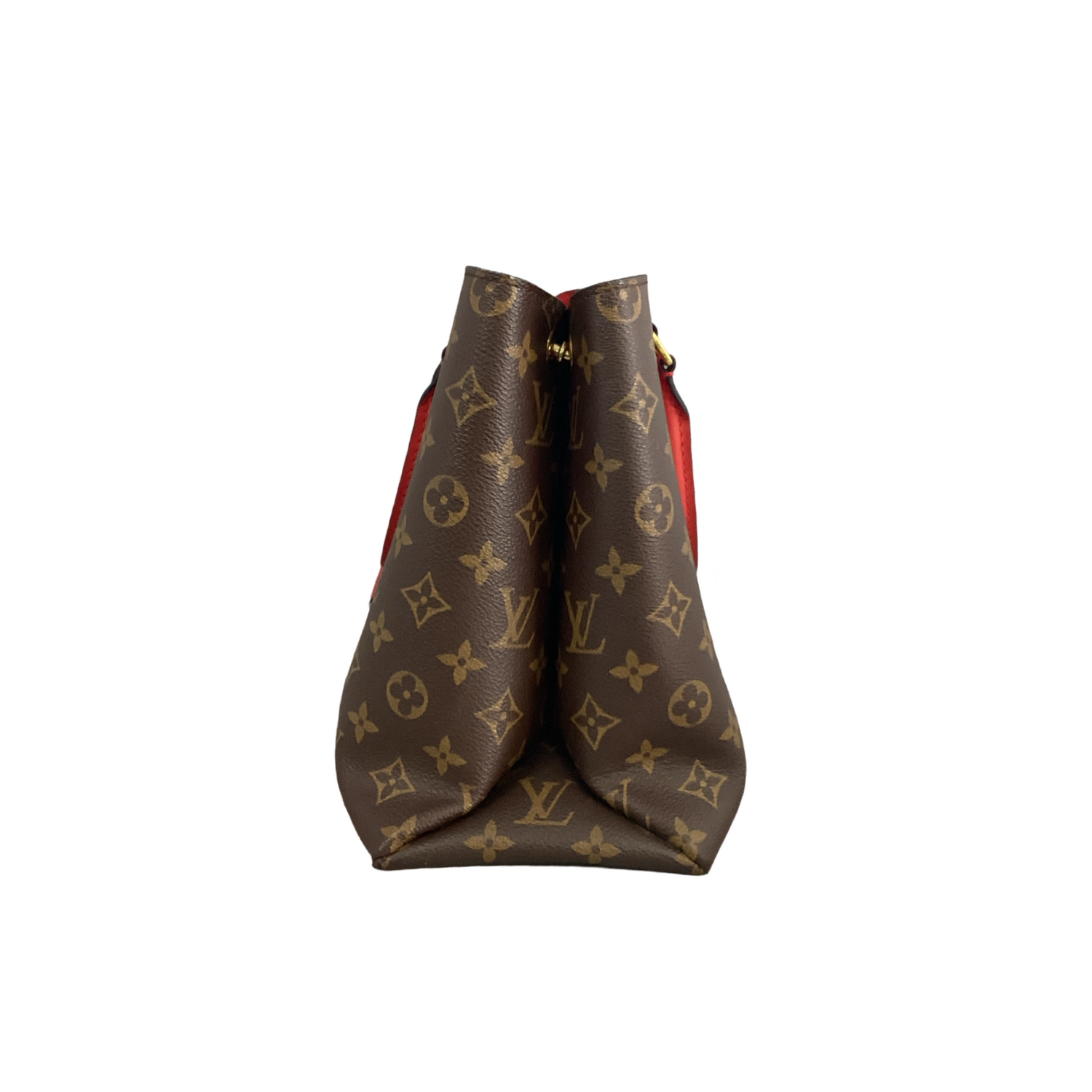 Louis Vuitton-Red Monogram Flower Tote with gold-toned hardware, finely crafted of classic Louis Vuitton monogram coated canvas in brown, rolled red leather top handles, an optional adjustable leather shoulder strap, and a facing turn lock with fleur detail. Interior features red partitioned microfiber interior with a patch pocket and a central leather monogram zipper compartment.