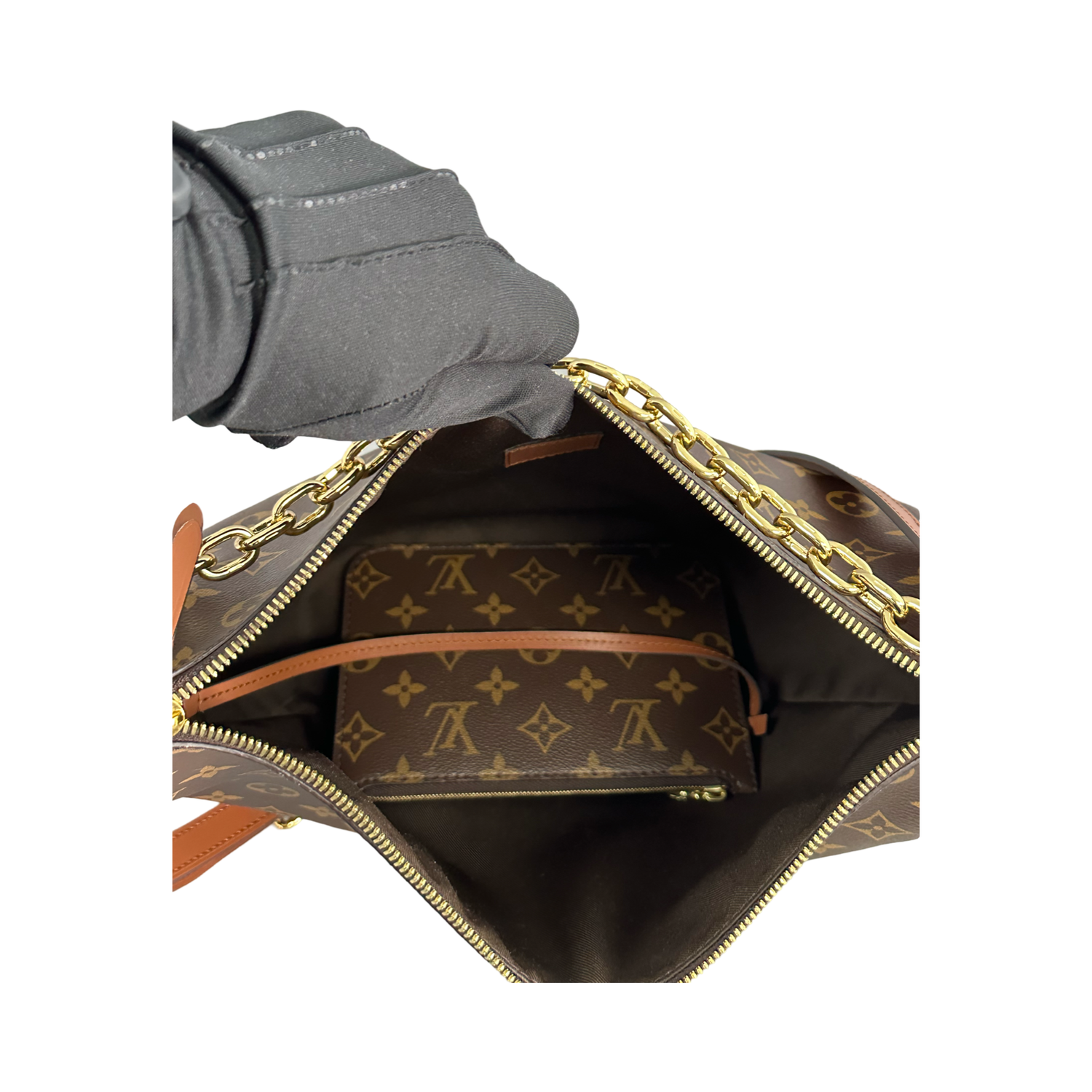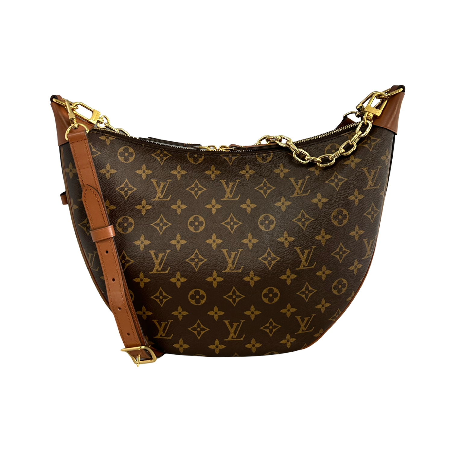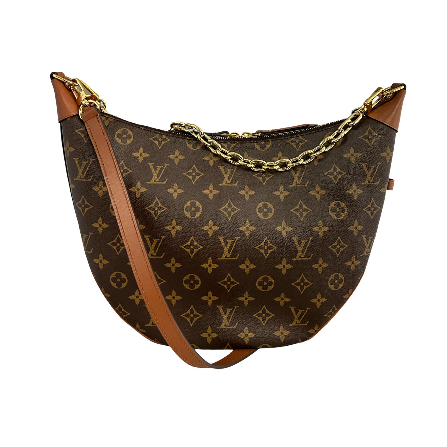 Louis Vuitton Reverse Monogram Loop Hobo GM with gold-toned hardware, crafted of Louis Vuitton monogram-coated canvas, a gold chain strap, an optional detachable and adjustable brown leather shoulder strap, brown leather trim, and top zipper closure. Interior features a brown fabric interior and a matching pochette.