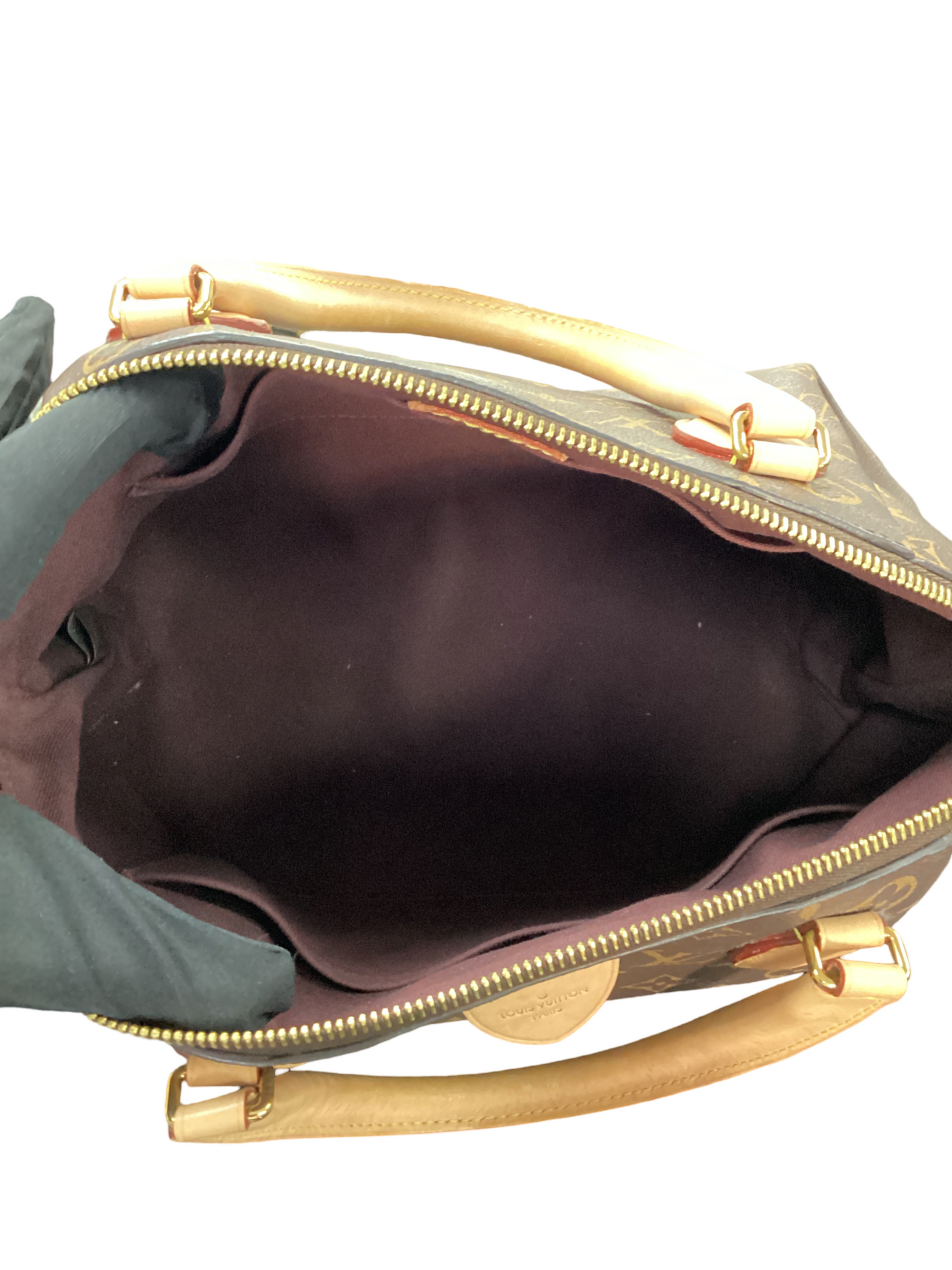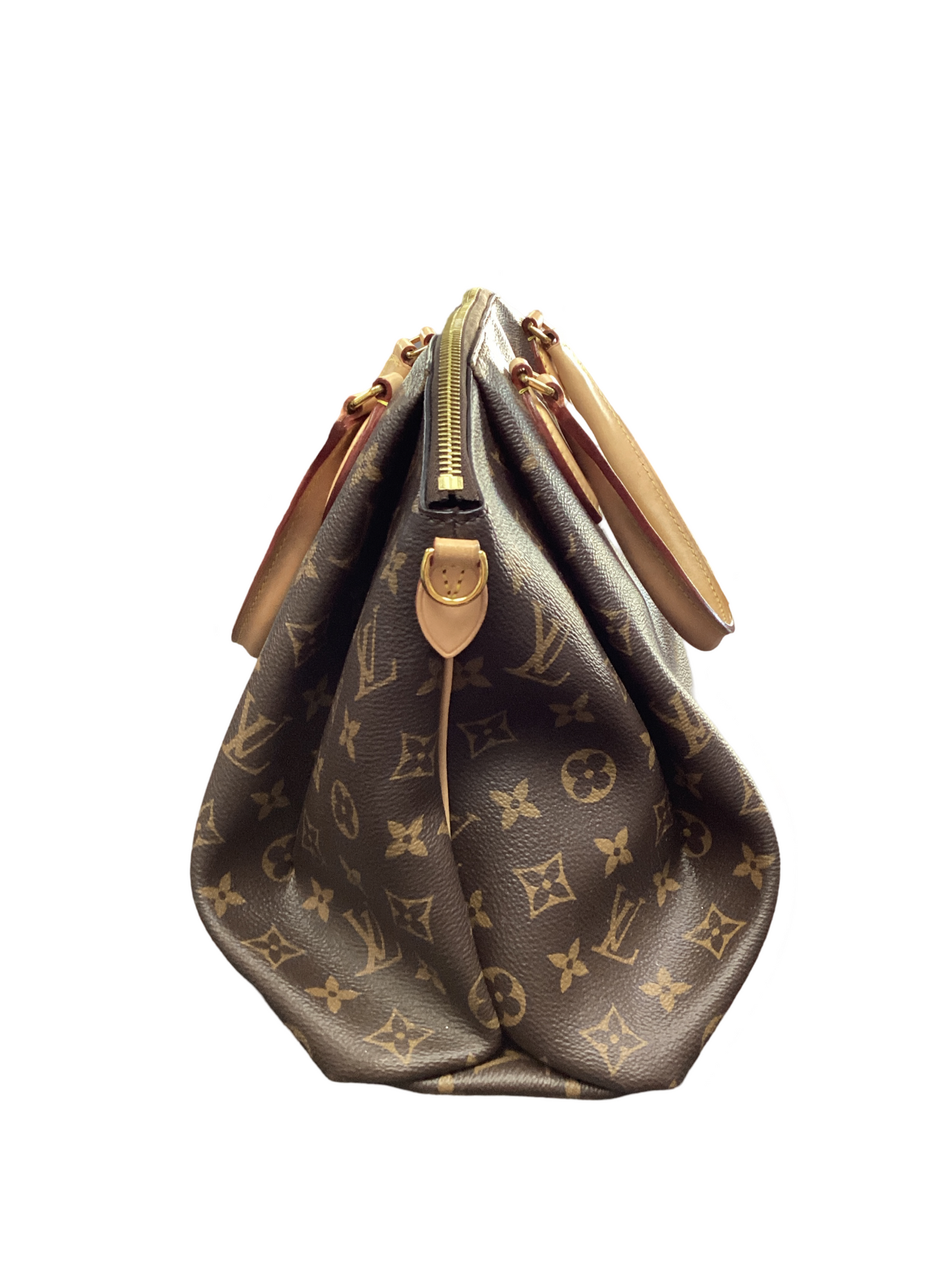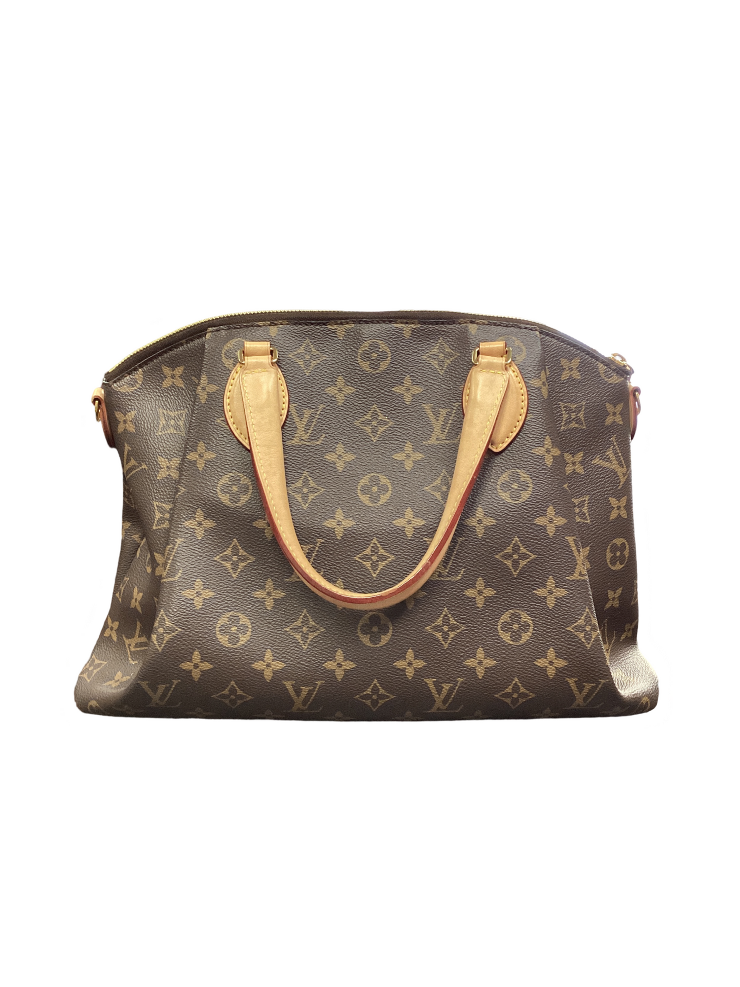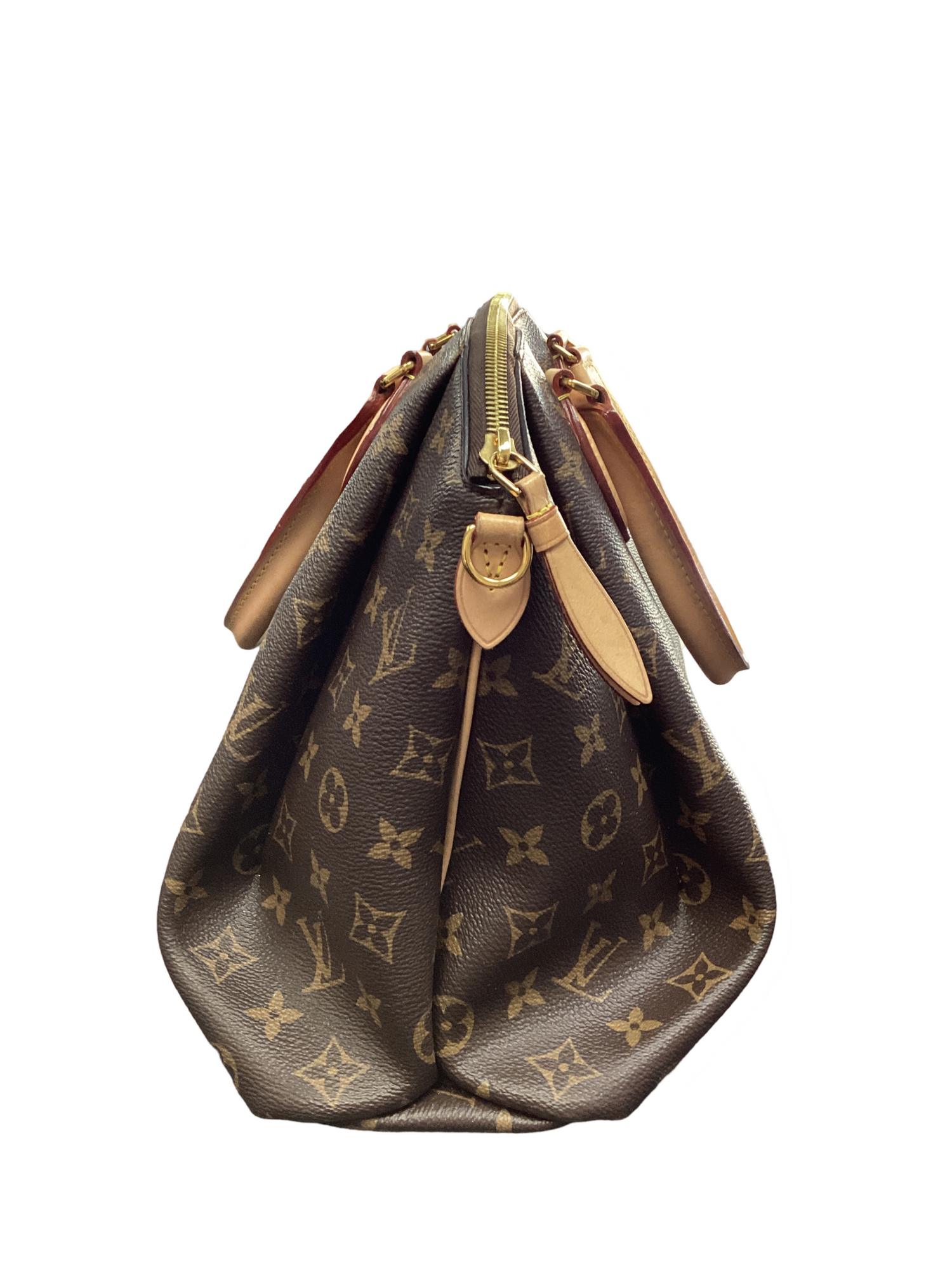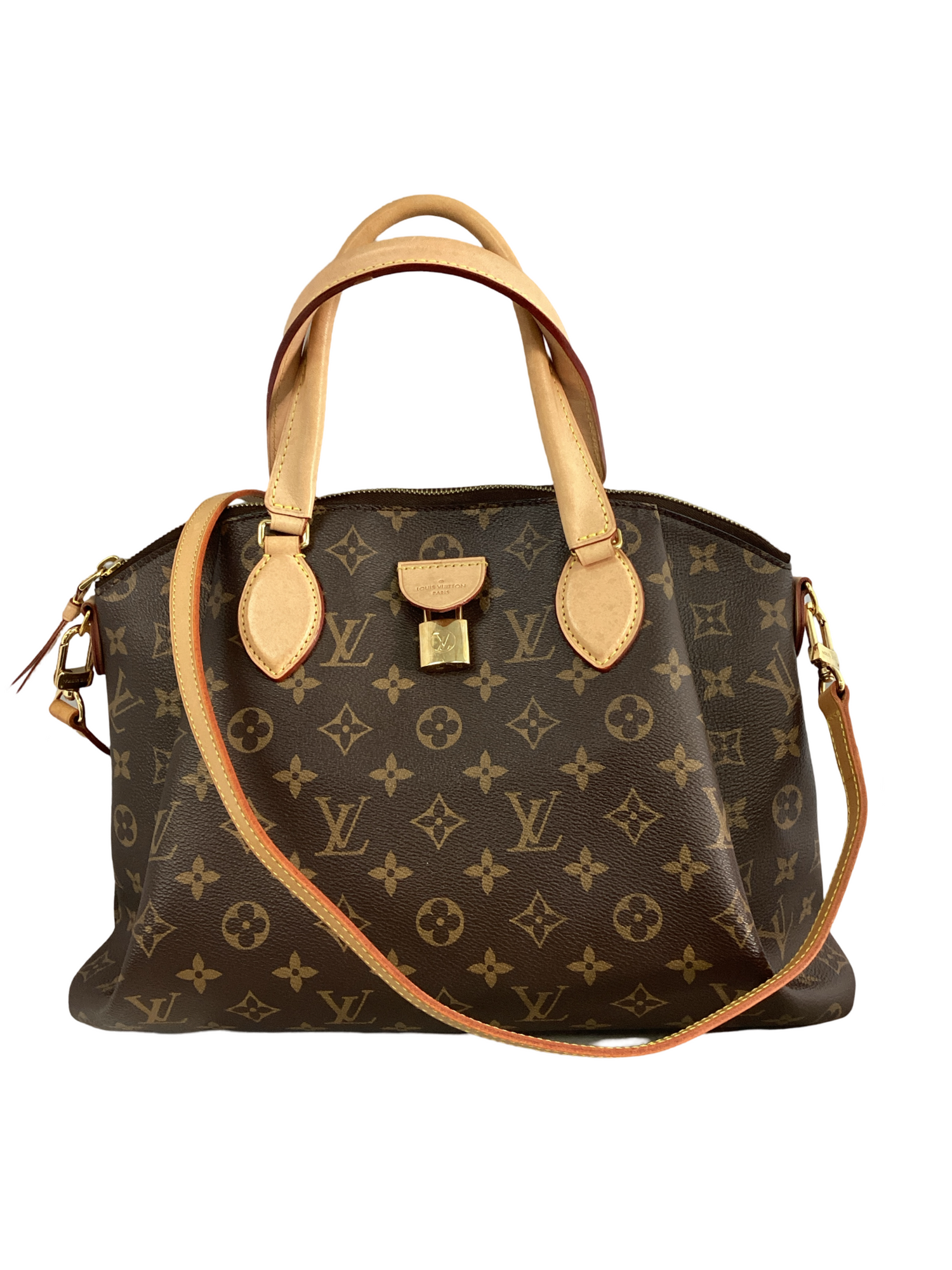 Louis Vuitton Rivoli MM with gold-tone hardware, dual rolled handles, a detachable strap zipper closure. Interior features include brown canvas lining, 3 slip pockets.
