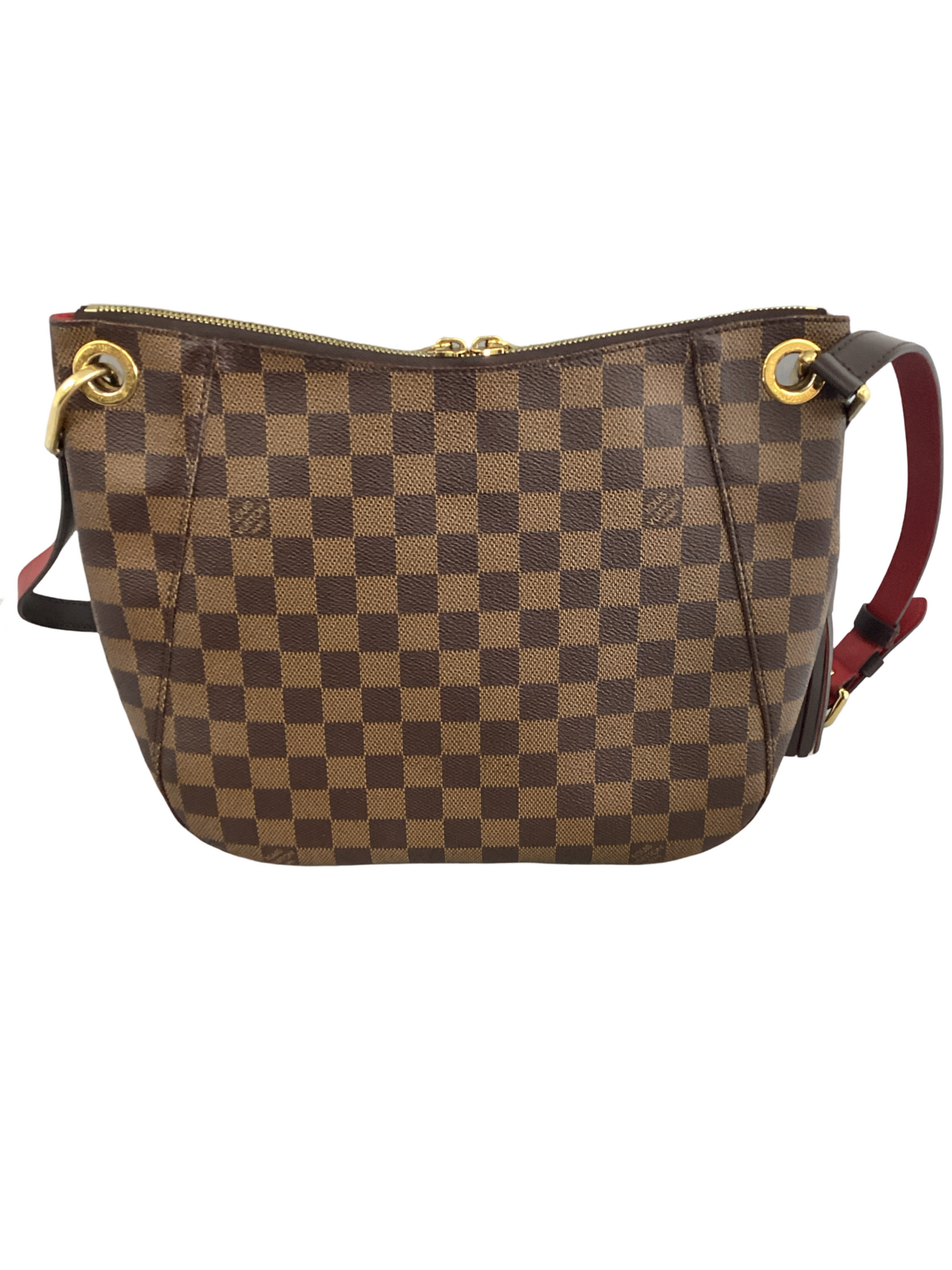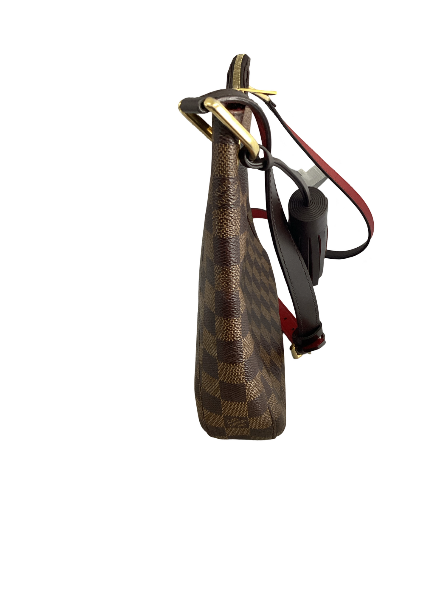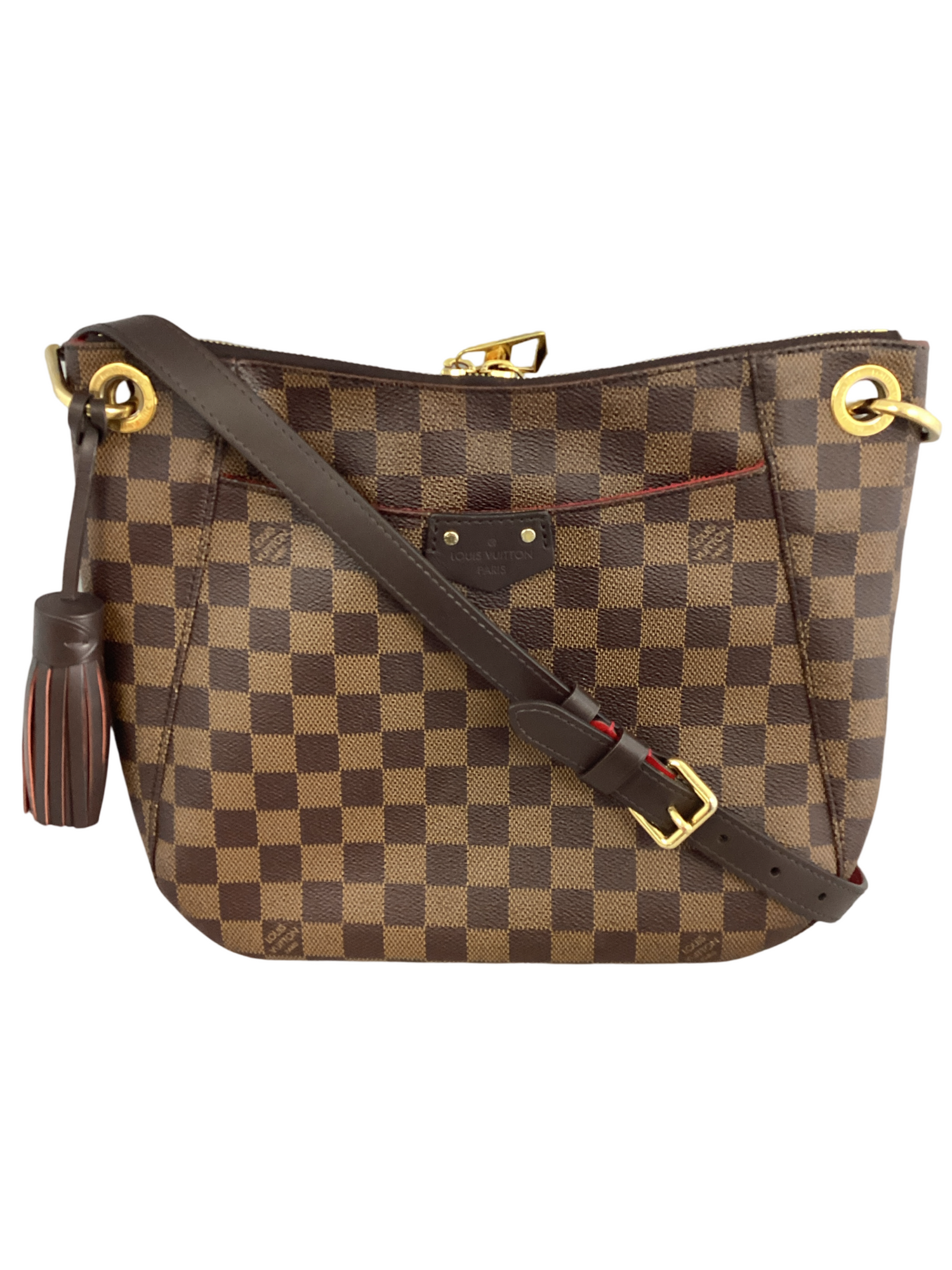 Louis Vuitton South Bank Damier Ebene Crossbody with gold-toned hardware, crafted of Louis Vuitton damier coated canvas in ebene brown with a full facing patch pocket, dark chocolate leather adjustable shoulder strap with a brass adjustment buckle and brass links, top zipper closure. Interior features a vibrant red fabric interior with a patch pocket