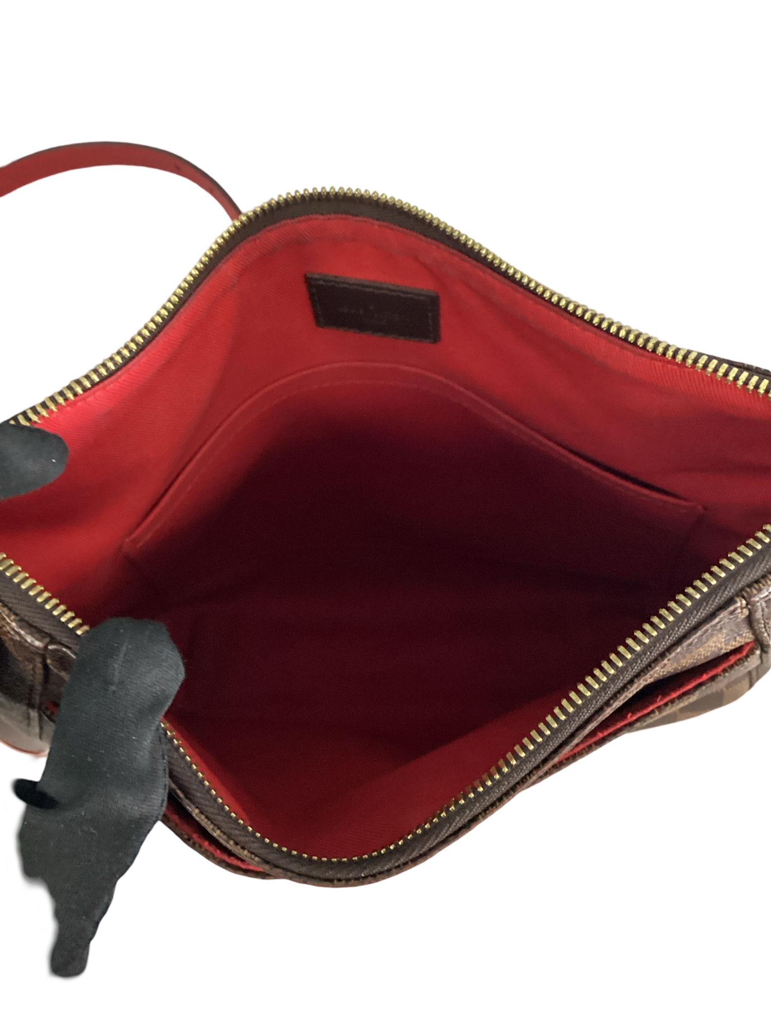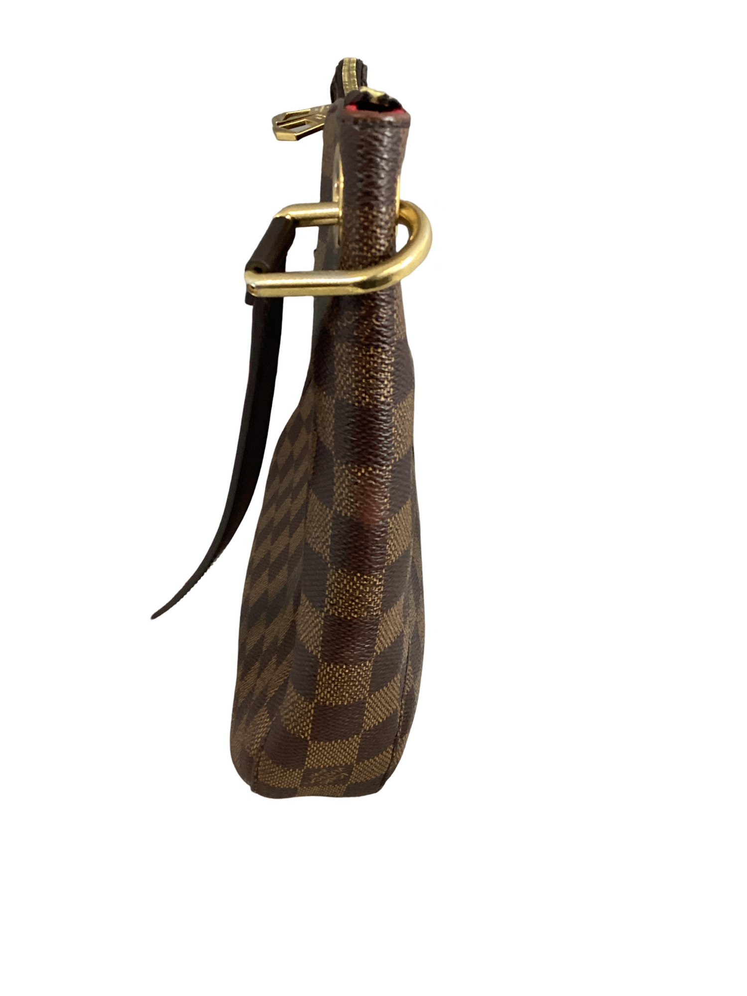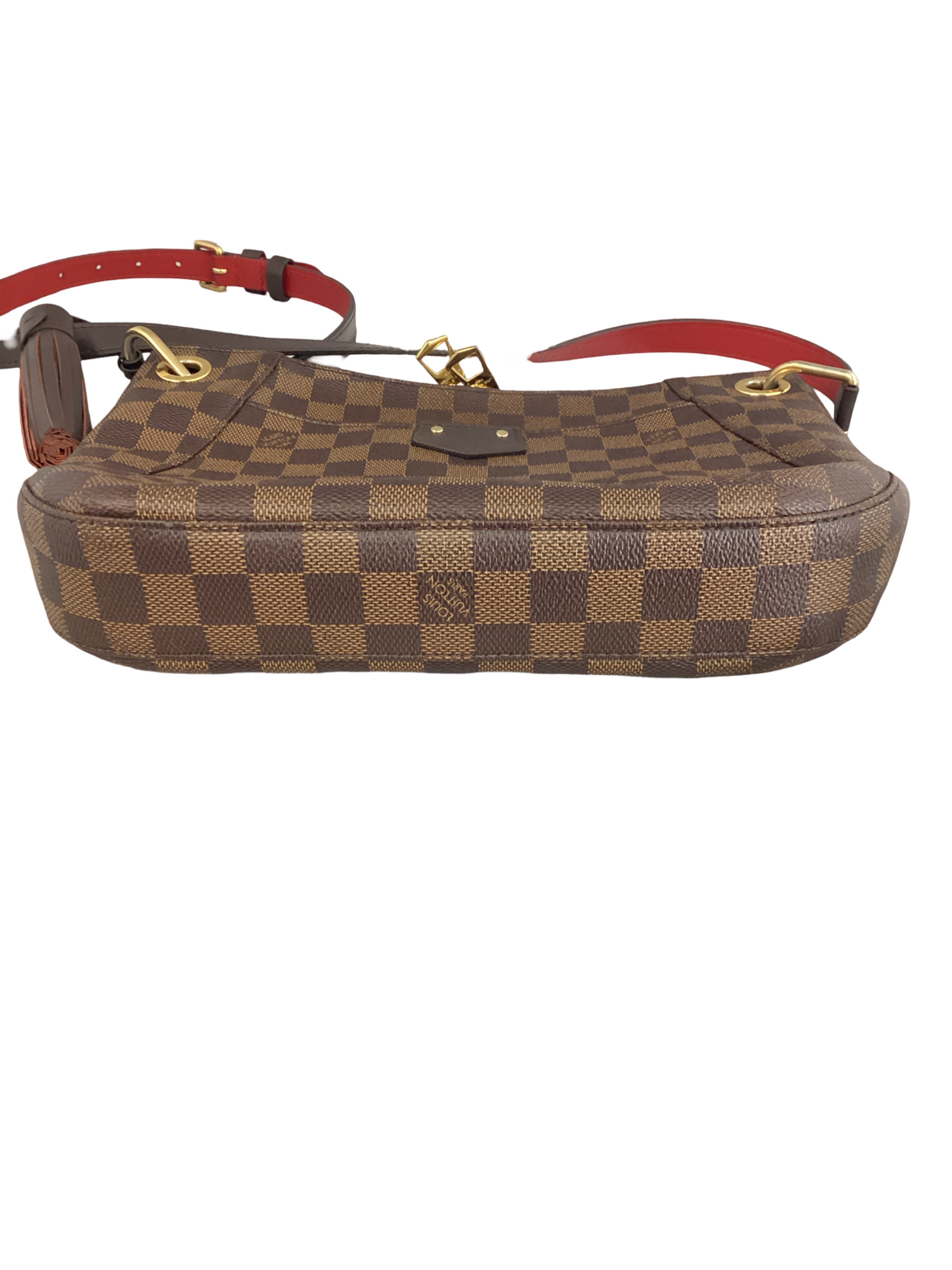 Louis Vuitton South Bank Damier Ebene Crossbody with gold-toned hardware, crafted of Louis Vuitton damier coated canvas in ebene brown with a full facing patch pocket, dark chocolate leather adjustable shoulder strap with a brass adjustment buckle and brass links, top zipper closure. Interior features a vibrant red fabric interior with a patch pocket