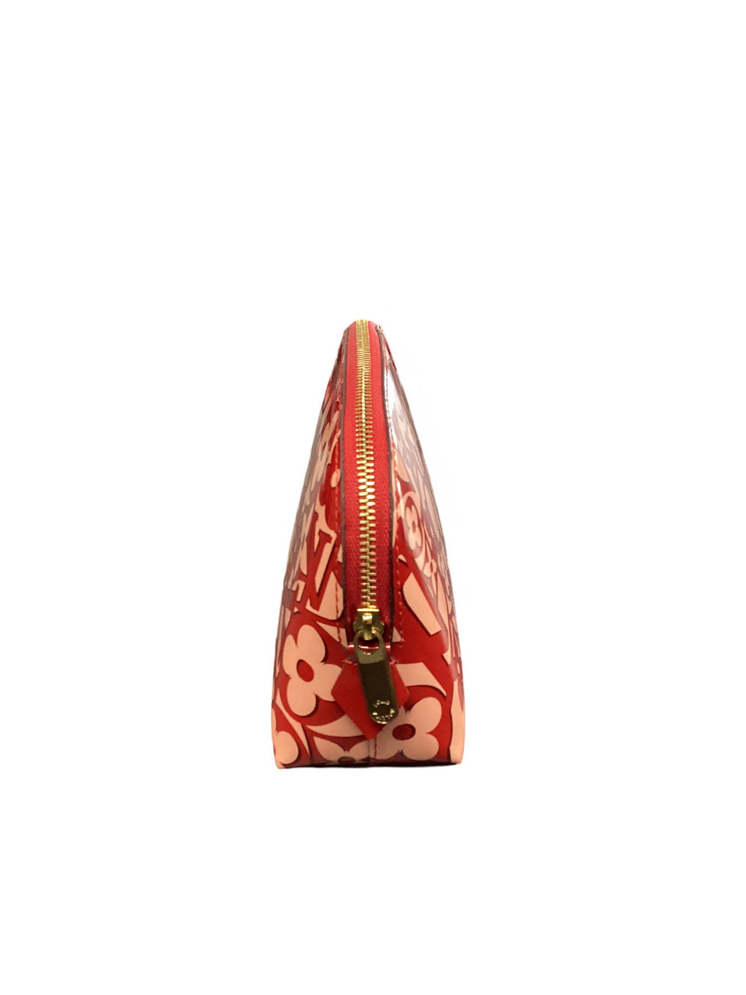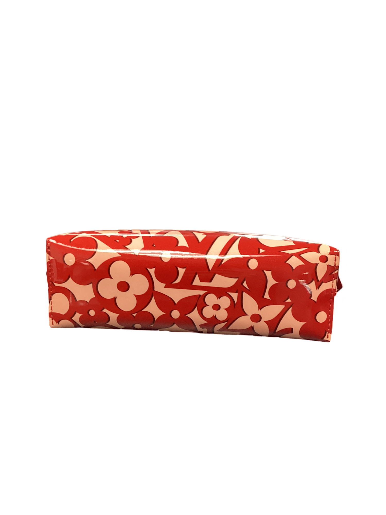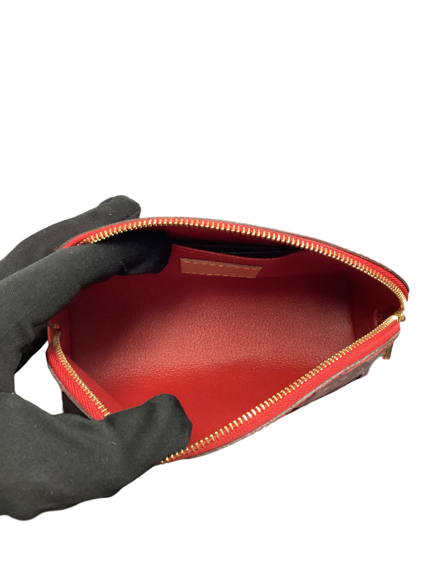 Louis Vuitton Sweet Monogram Cosmetic Pouch with gold tone hardware, zipper closure. Interior features include red leather lining, 1 slip pocket.