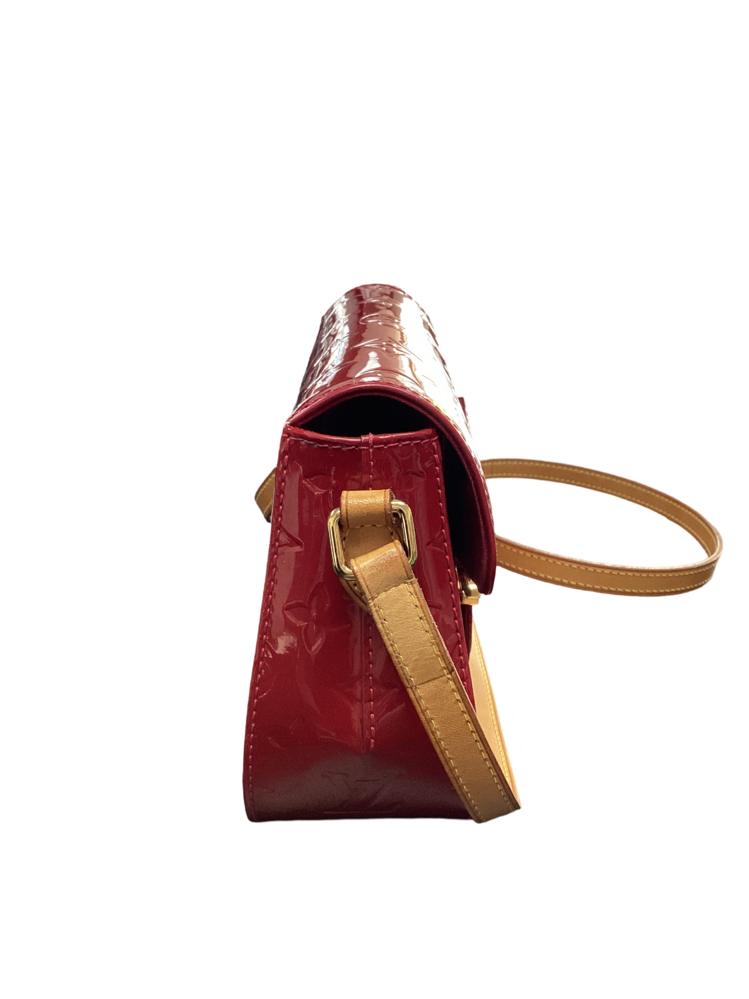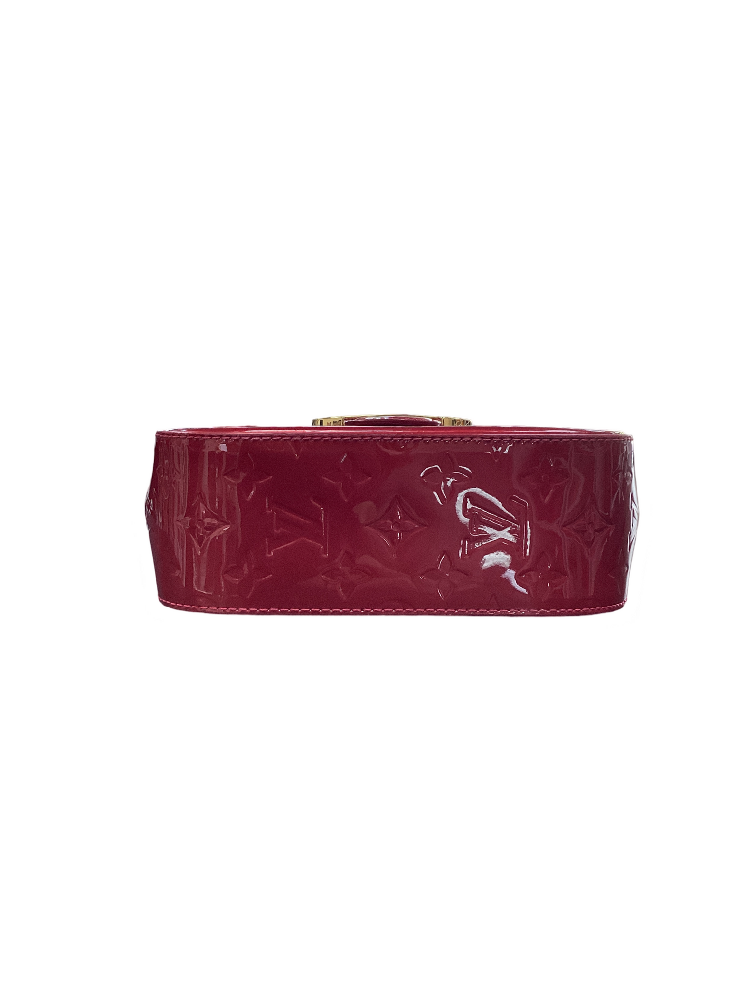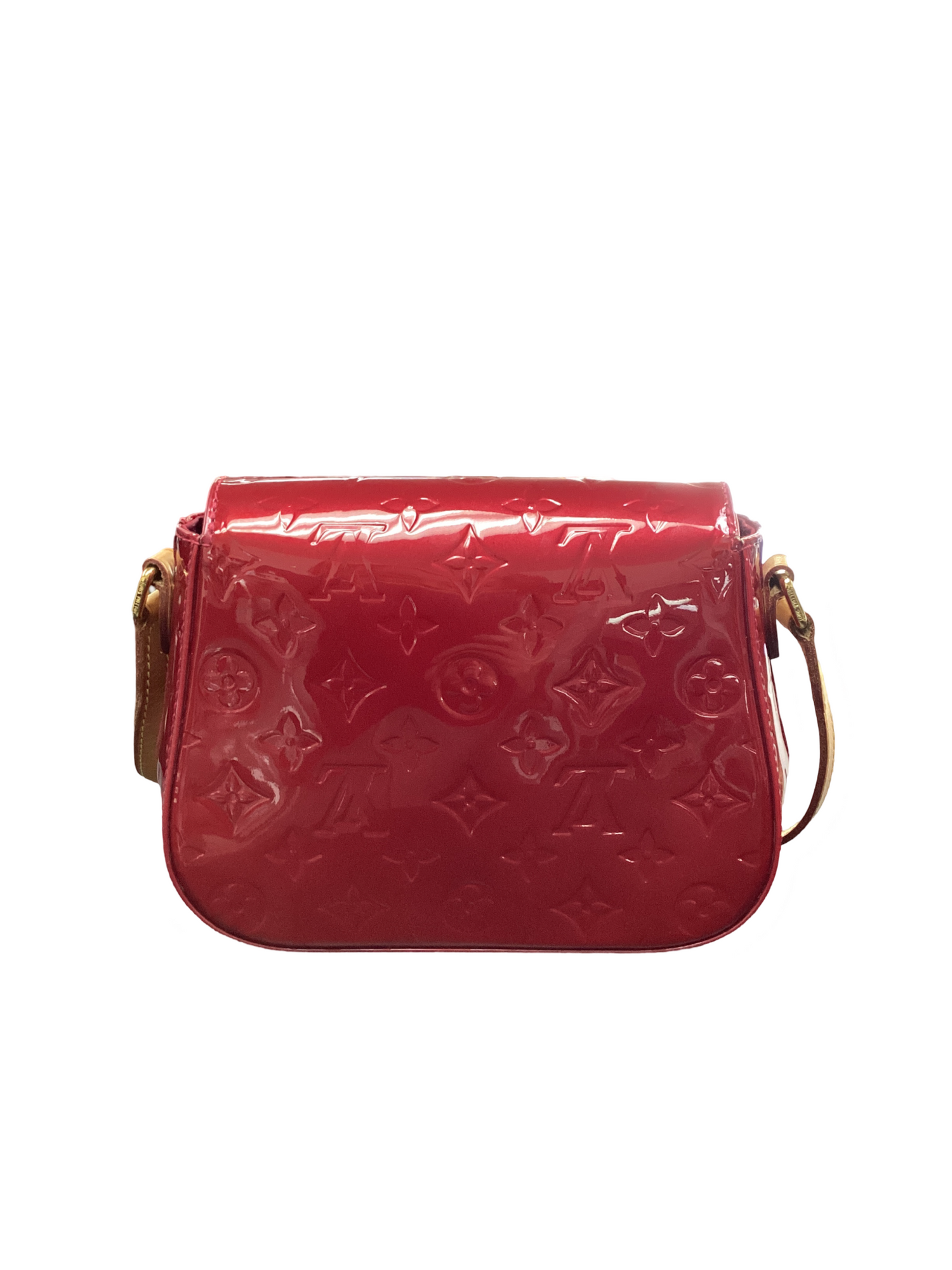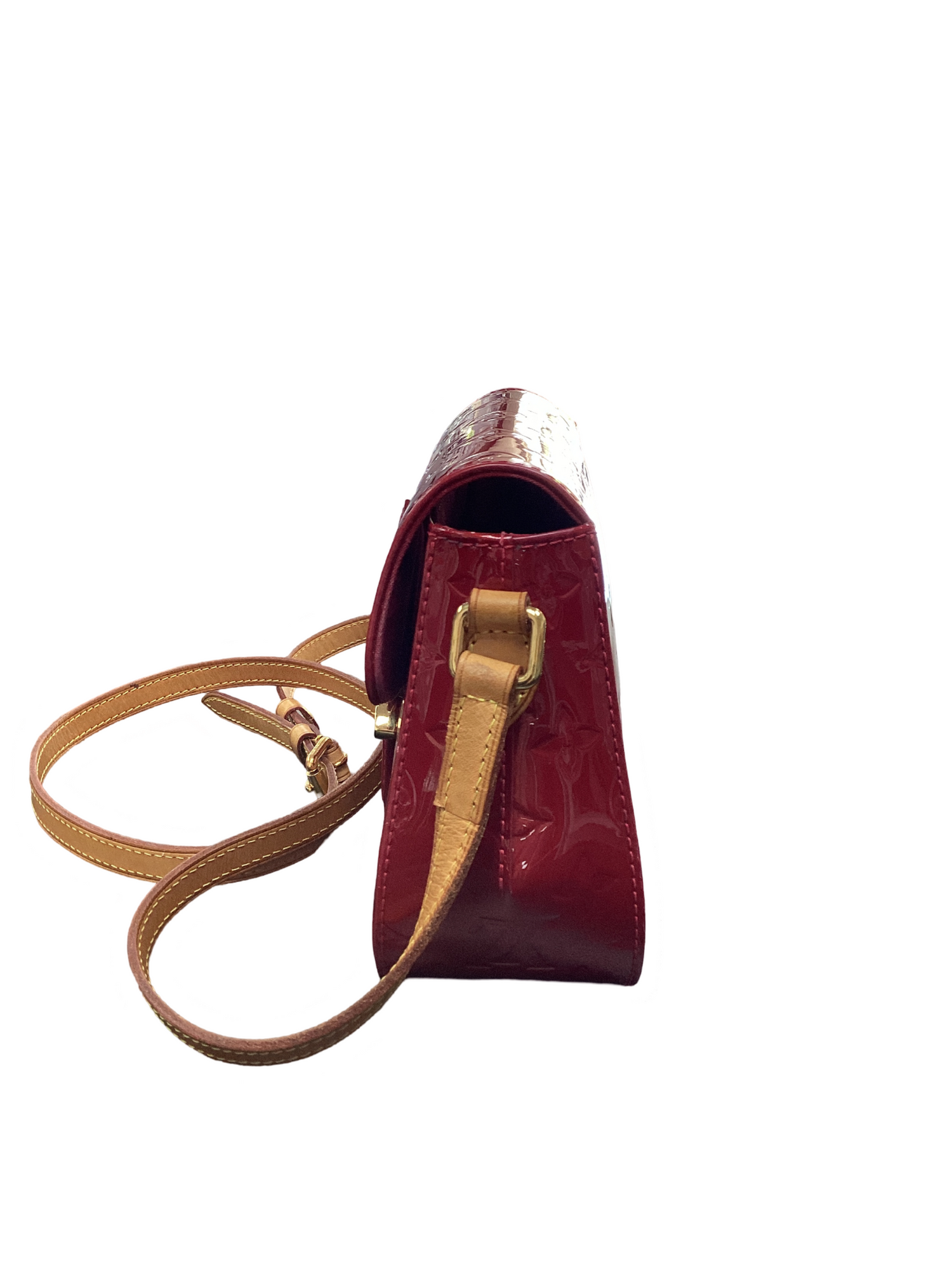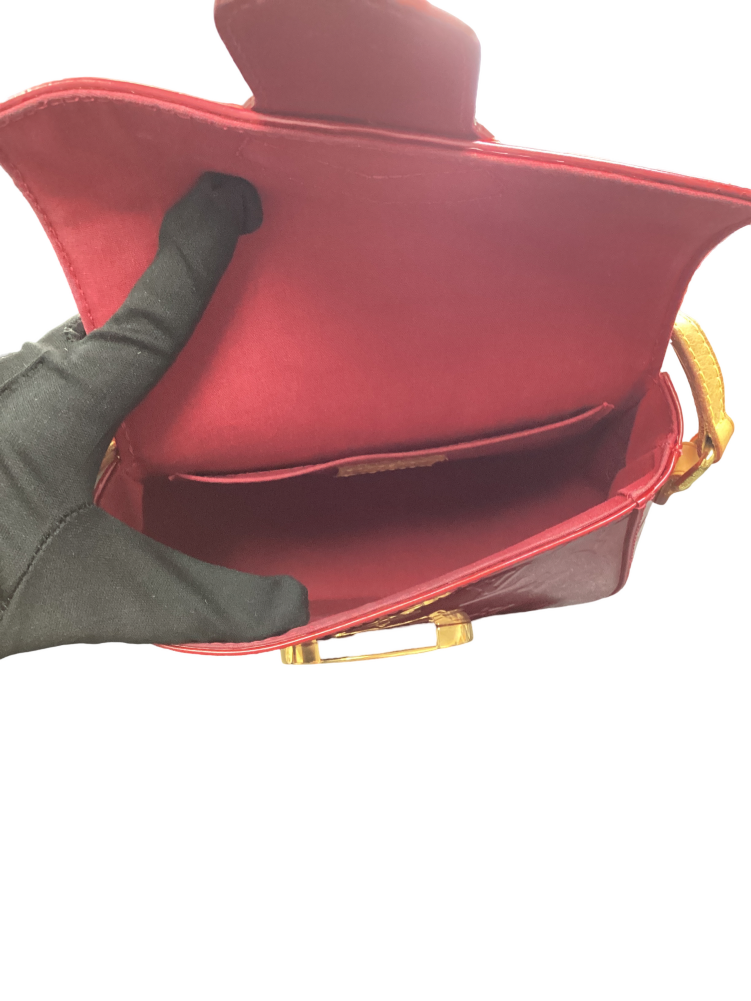 Louis Vuitton Vernis Bellflower PM with gold-toned hardware, Louis Vuitton monogram embossed vernis patent leather, a long vachetta cowhide leather adjustable shoulder strap and a front flap closure that is secured with a tab and gold-toned hardware. Interior features a red fabric interior with a patch pocket.