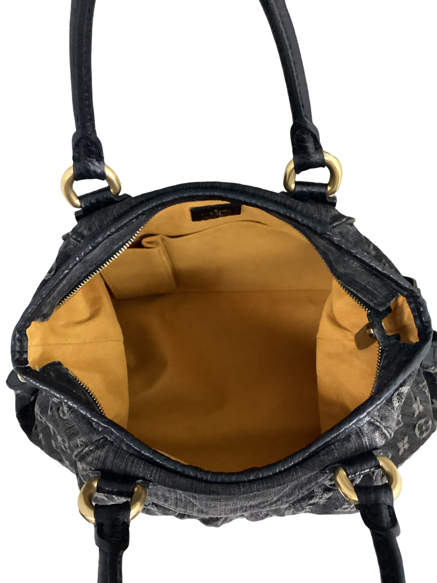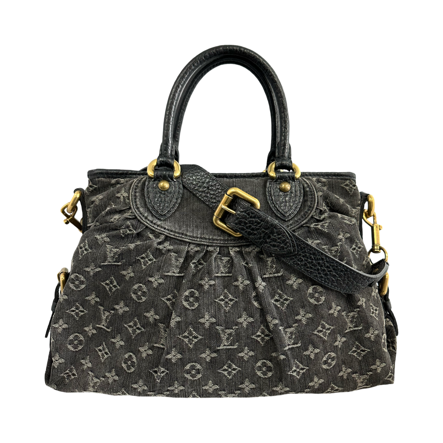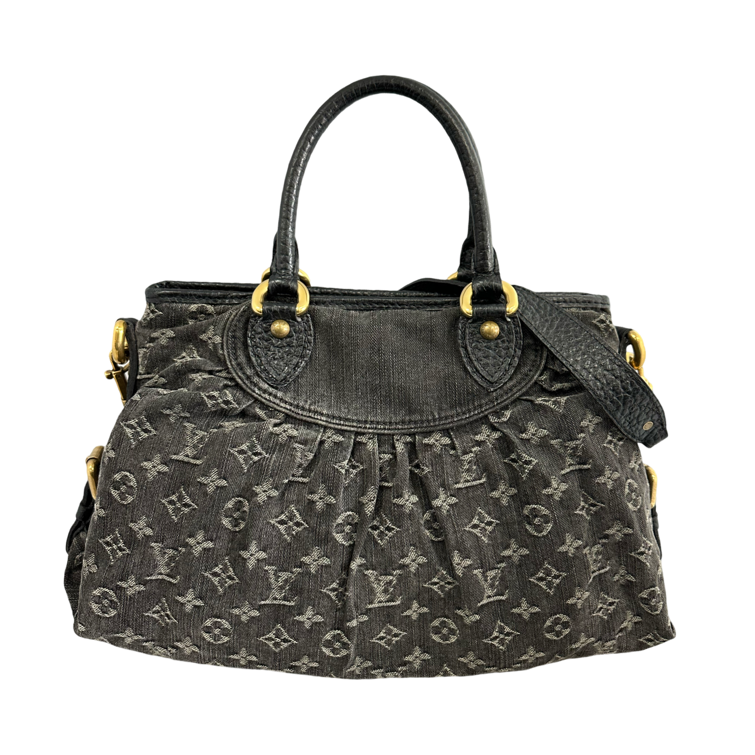 Louis Vuitton-Vintage Monogram Denim Neo Cabby MM with gold-toned hardware, monogram denim with decorative pleating and black leather trim, rolled black leather top handles and an optional adjustable shoulder strap, a a top zipper closure. Interior features a saffron microfiber interior with patch pockets.