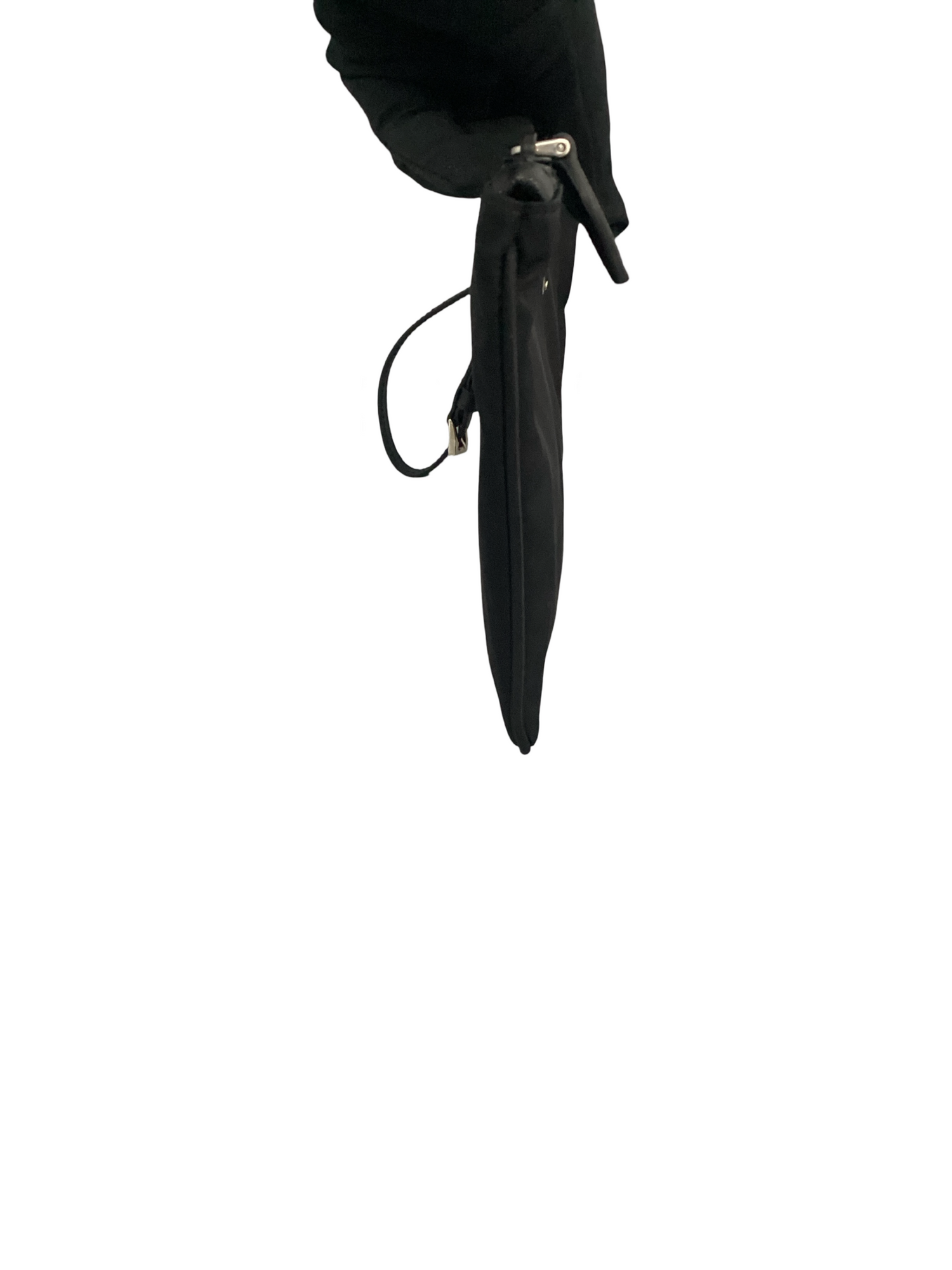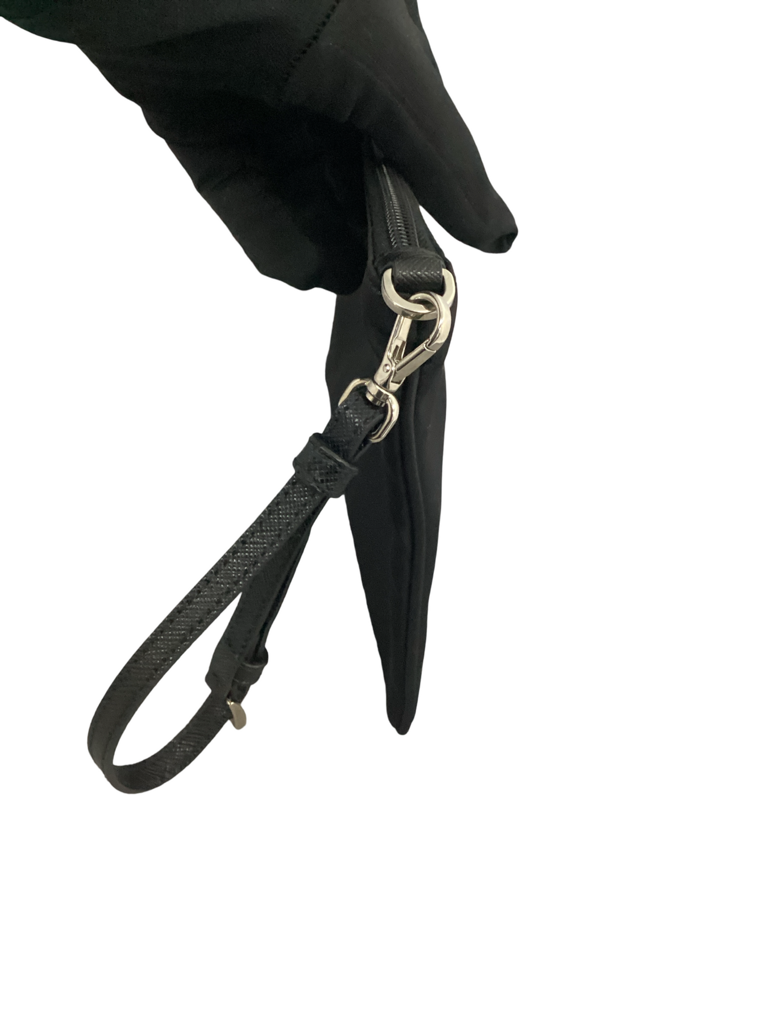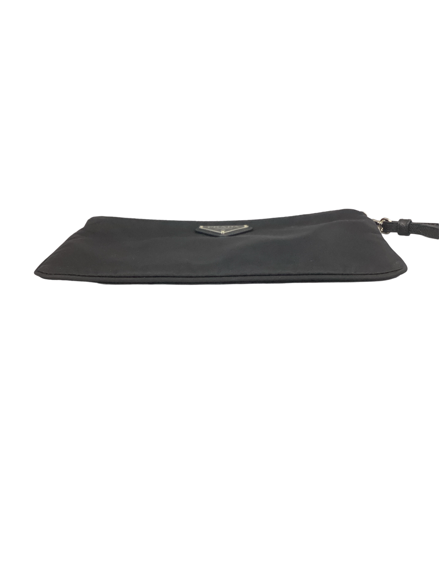 Prada black Nylon Clutch with silver tone hardware, small leather handle, zip closure at top. Interior features include logo jacquard lining.