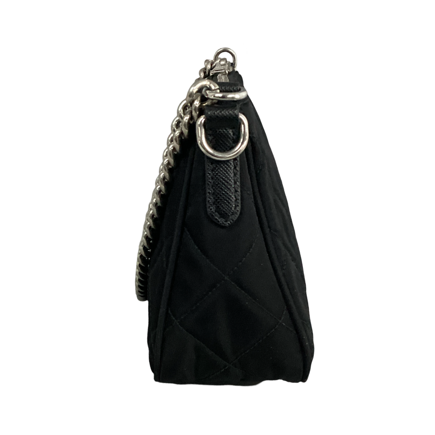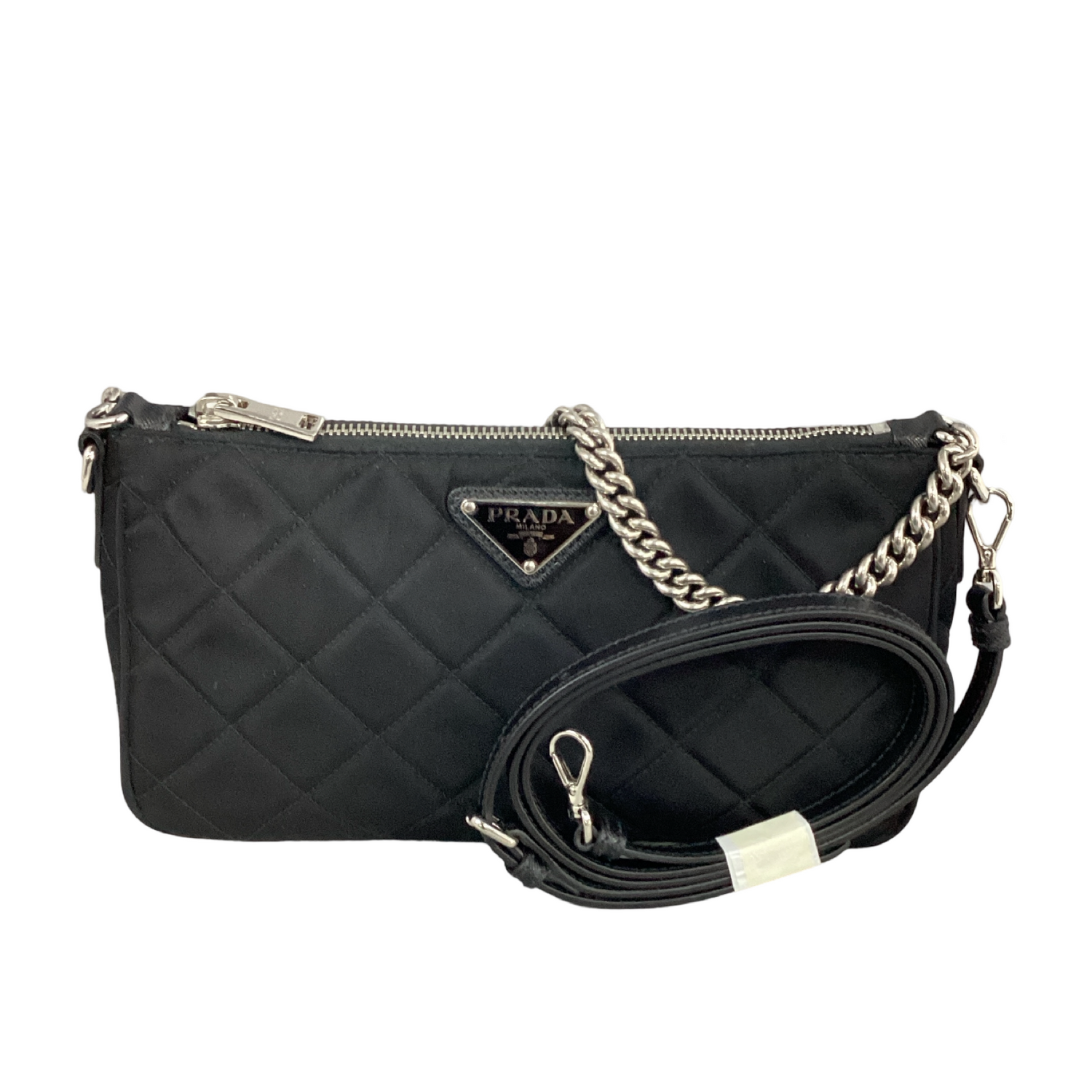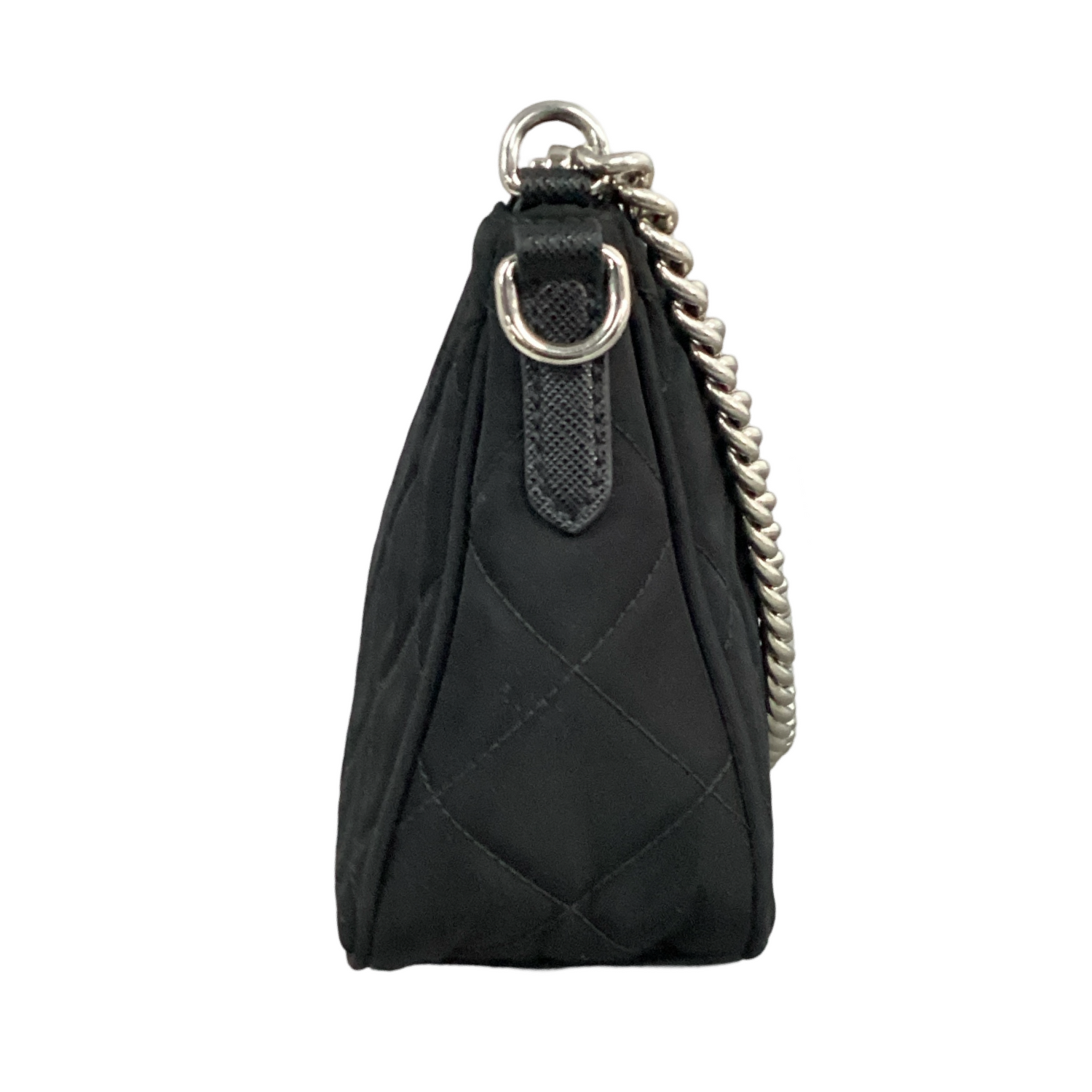 Prada-Black Nylon Tessuto Impuntu Quilted Shoulder Bag with silver-toned hardware, crafted of black diamond quilted fine tessuto nylon, chain link straps, an optional leather shoulder strap, and a silver Prada logo and top zipper closure. Interior features a black Prada logo jacquard interior and interior zipper pocket.