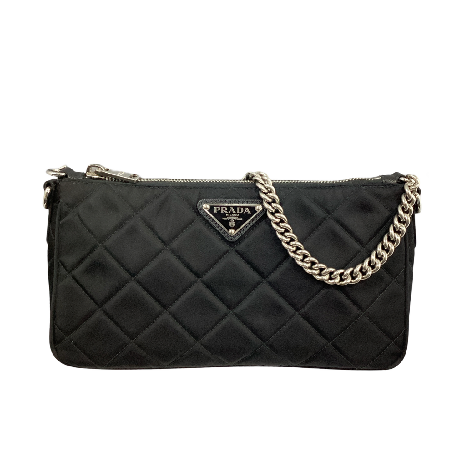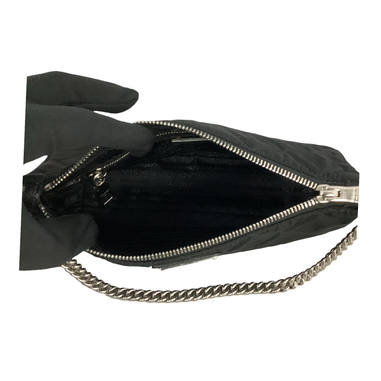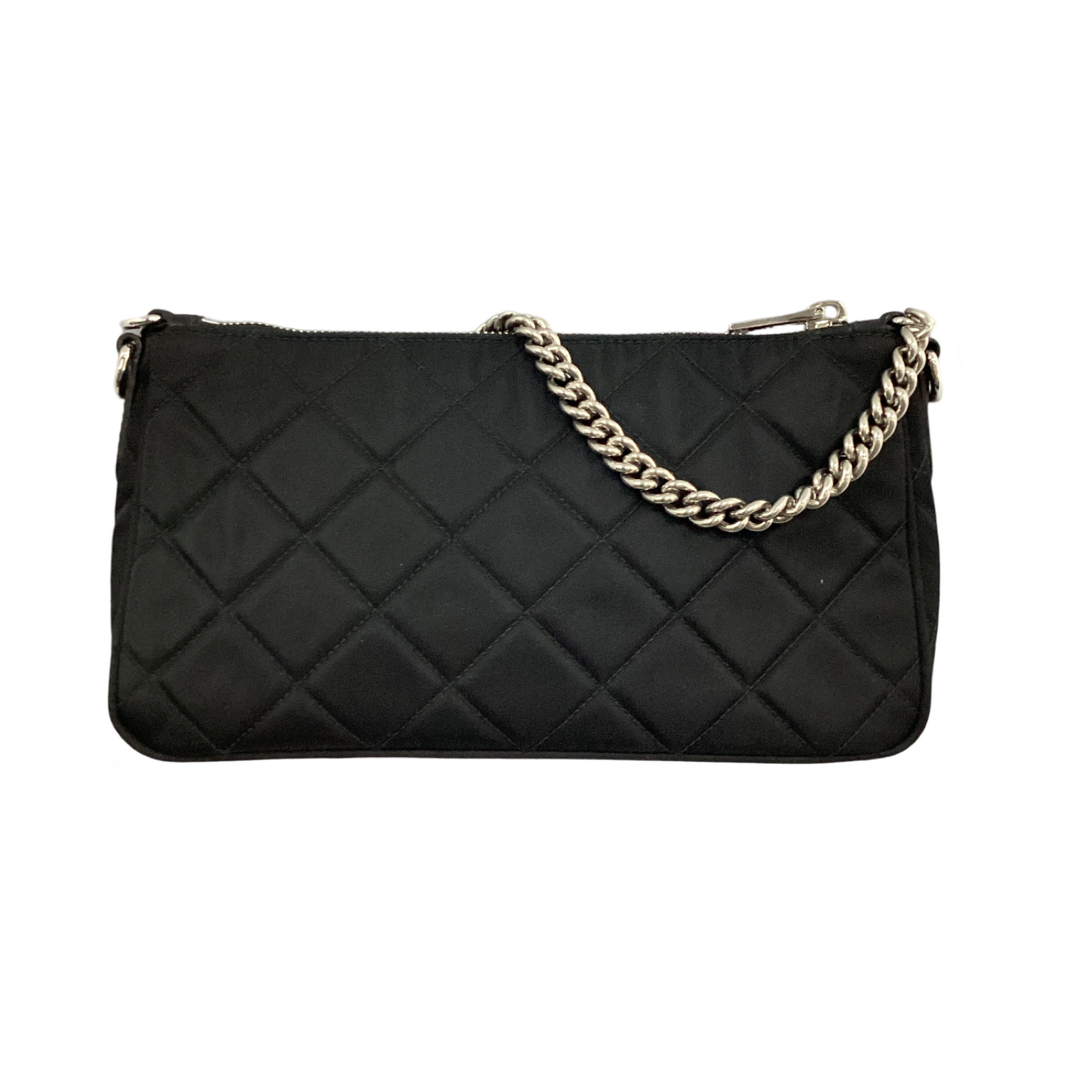 Prada-Black Nylon Tessuto Impuntu Quilted Shoulder Bag with silver-toned hardware, crafted of black diamond quilted fine tessuto nylon, chain link straps, an optional leather shoulder strap, and a silver Prada logo and top zipper closure. Interior features a black Prada logo jacquard interior and interior zipper pocket.