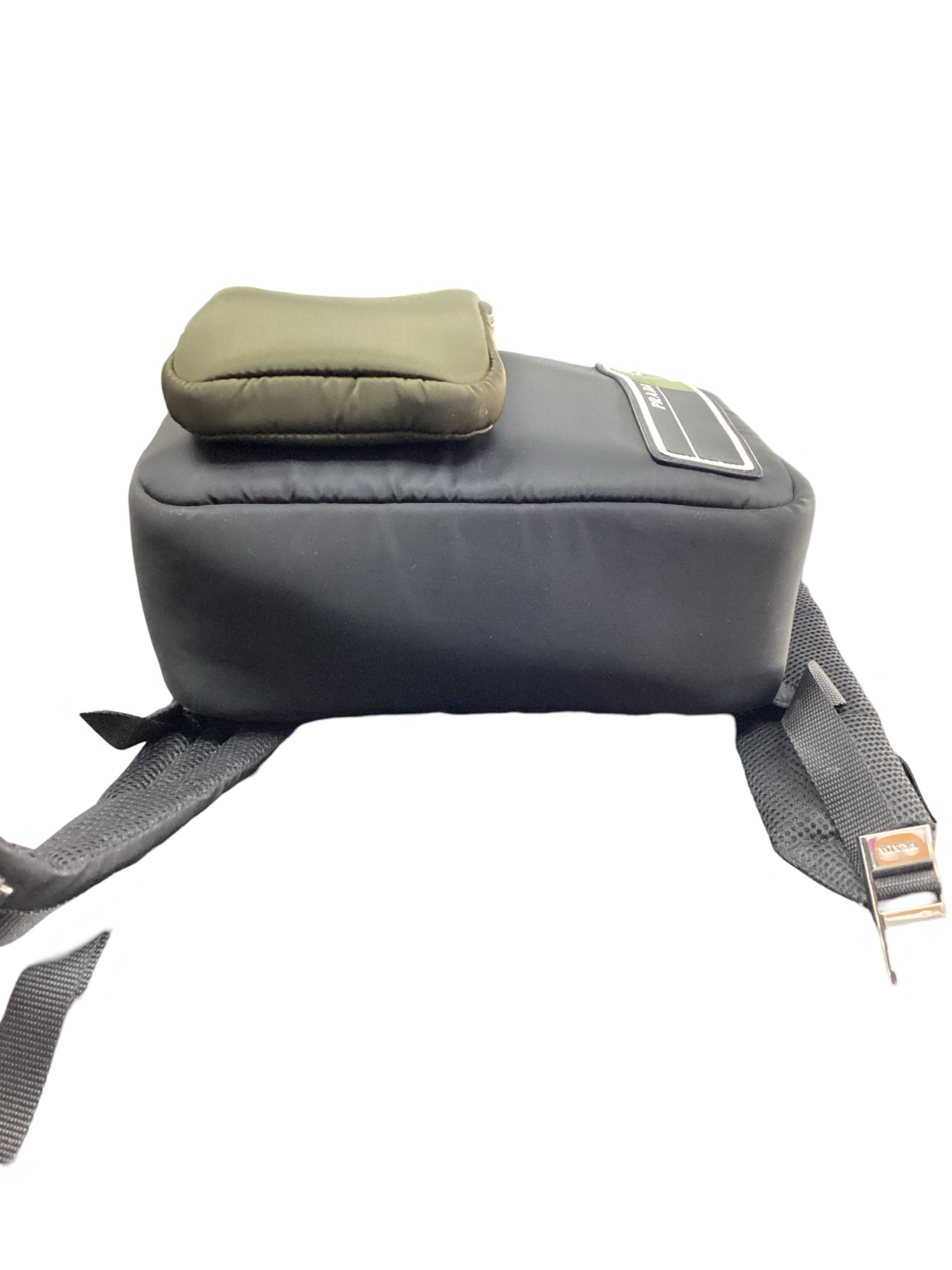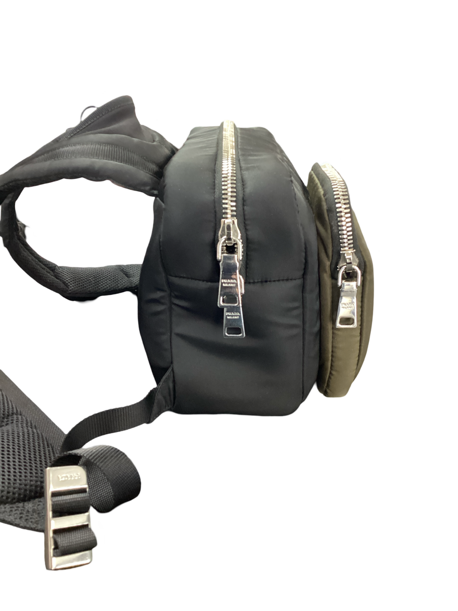 Prada Black Tessuto Pocket Nylon Technical Backpack with silver-tone hardware, black and army green nylon, two back adjustable straps, front zip pocket and zip around closure. Interior features one zipper pocket.