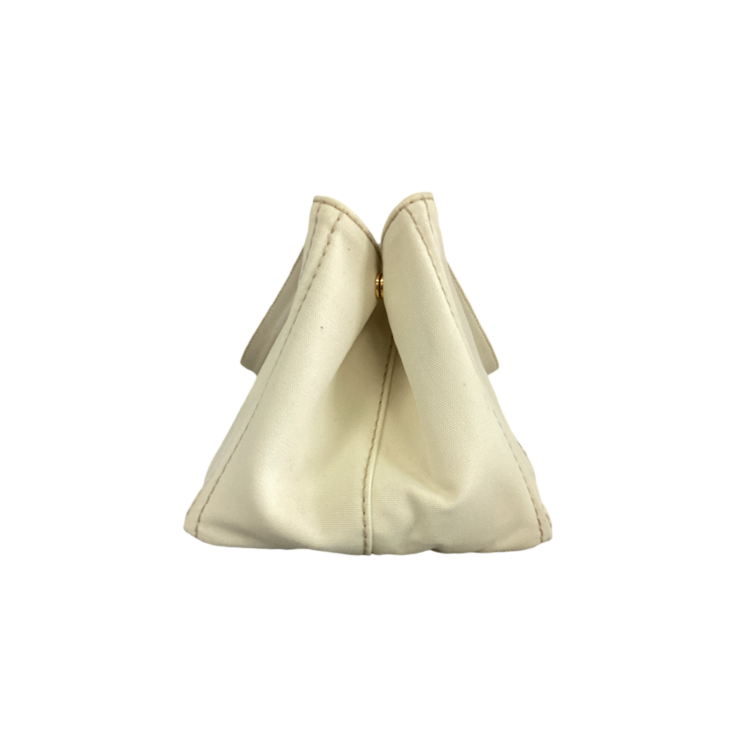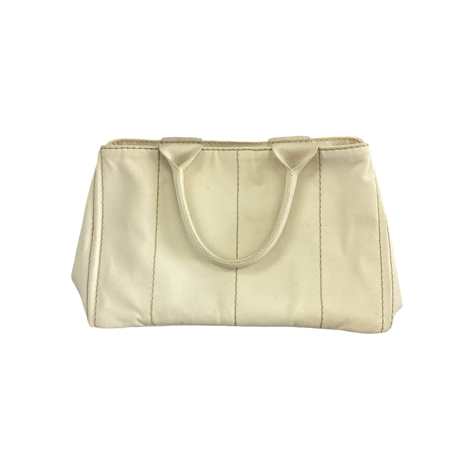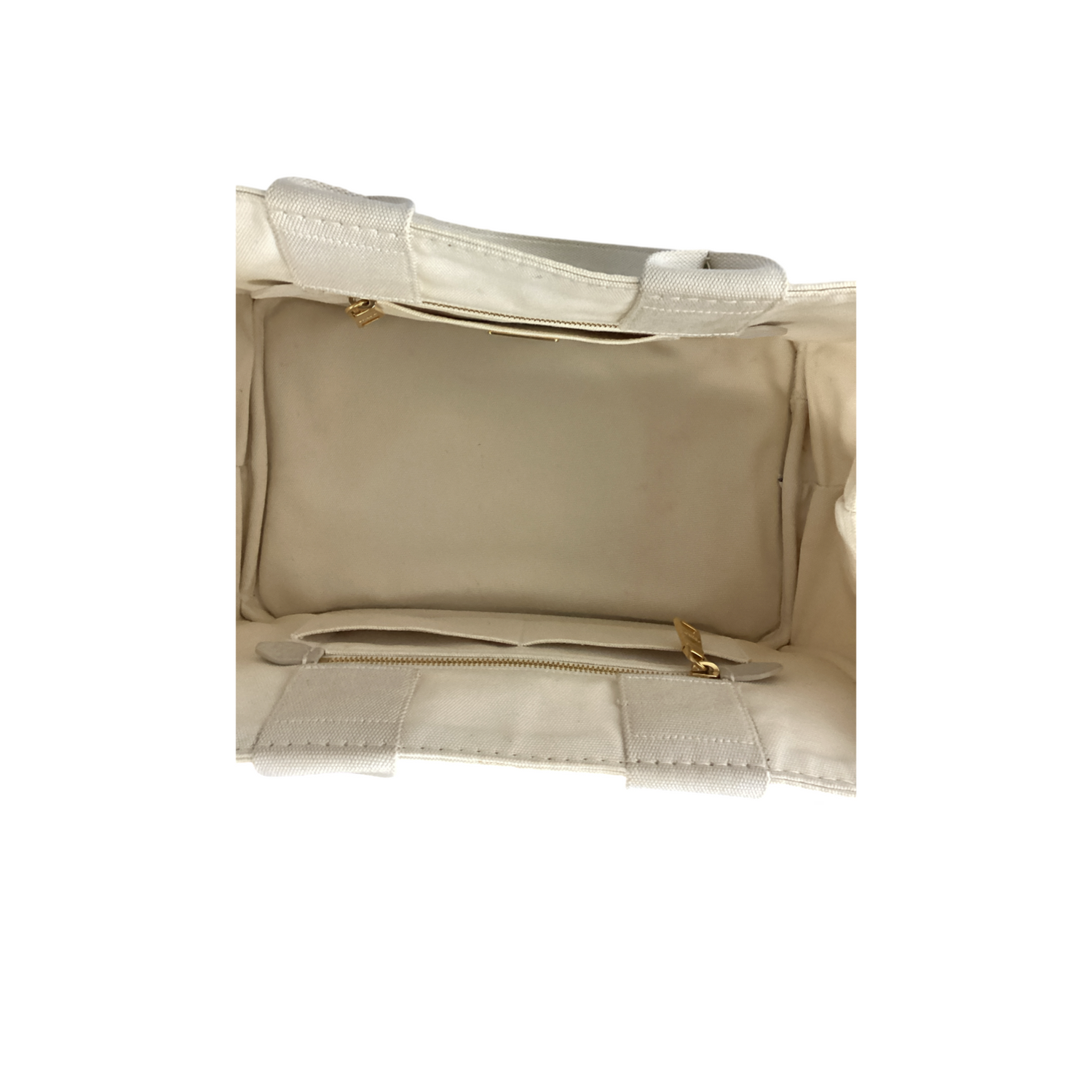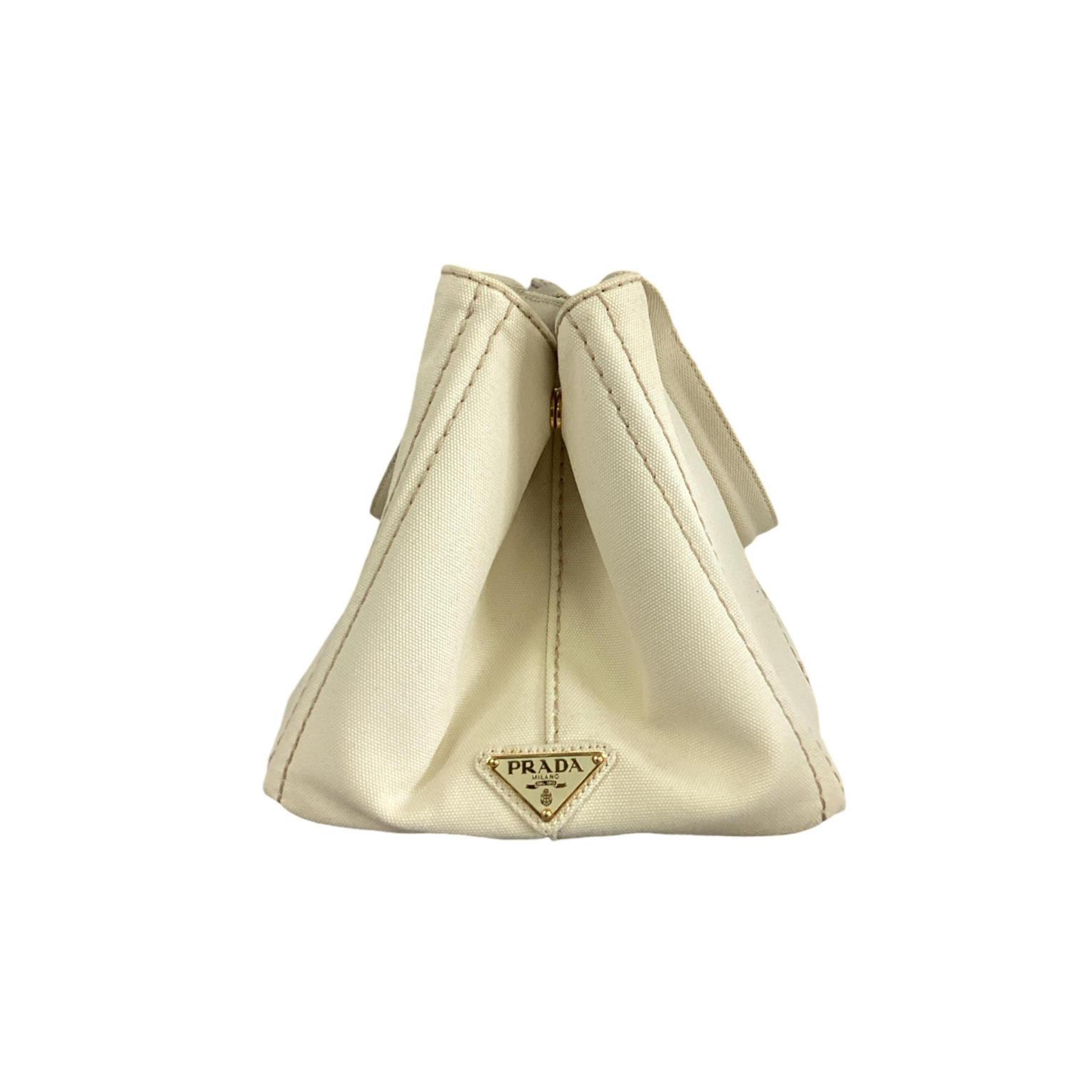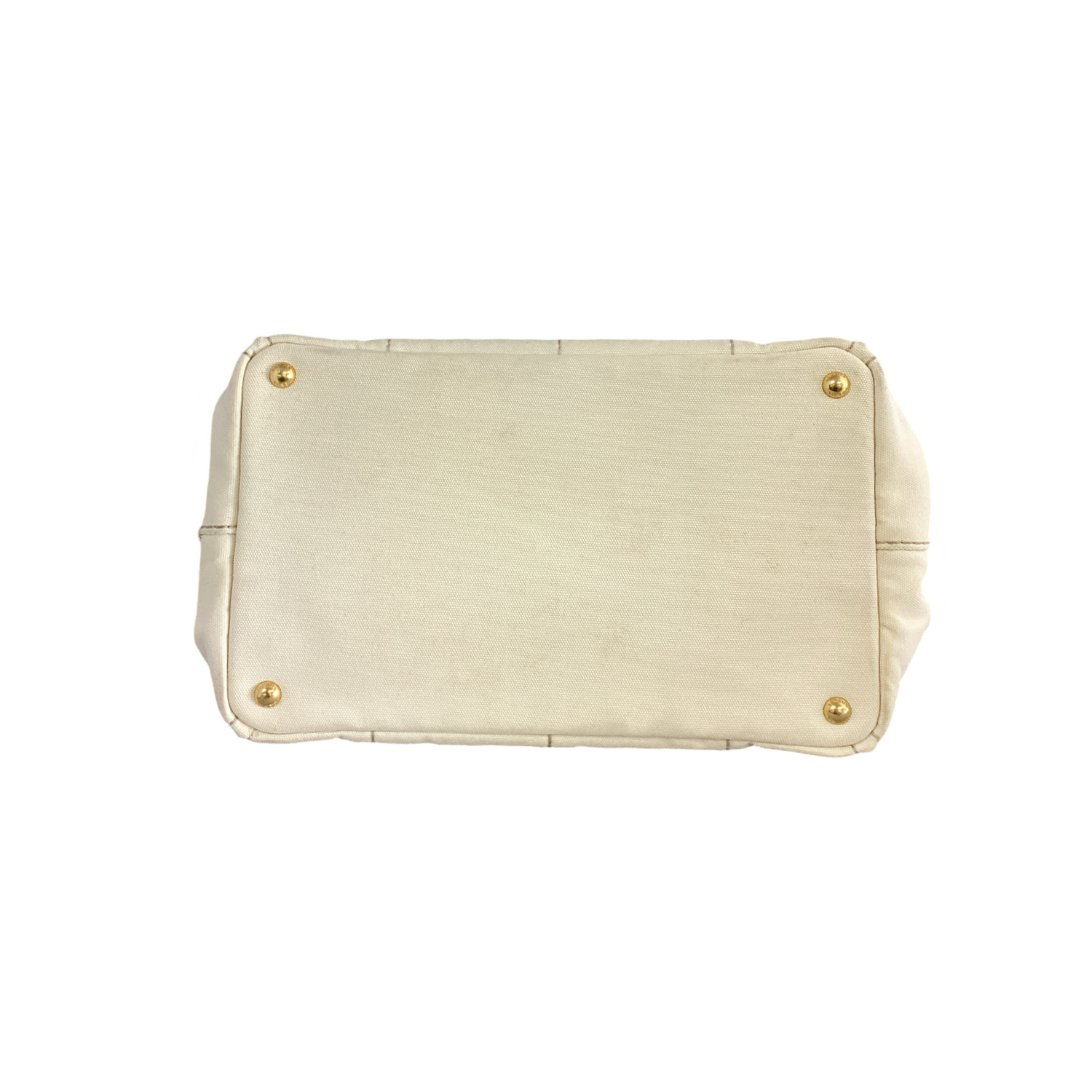 Prada Large Canapa Logo Tote with gold-tone hardware, thick off white canvas with a large white Prada logo on the front and rolled canvas top handles. Interior features open top, cream fabric interior with 2 zip pockets and 2 slip pockets.