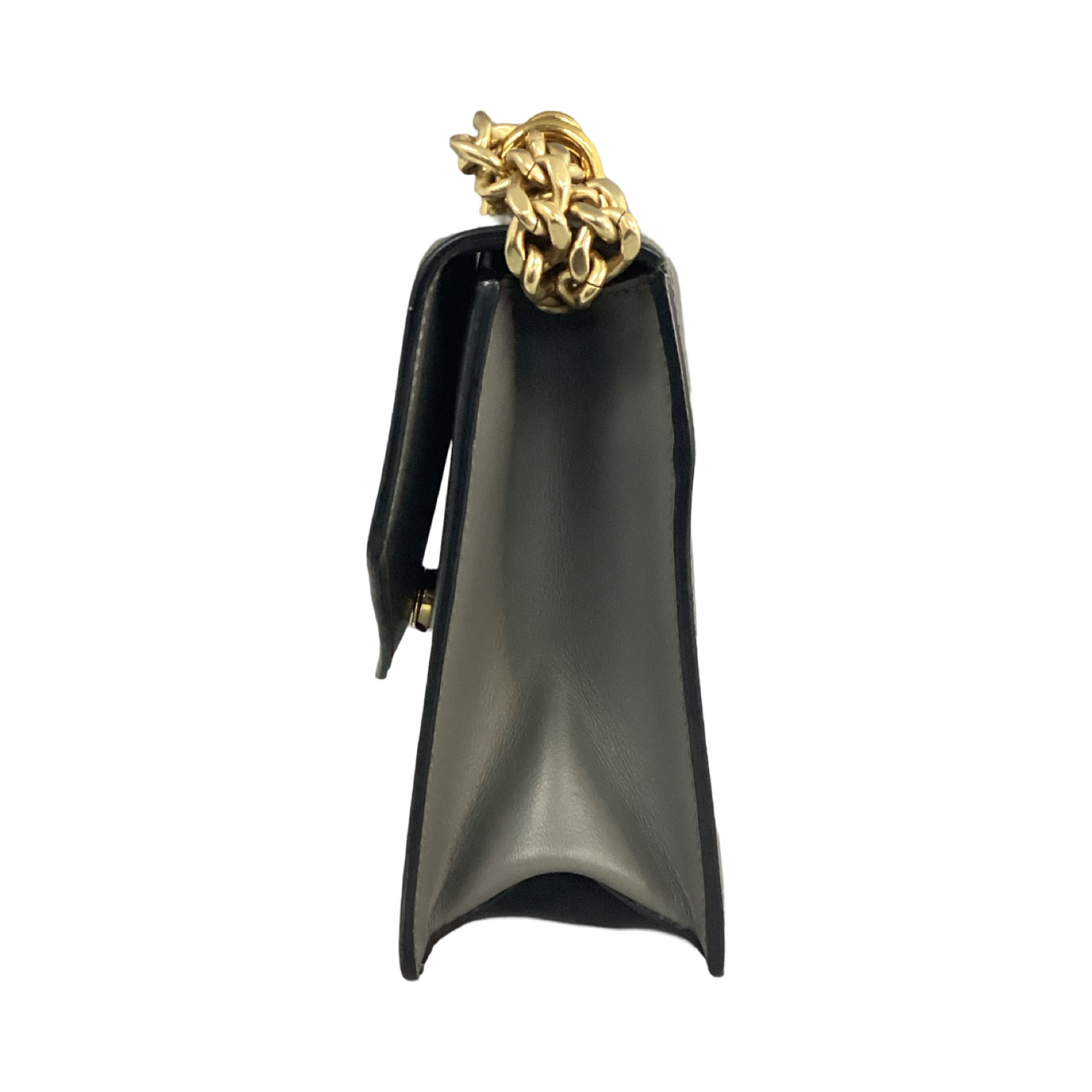 Prada-Saffiano Blue Gray Envelope Chain Bag with gold-toned hardware, crafted of Prada signature saffiano crossgrain leather in blue gray, a gold chain and a leather shoulder strap and a front flap snap closure. Interior features a leather and fabric interior.