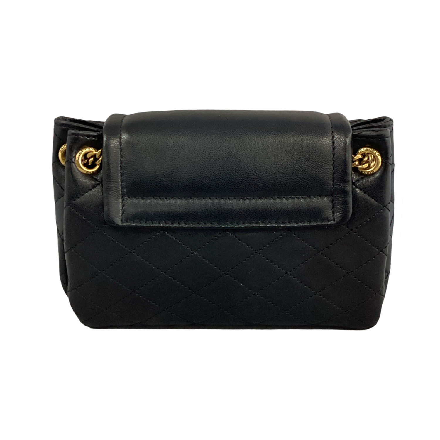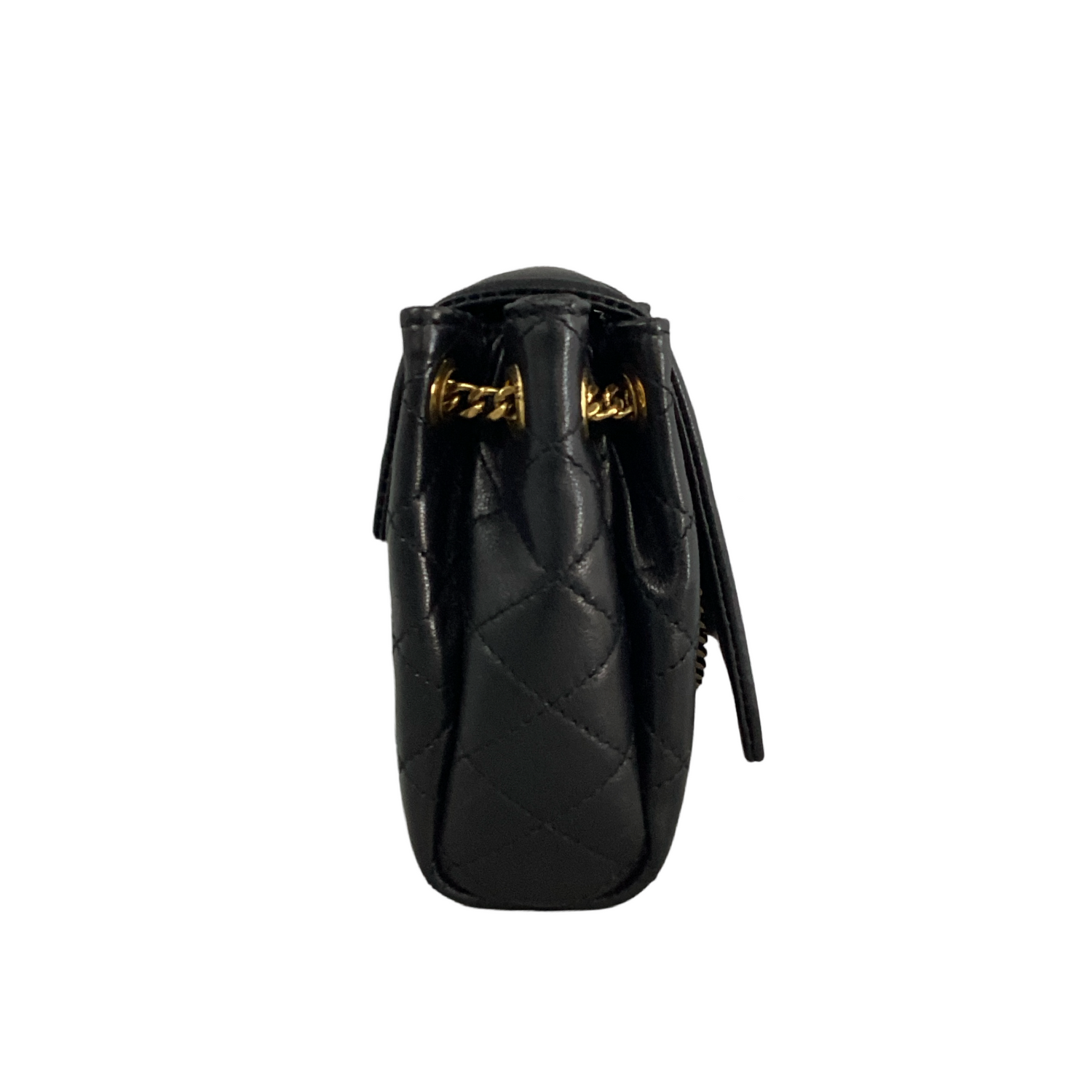 Saint Laurent-Black Leather Mini Nolita with gold-toned hardware, elegant shoulder bag is crafted of diamond-quilted lambskin leather in black, an aged gold chain-link shoulder strap with a leather shoulder pad and a prominent aged gold YSL monogram detail on the crossover flap and snap button closure. Interior features a black fabric interior with a pocket.