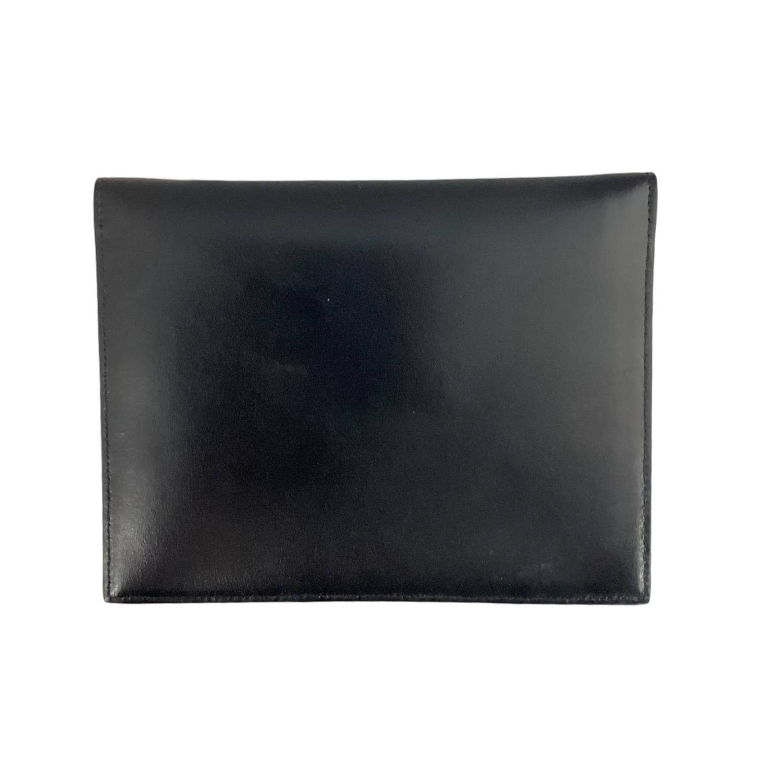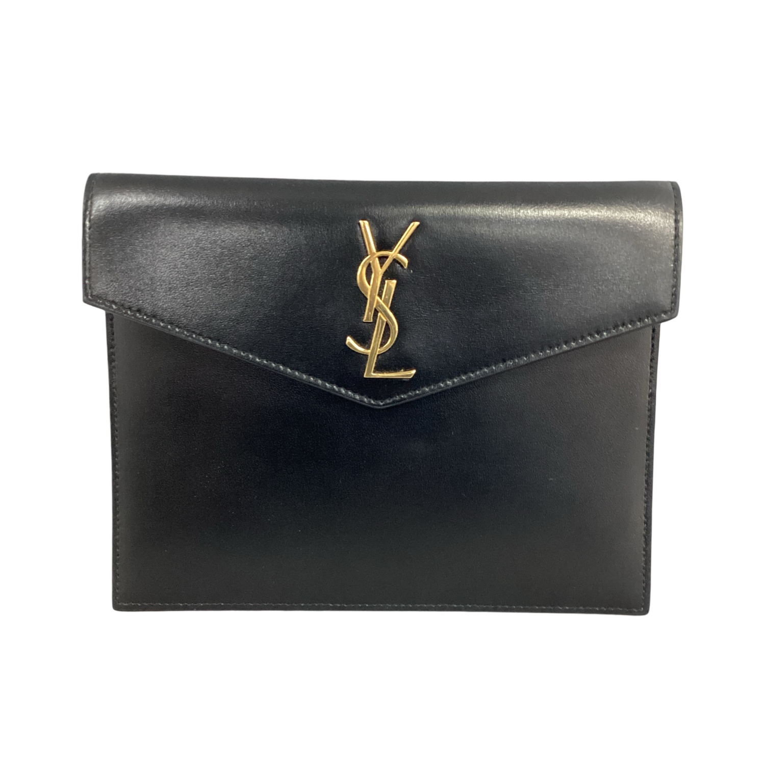 Saint Laurent-Black Uptown Clutch with gold toned hardware, made of black smooth leather, magnetic flap closure. Interior features a black fabric interior and one main compartment.