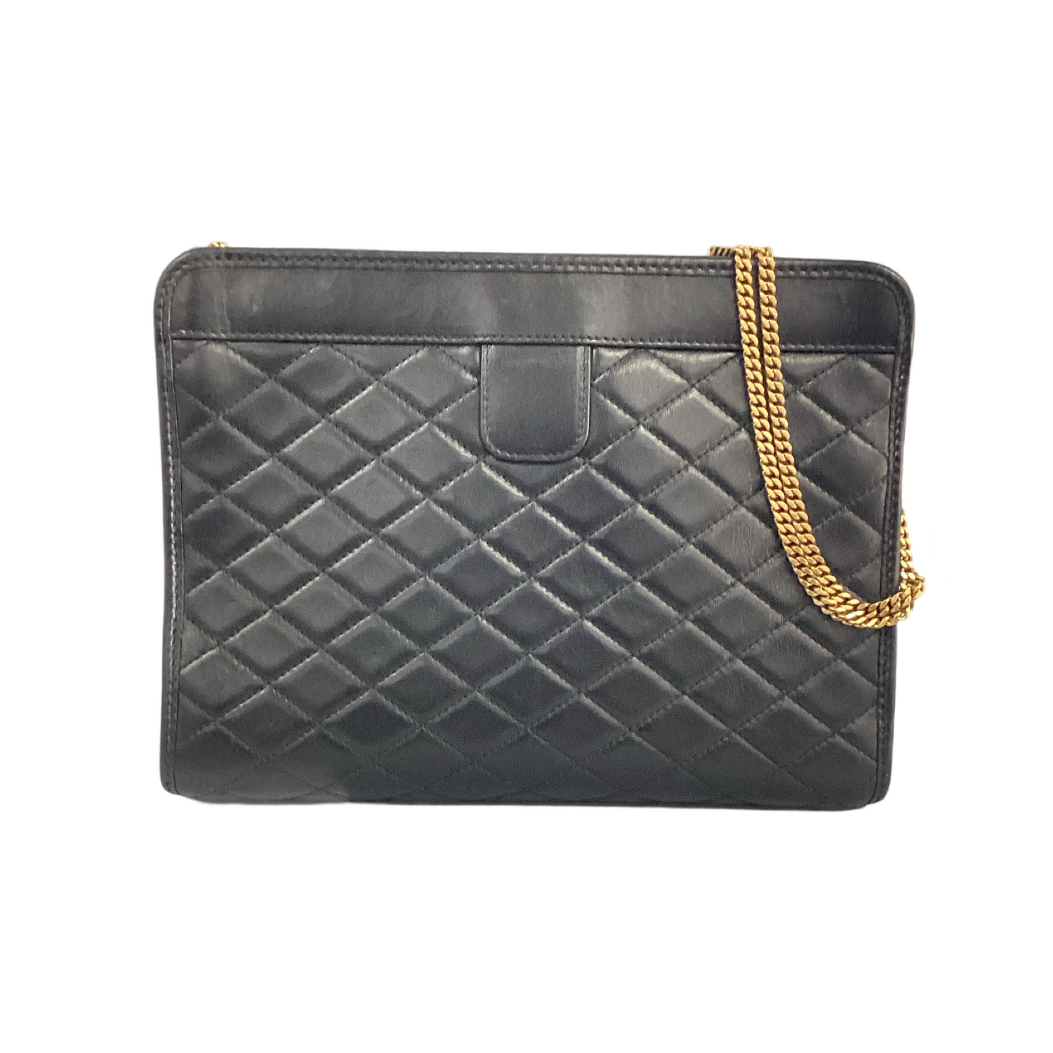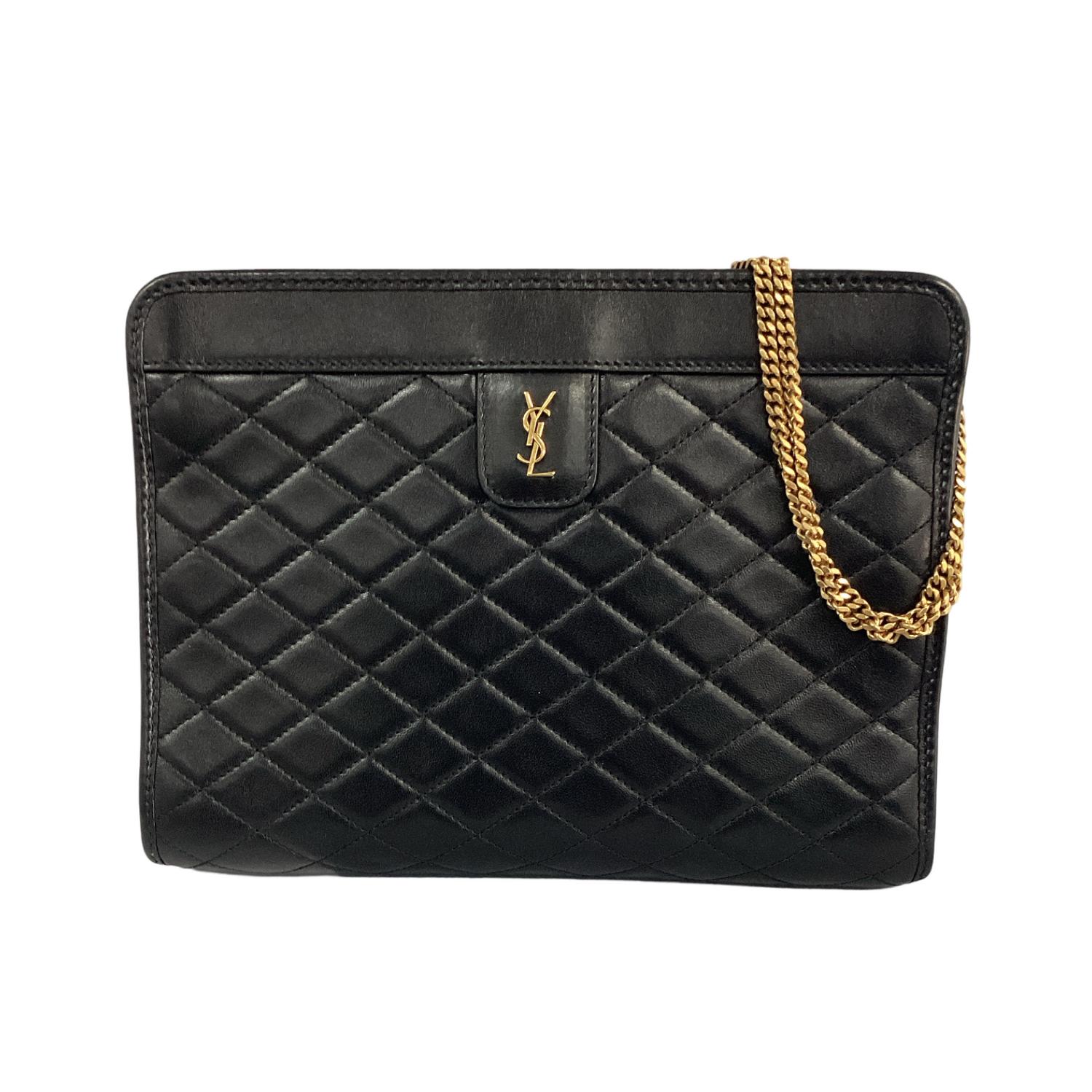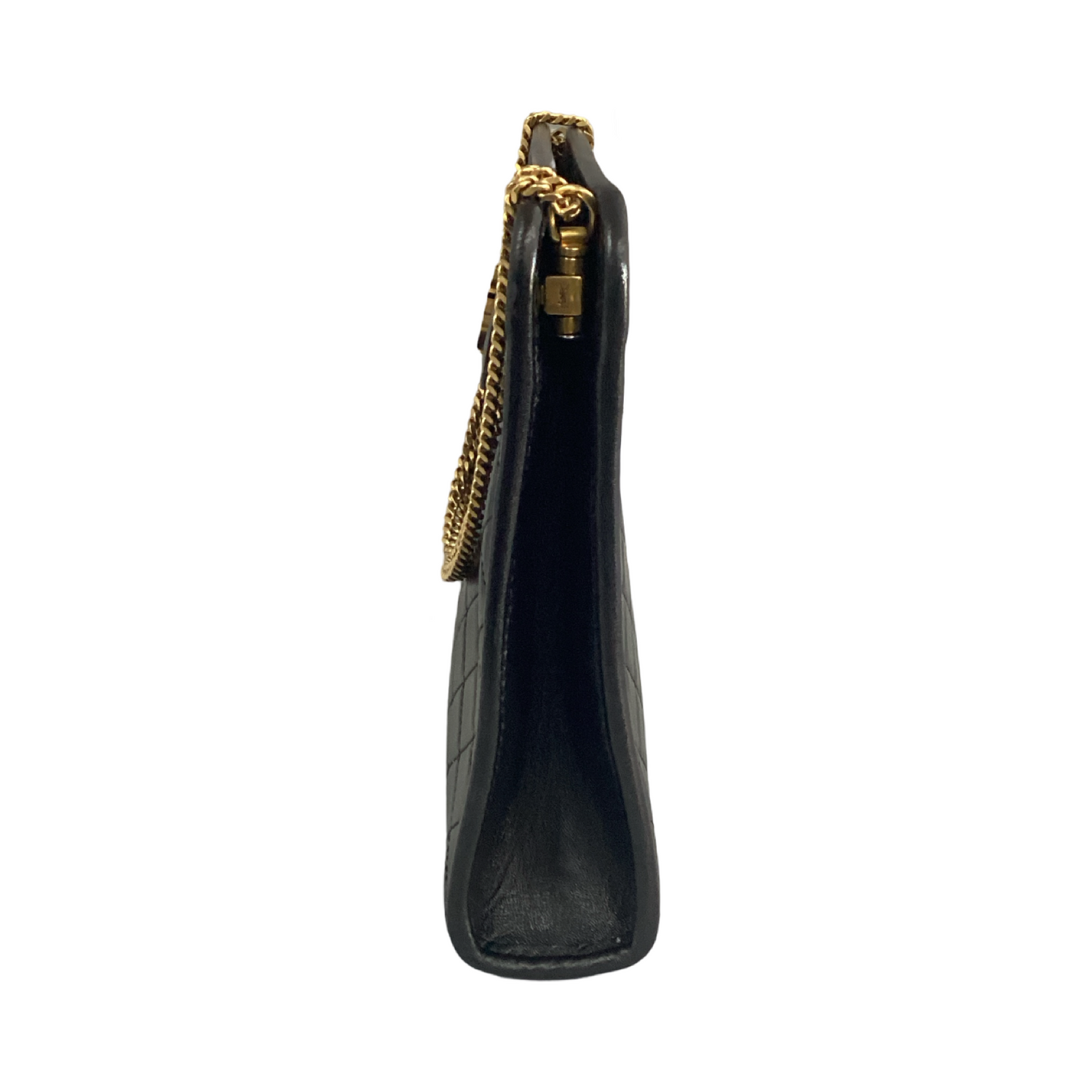 Saint Laurent-Black Victoire Wallet on Chain with gold-toned hardware, elegant wallet on a chain is crafted of lambskin leather in black. The shoulder bag with its versatile chain shoulder strap that can be worn as a clutch, hip length shoulder or as a shoulder bag with a classic gold interlocking YSL front emblem and magnetic top closure. Interior features a black leather interior with a card slot panel.