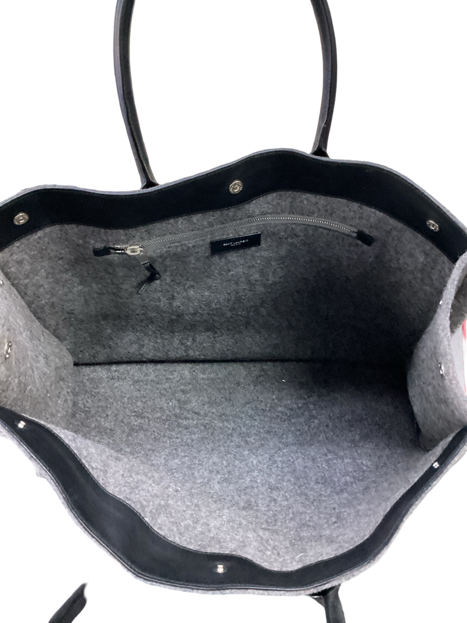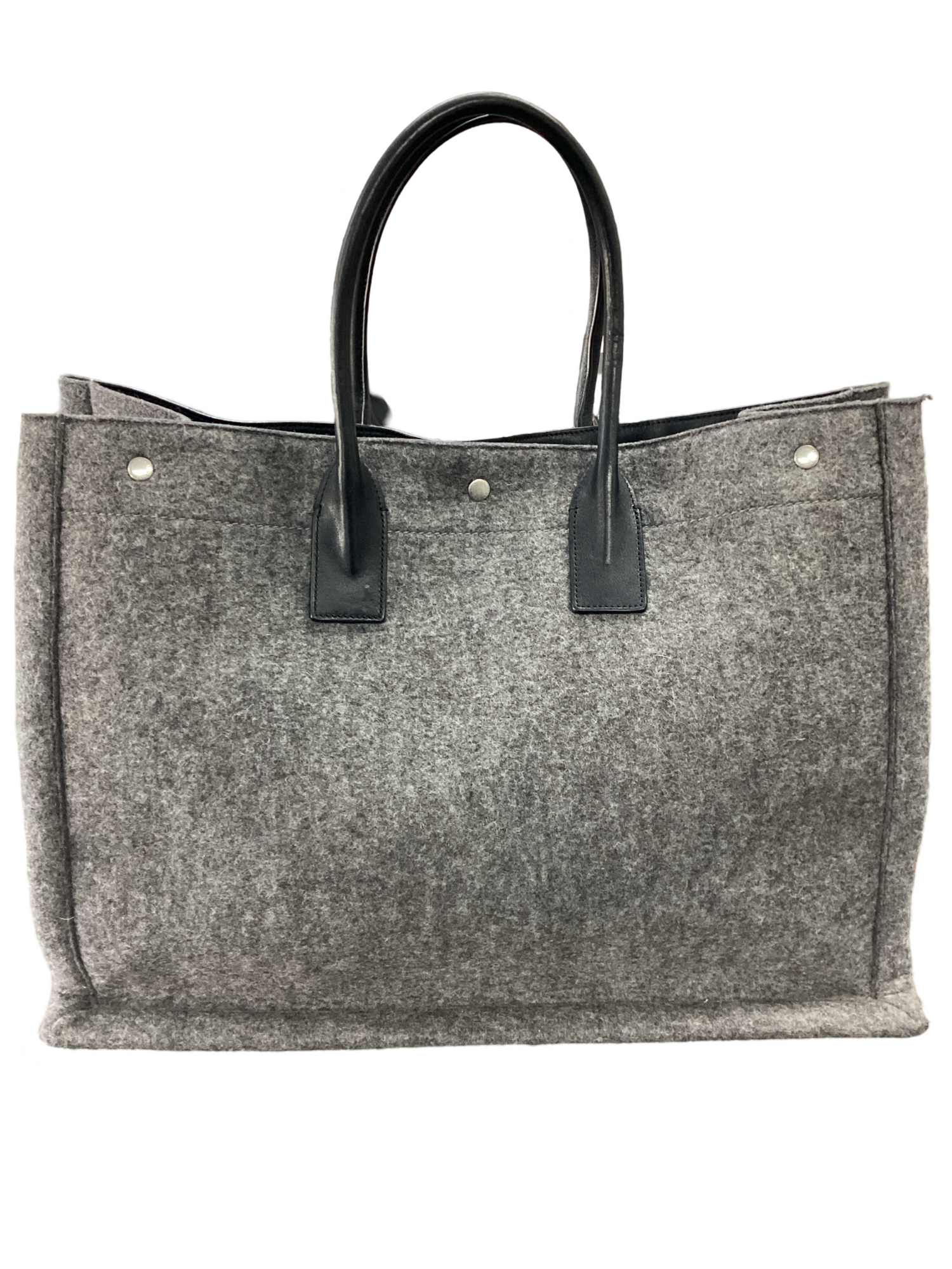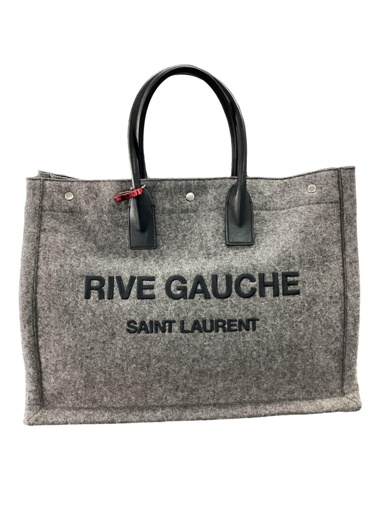 Saint Laurent-Rive Gauche Wool Tote, with silver-tone hardware, grey wool with "Rive Gauche, Saint Laurent" printed in black across the front, black rolled dual leather handle and snap closure. Interior features a matching gray wool interior fabric with a zipper pocket.