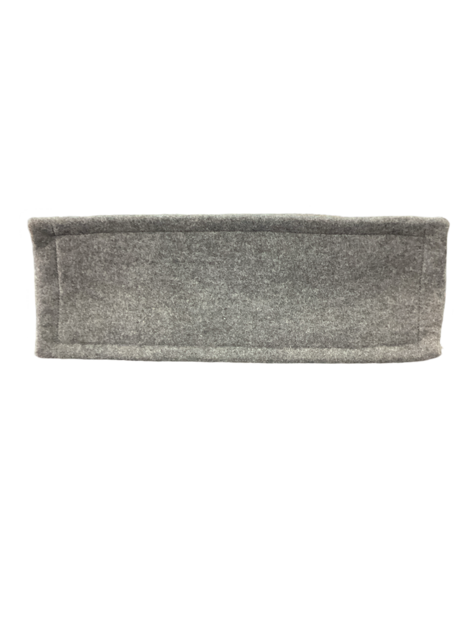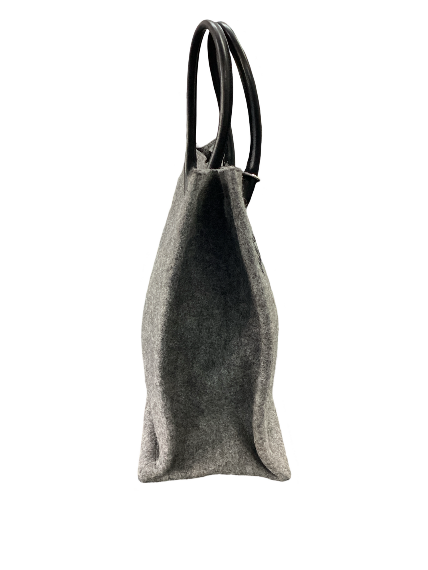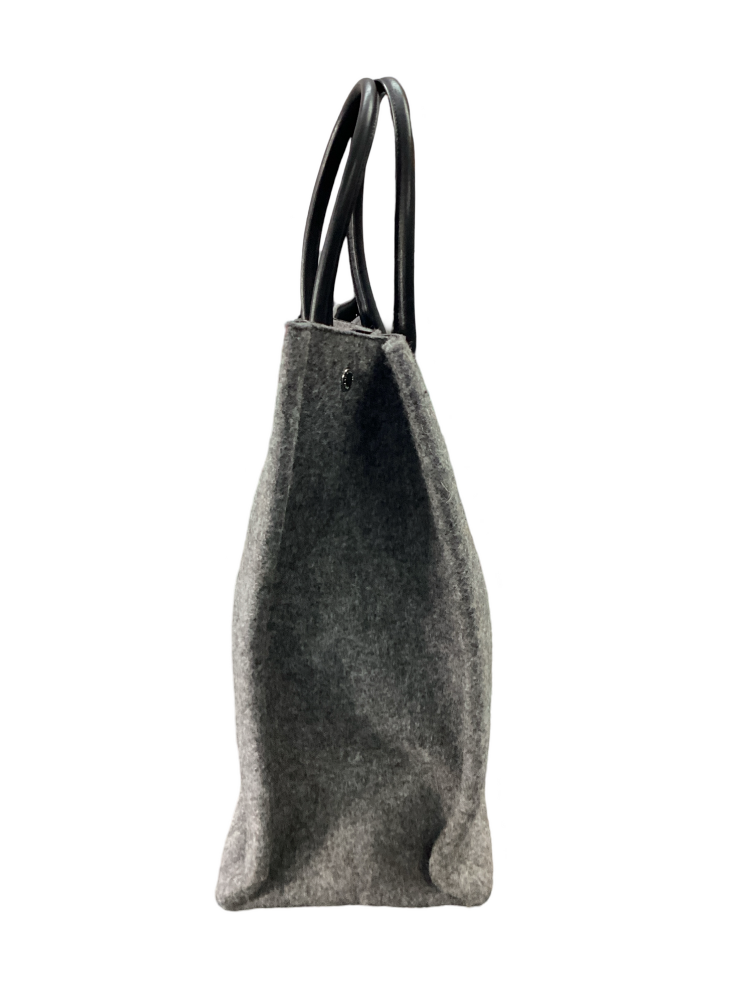 Saint Laurent-Rive Gauche Wool Tote, with silver-tone hardware, grey wool with "Rive Gauche, Saint Laurent" printed in black across the front, black rolled dual leather handle and snap closure. Interior features a matching gray wool interior fabric with a zipper pocket.