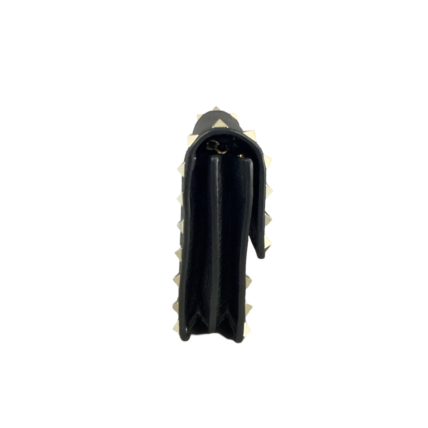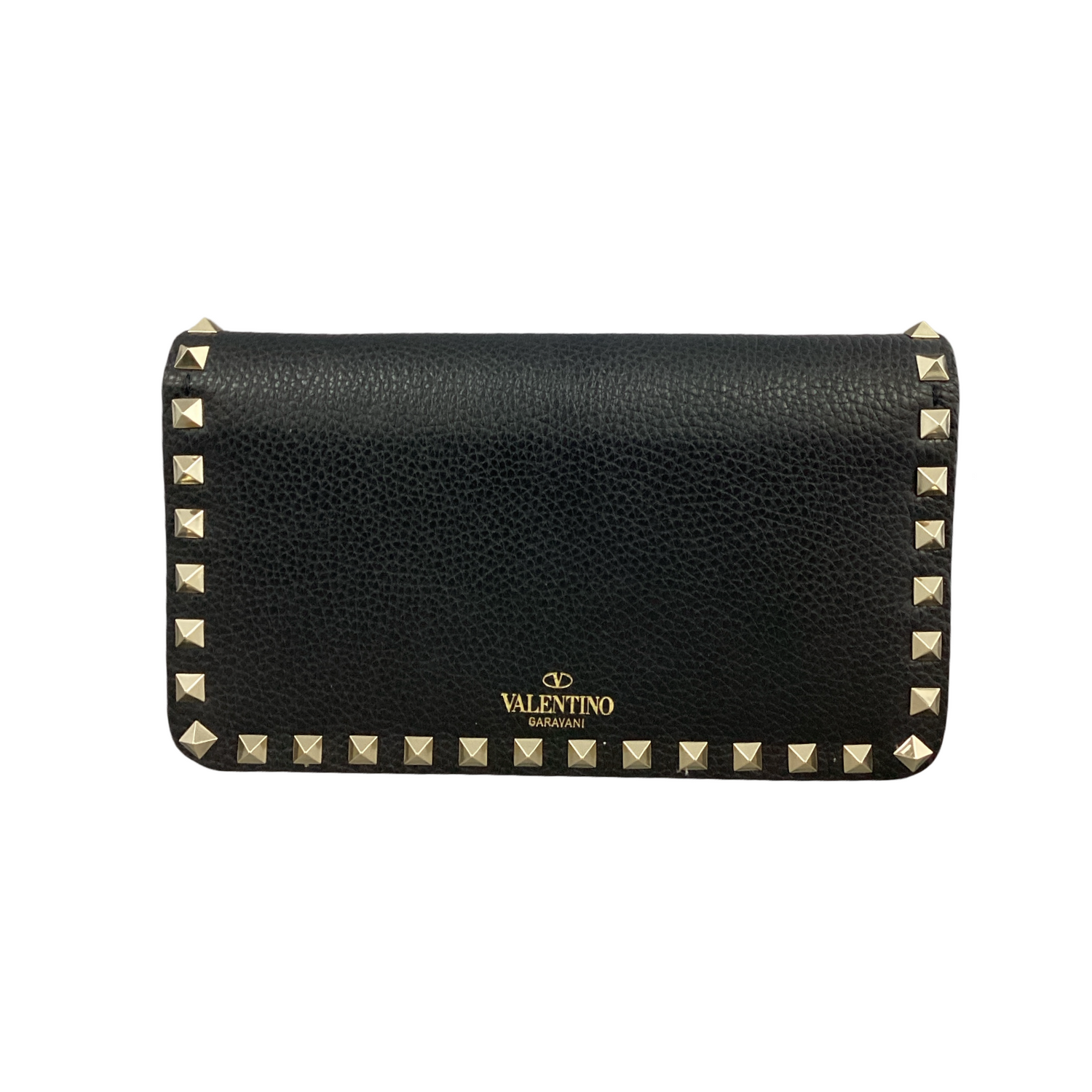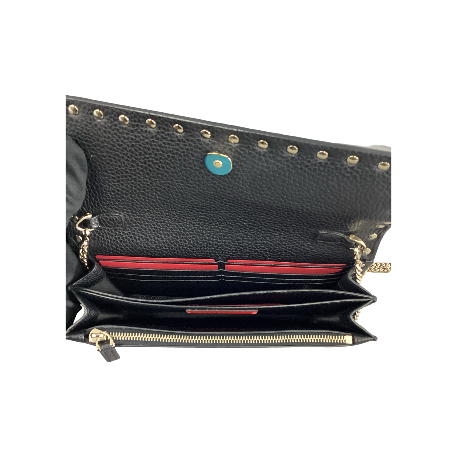 Valentino-Black Rockstud Wallet on Chain with gold-toned hardware, a cross-body bag beautifully crafted of finely textured leather in black, studded borders, a thin detachable chain-link shoulder strap and a front flap closure. Interior features a matching interior with a zipper compartment, middle compartments and 8 card slots.