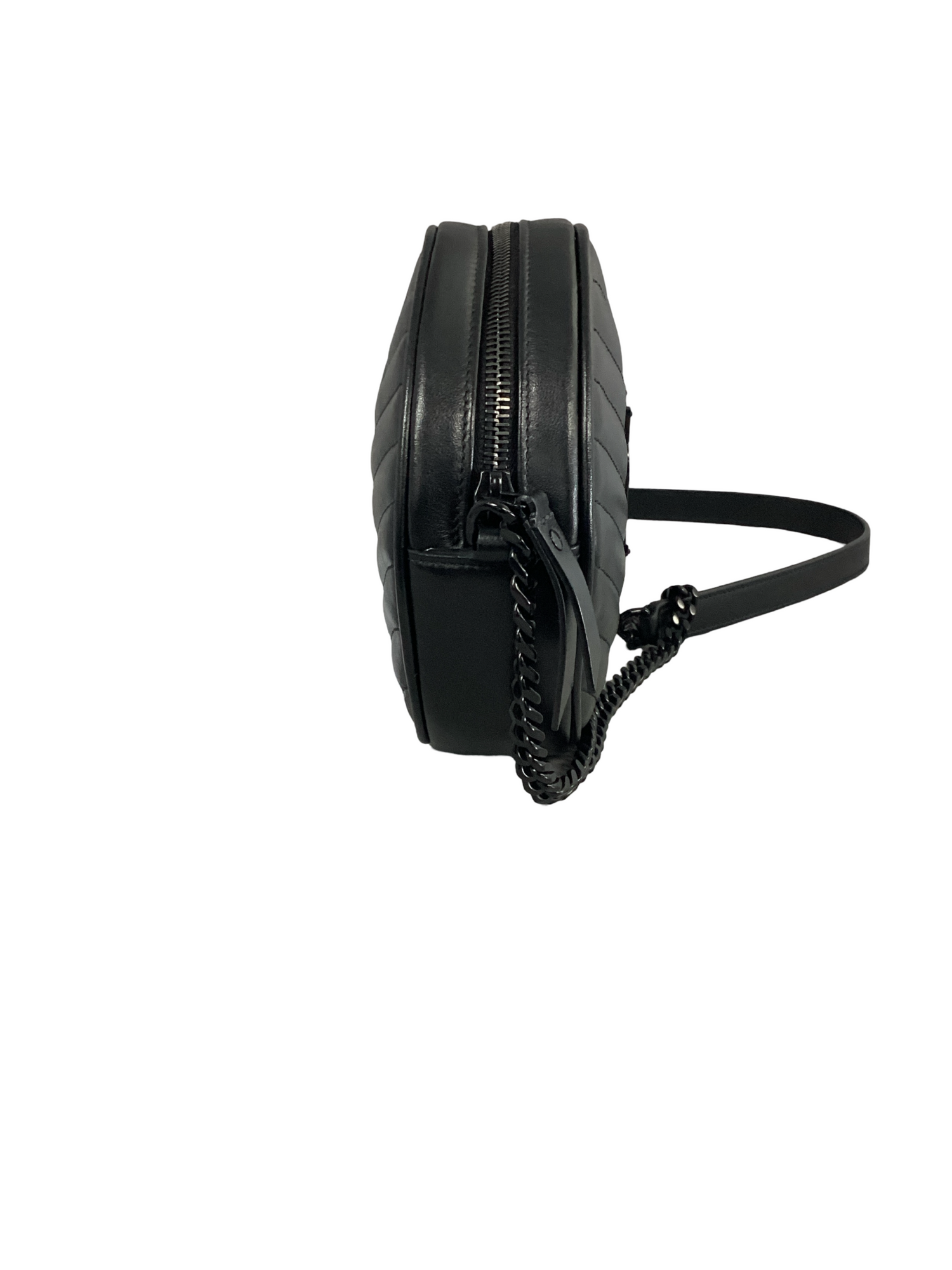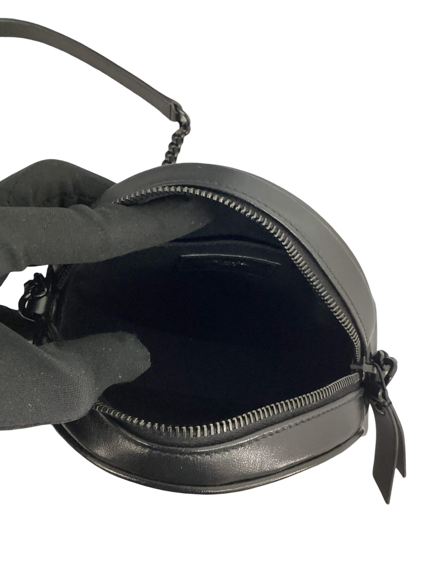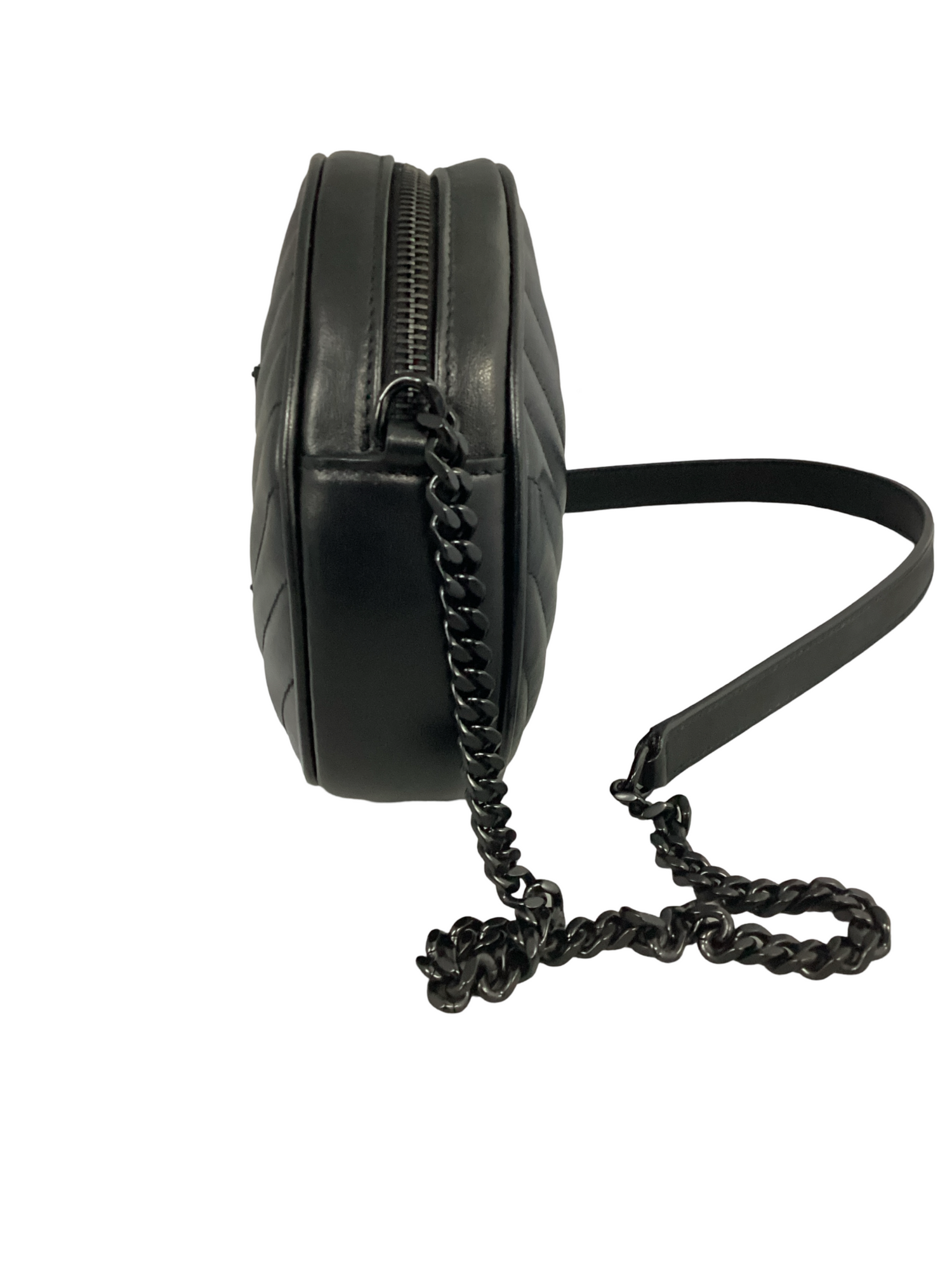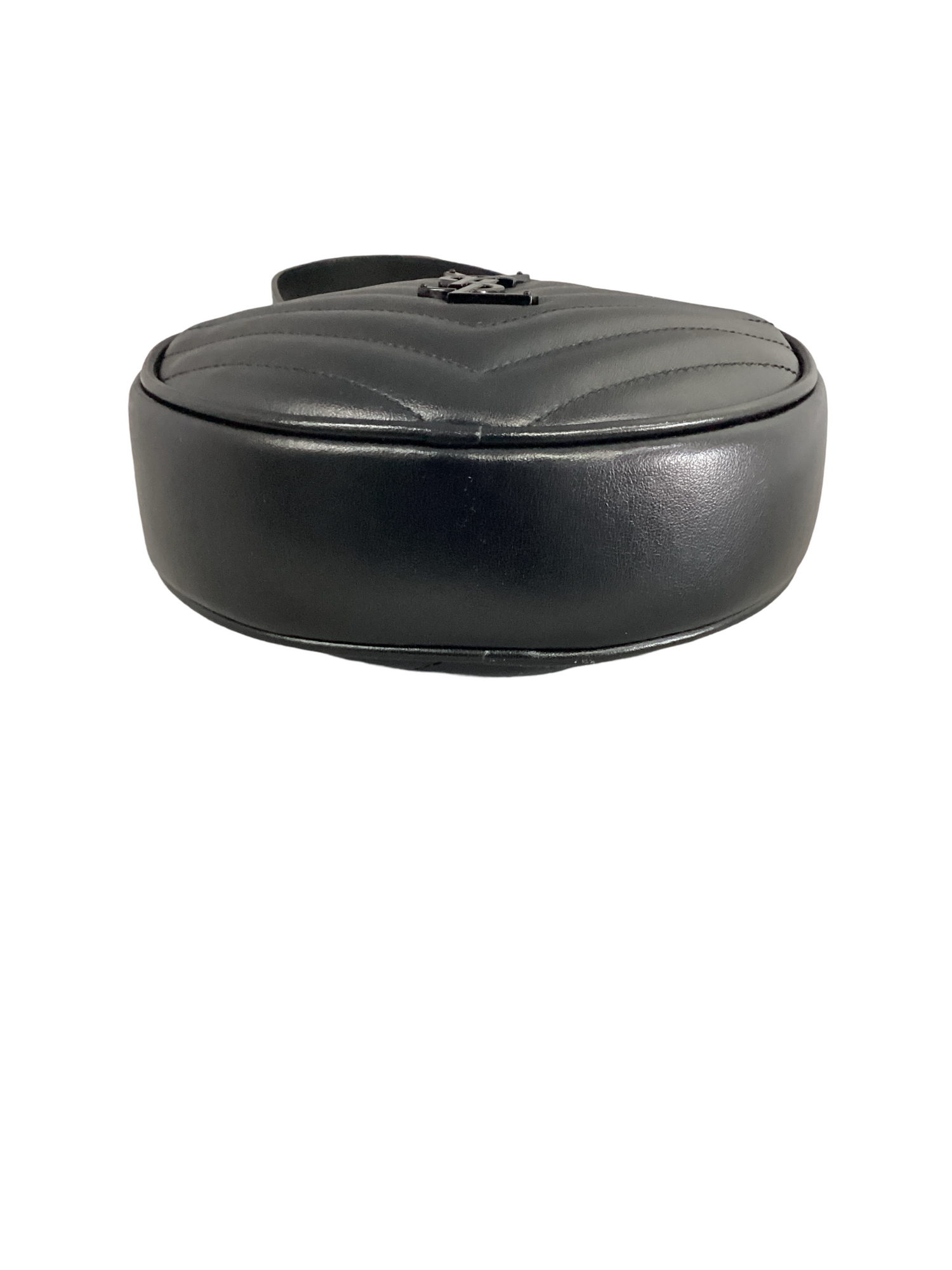 Saint Laurent black leather Chevron Quilted Vinyl Round Camera Bag with black-tone hardware, single shoulder strap, zipper closure. Interior features include black canvas lining, 1 slip pocket.