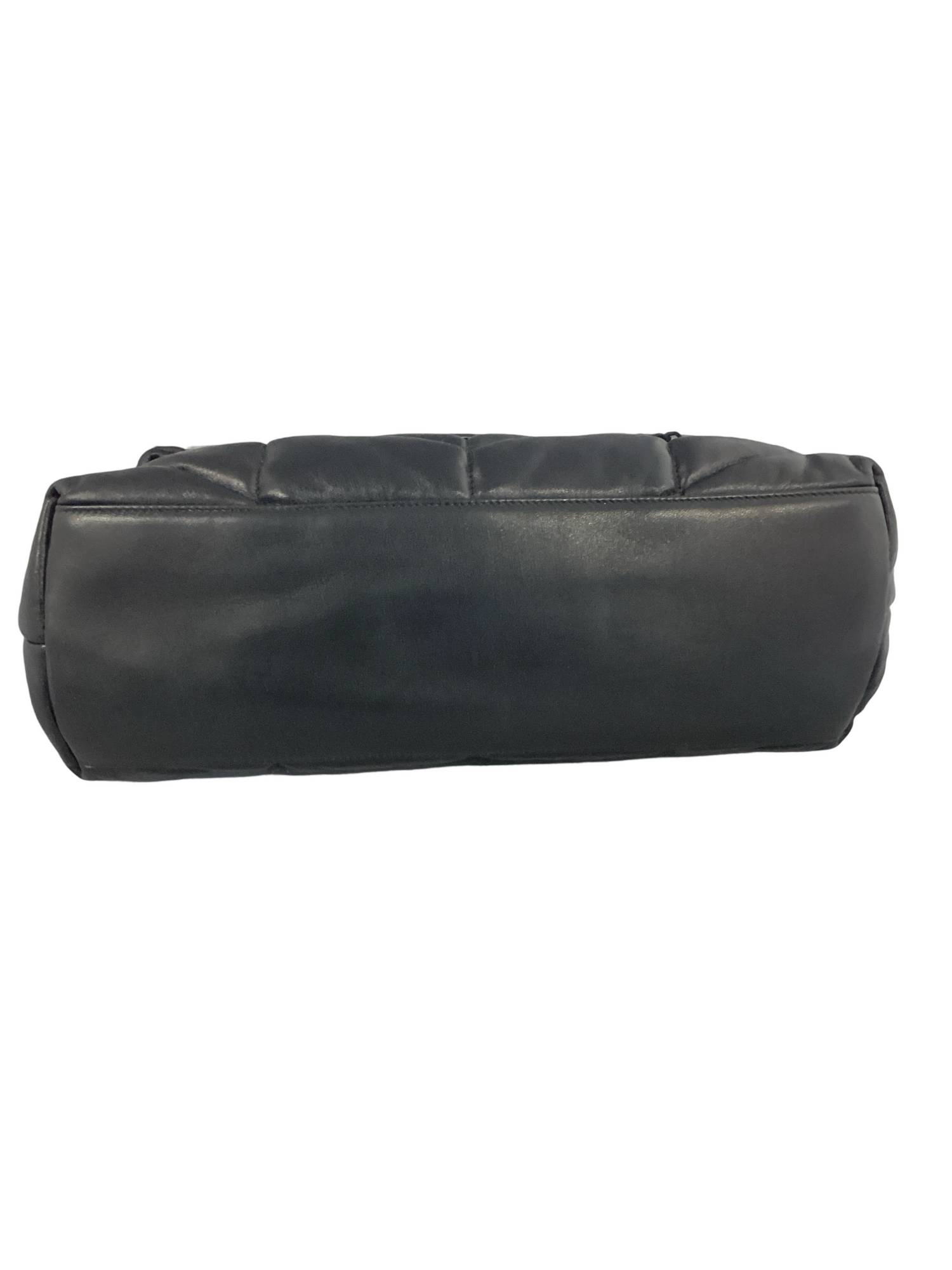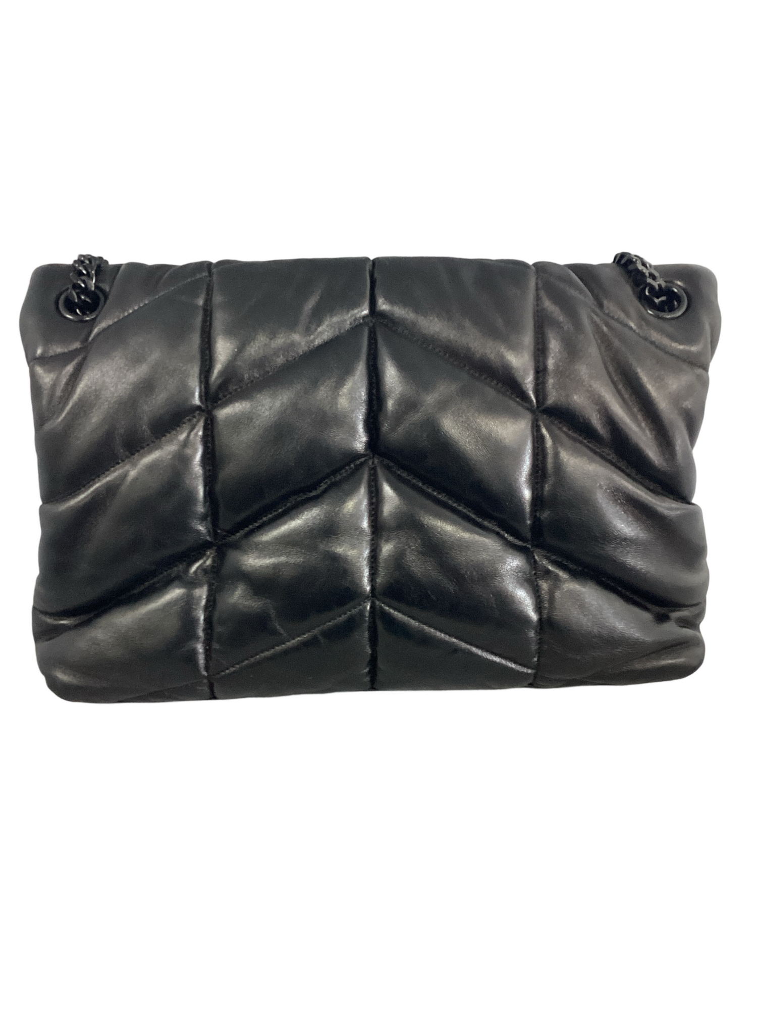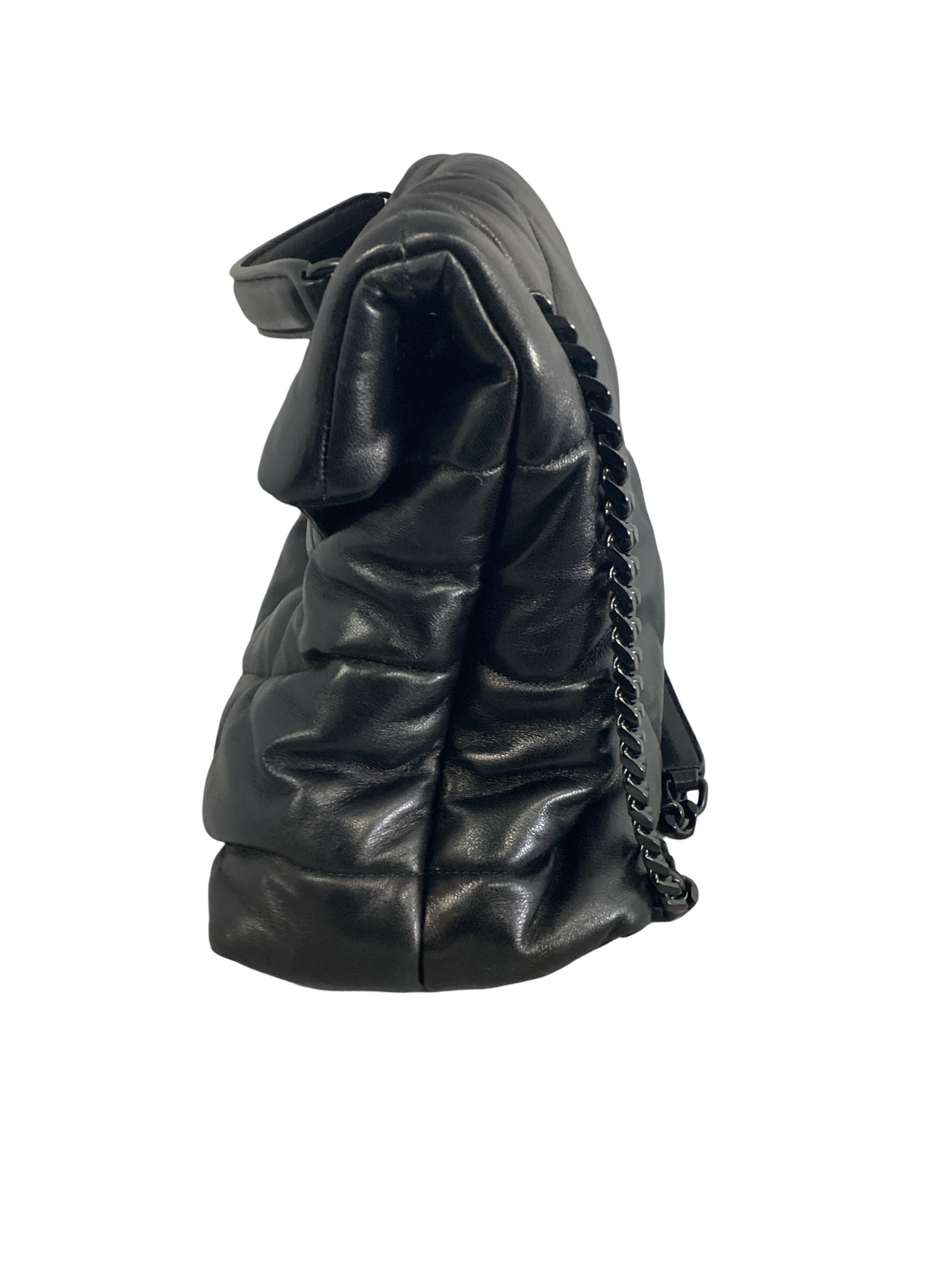 Yves Saint Laurent Medium Loulou Puffer Monogram Chain Satchel with black hardware, a quilted lambskin leather in black, black chain-link shoulder straps with black leather shoulder pads, a front flap snap closure and features a prominent YSL monogram detail. Interior features and a black fabric interior with a zipper pocket.