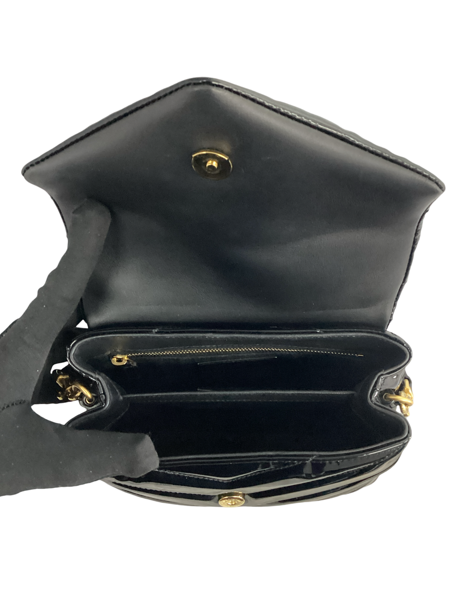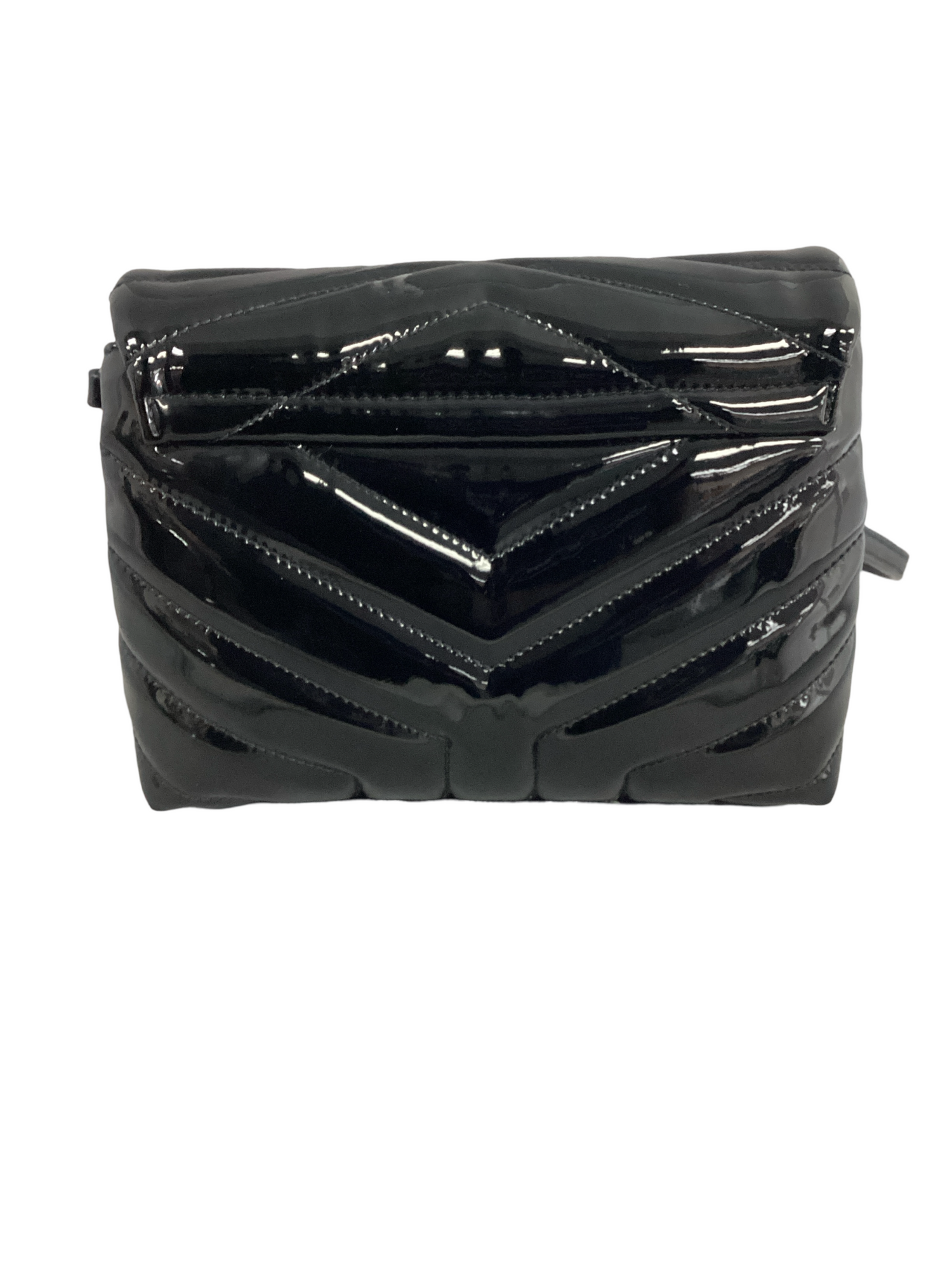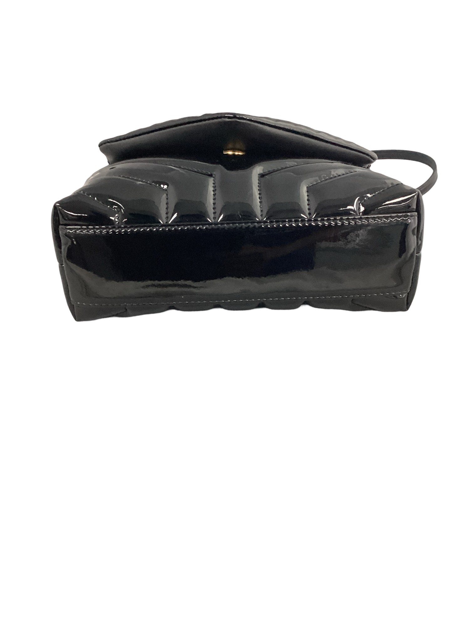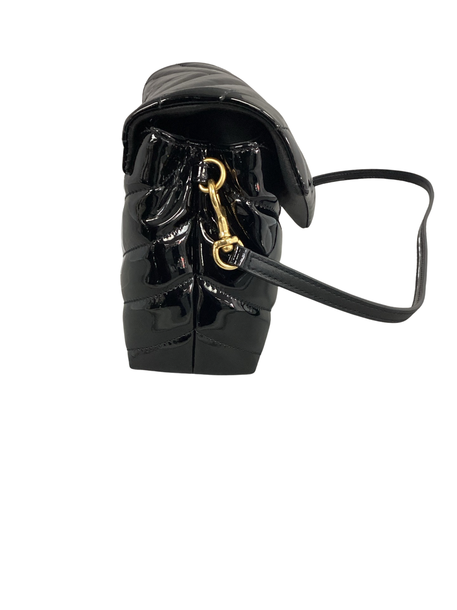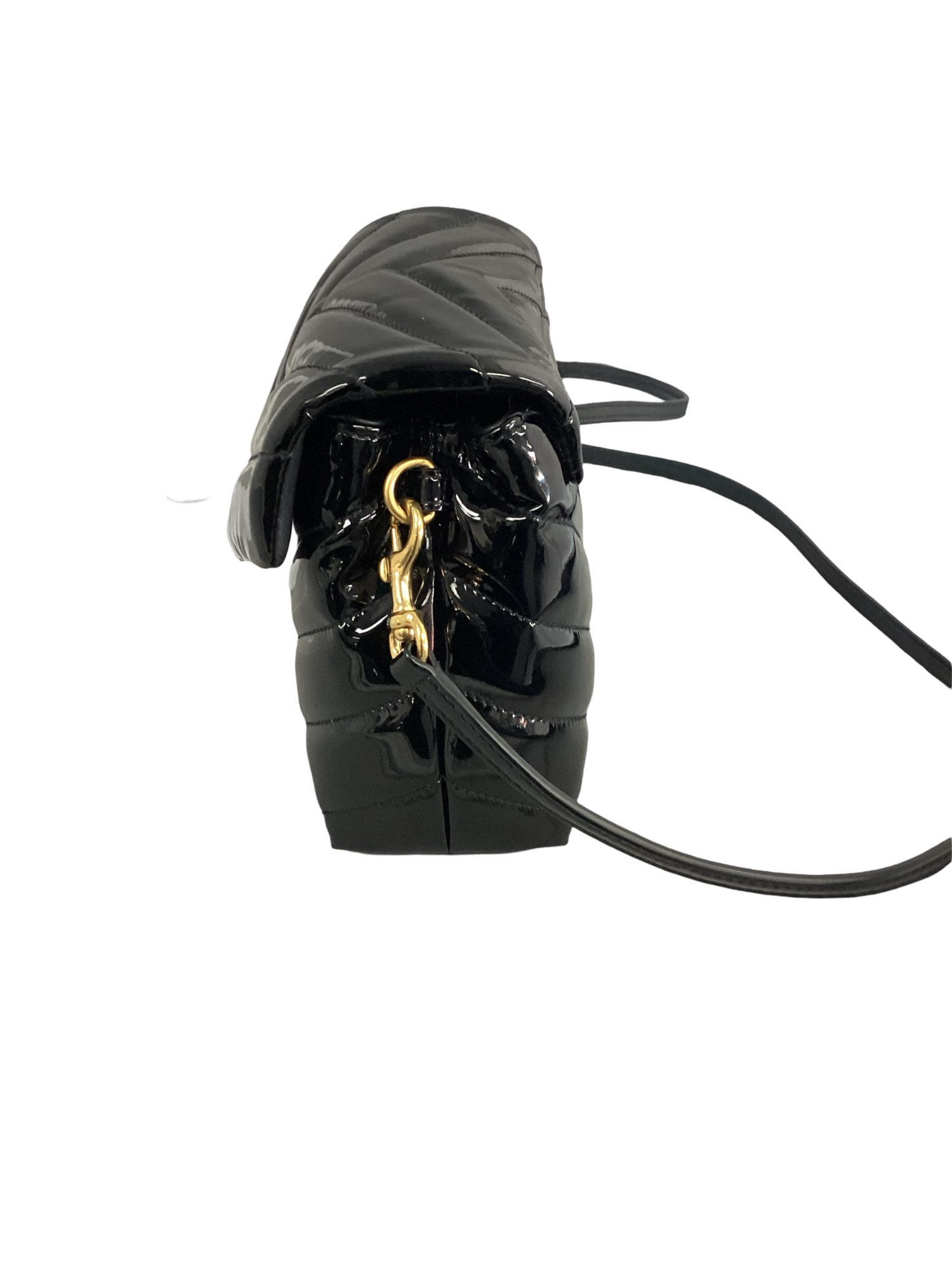Yves Saint Laurent Monogram Matelasse Patent Toy Loulou Crossbody Bag with gold-tone hardware, detachable adjustable crossbody strap, snap closure. Interior features include black fabric lining, 2 compartments, 1 zipper pocket.